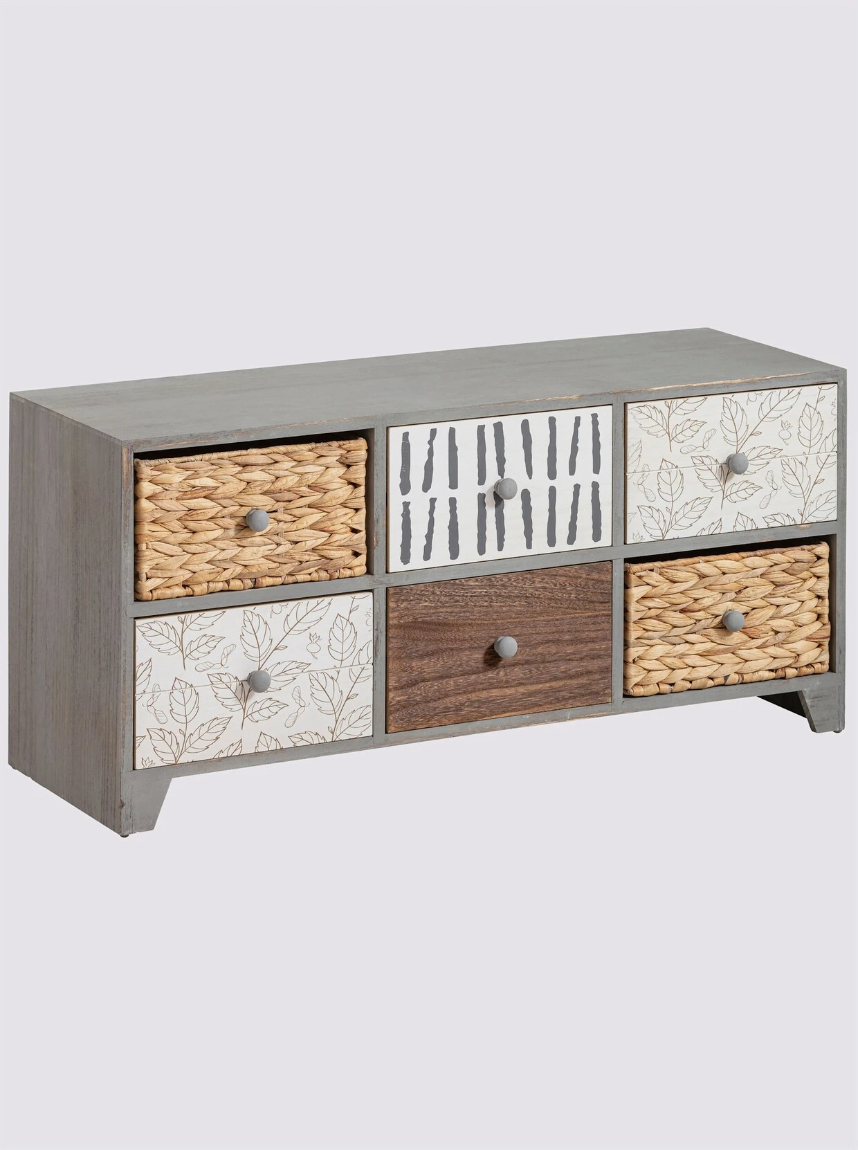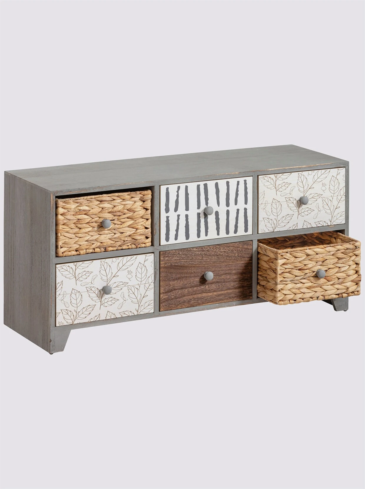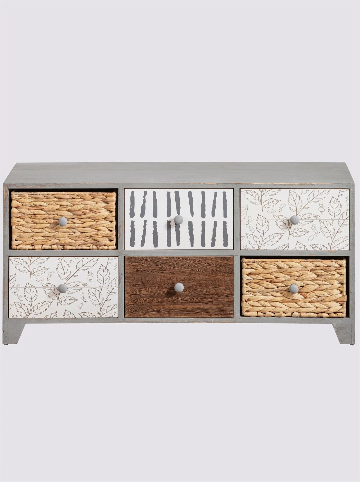 Bank Aus massivem Paulowniaholz aus China, grau gewischt. Rückwand aus MDF-Holzfaserplatte. Mit unterschiedlichen Schubladenfronten und Körben aus Wasserhyazinthe. Knopfgriffe aus Holz. Schubladen auf Holzführung. Aufgebaut.