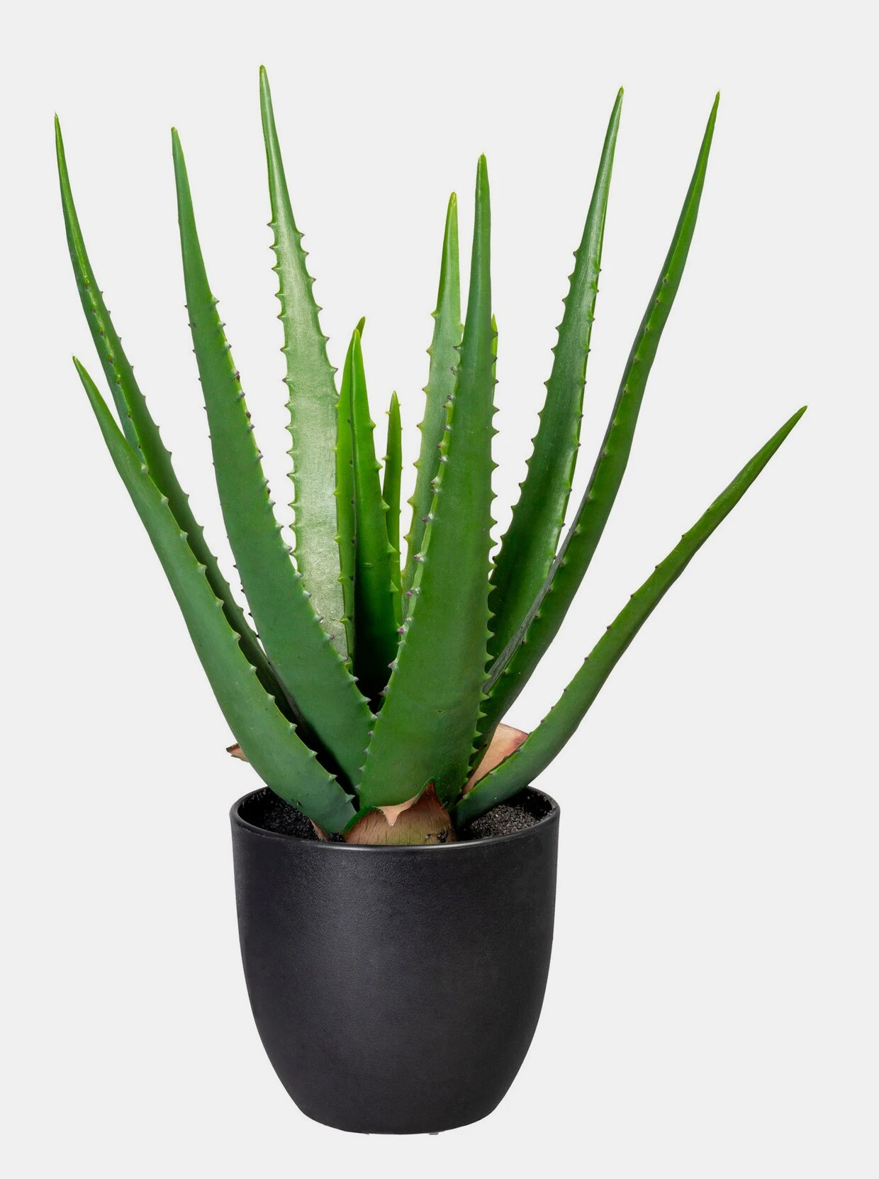 Kunstpflanze Aloe. Täuschend echt und garantiert pflegeleicht! Die Blätter sind detailgetreu dem Original nachempfunden und kaum von diesem zu unterscheiden. Auch die künstliche Erdoberfläche trägt zu dem naturnahen Aussehen bei. Aus hochwertigem Kunststoff gefertigt. Im schwarzen Kunststofftopf.