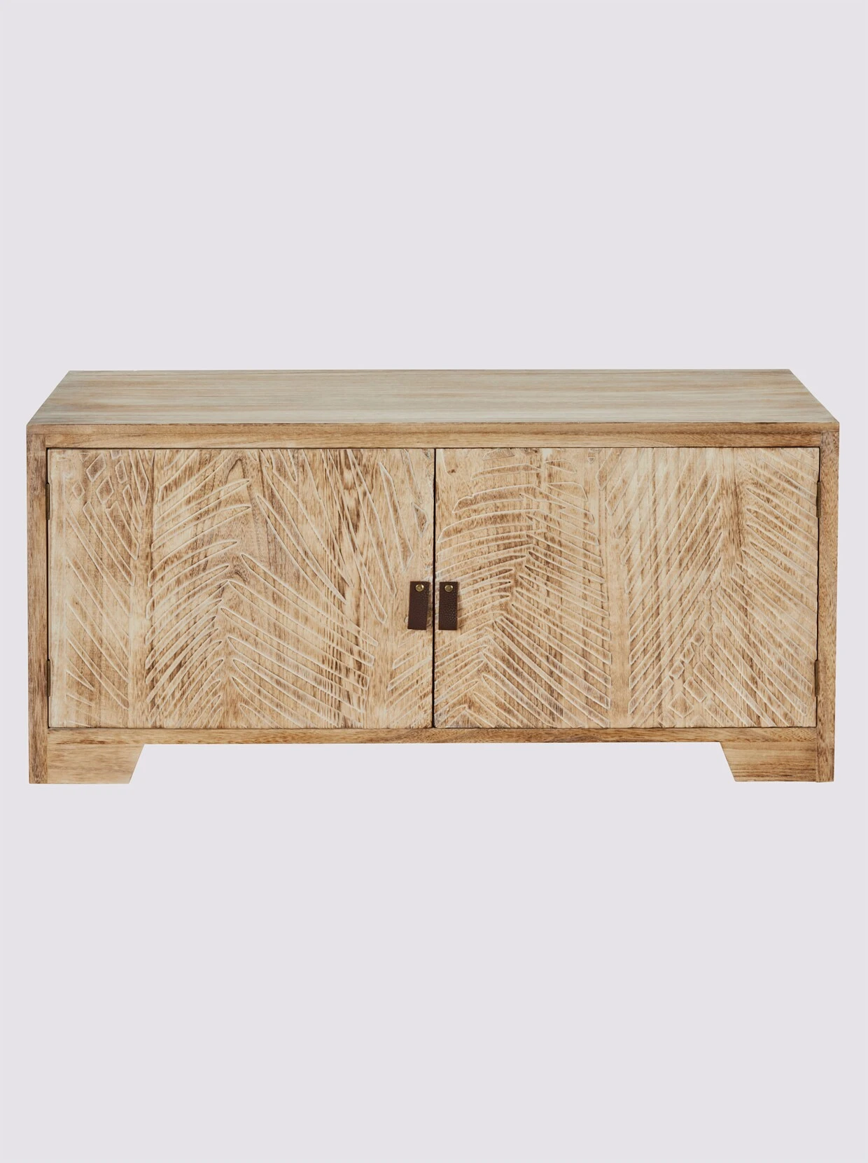Bank Ein Hingucker in jedem Raum. Mit dekorativen Blättermotiven in 3-D-Optik. Aus massivem Paulowinaholz aus China. Griffe aus Lederimitat. Hinter den Türen 1 fester Zwischenboden. 4 Fächer je H/B/T ca. 16,5/47,5/38 cm. Aufgebaut.
