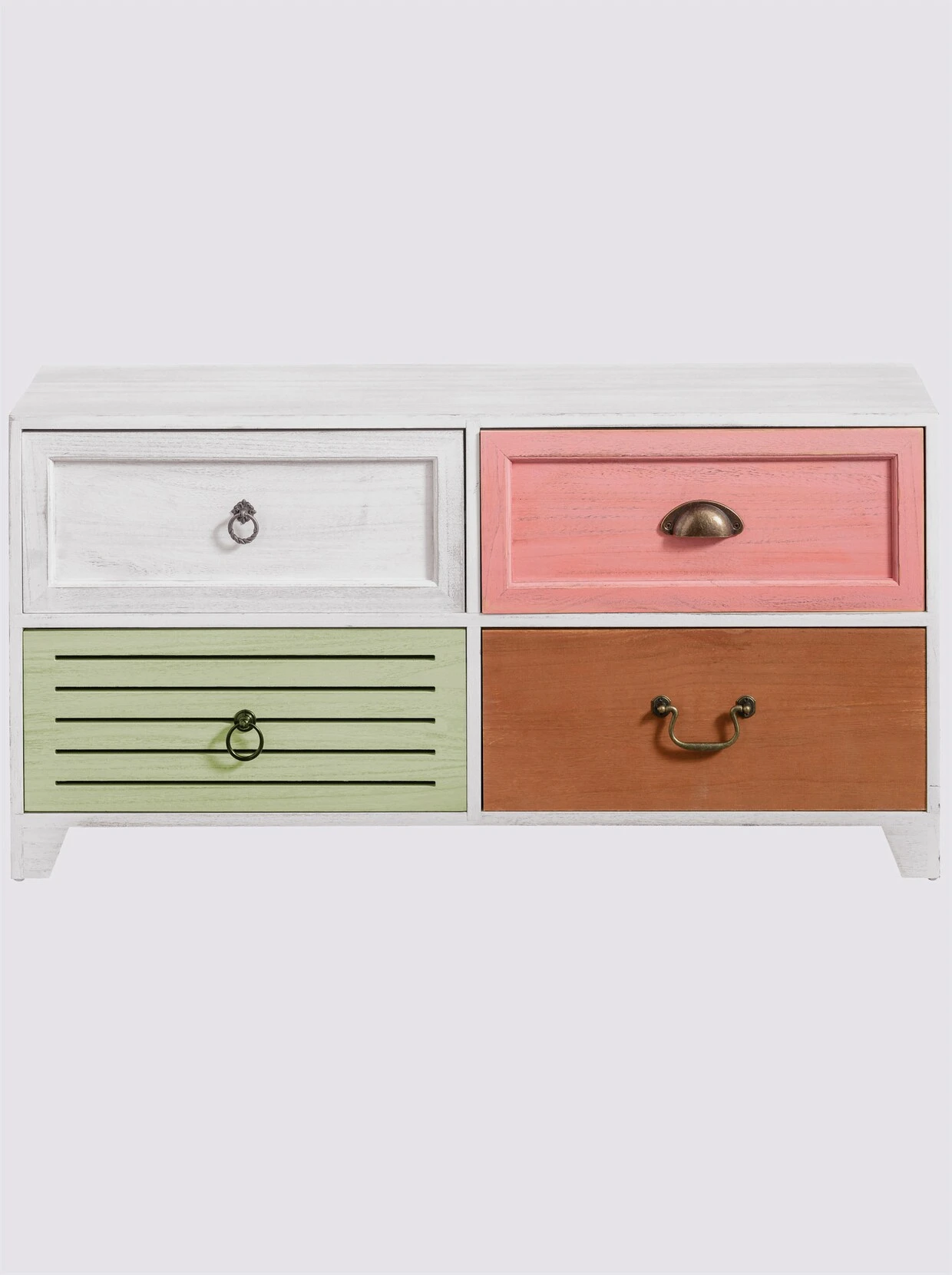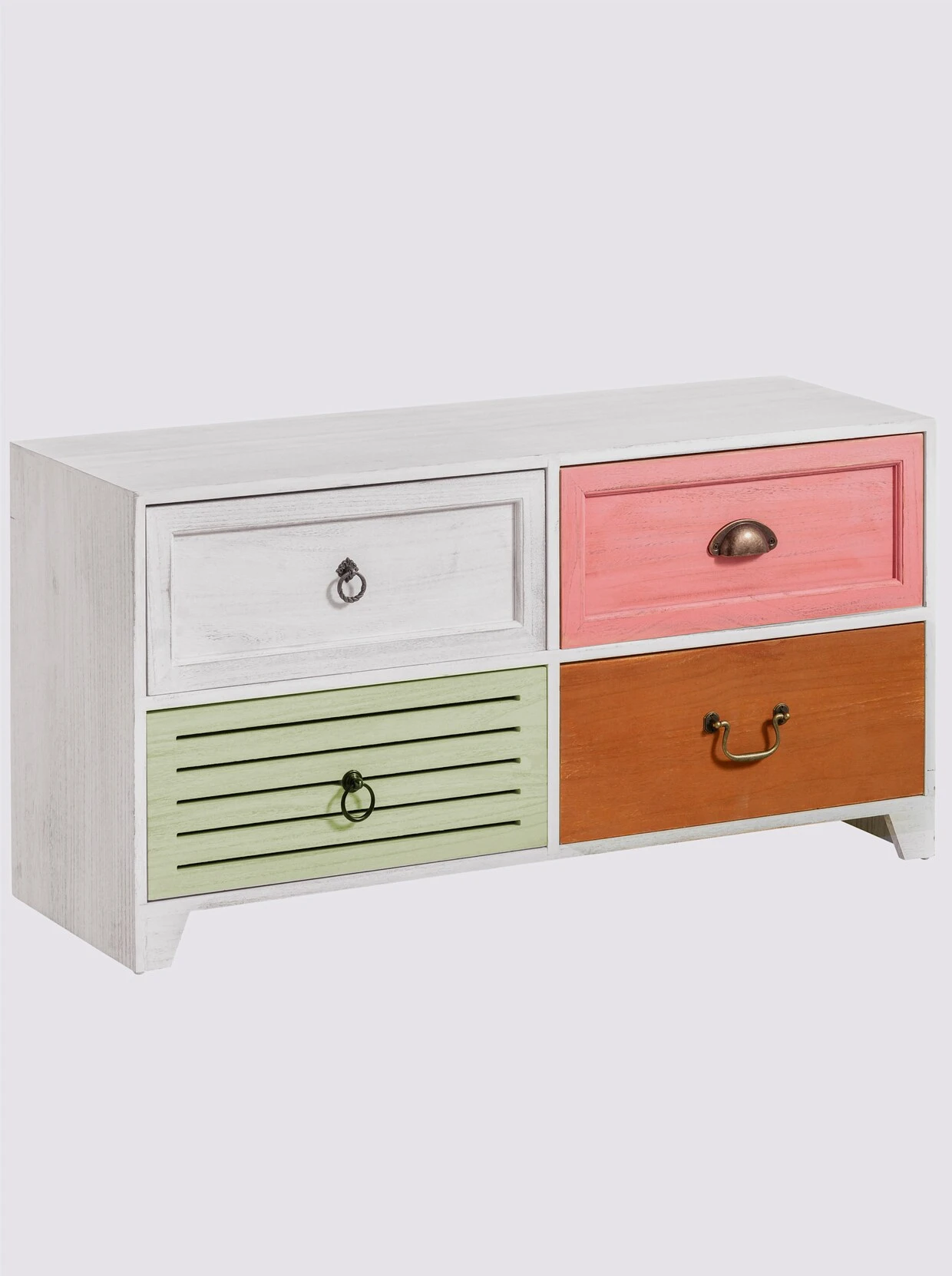 Bank Aus massivem Paulowniaholz aus China und MDF. Korpus weiß gewischt. Schubladen auf Holzführung mit unterschiedlichen Fronten und Metallgriffen, Innenmaß H/B/T je ca. 16,5/41/23 cm. Aufgebaut.