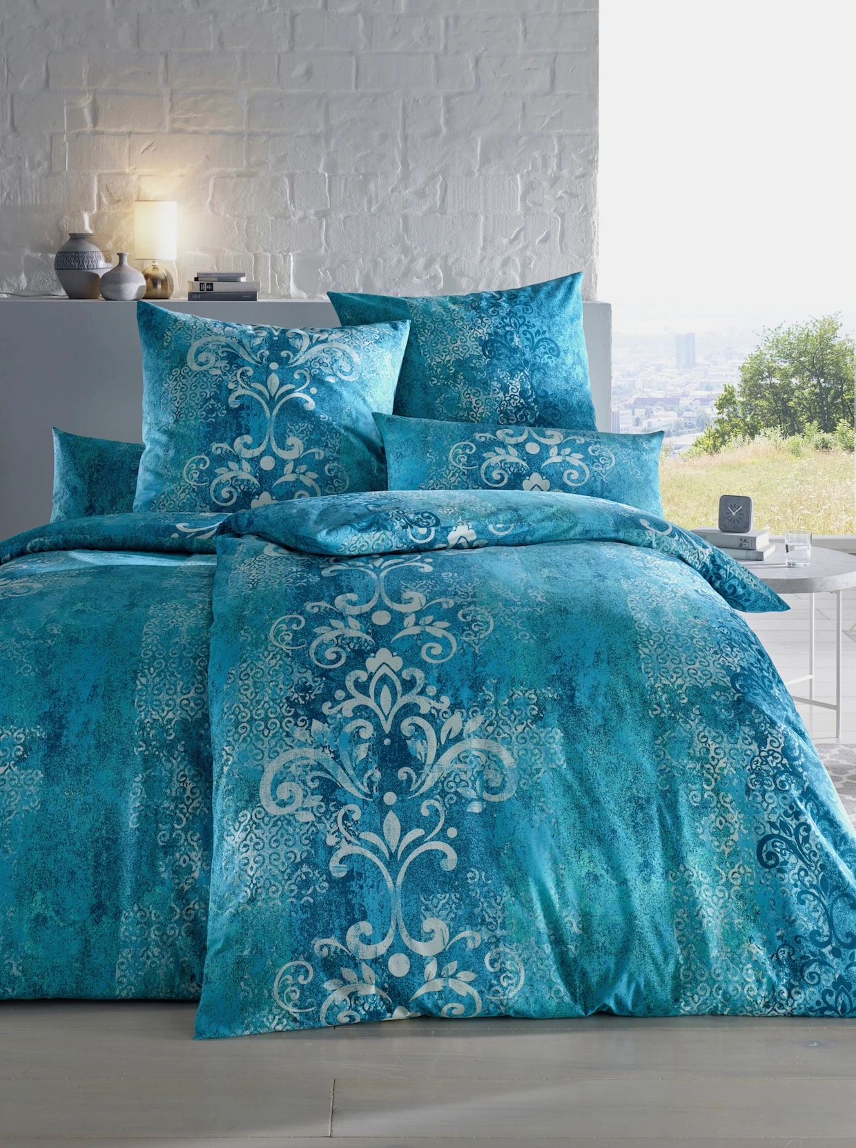 Bettwäsche Große Ornamente auf einem dezent marmorierten Untergrund. Reine Baumwolle in Makosatin-Qualität. Mit Knopfverschluss. Garnitur: 1 Bettbezug und 1 Kissenbezug.