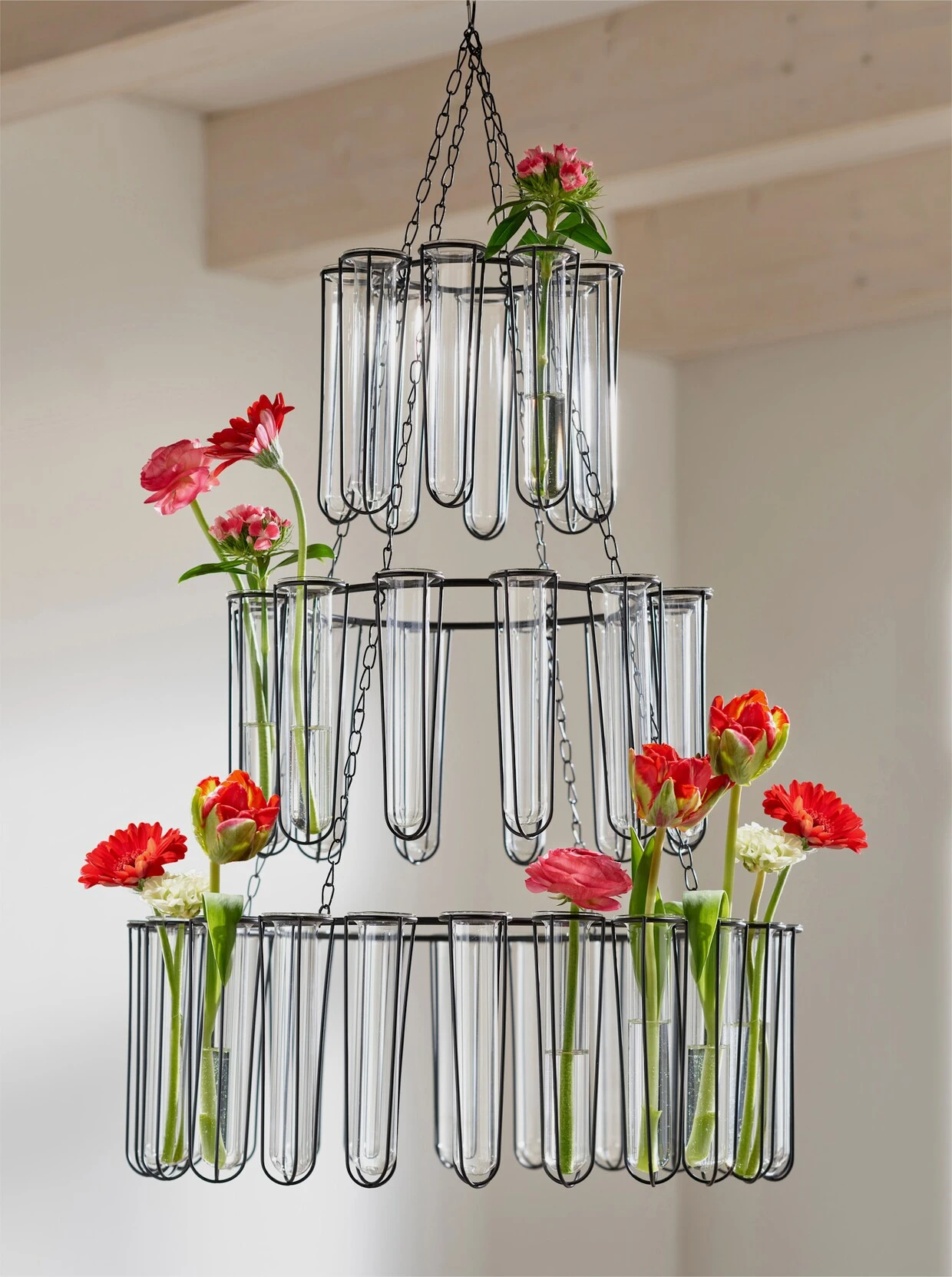 Blumenampel Aus Metall, schwarz lackiert. Mit 42 Glaskolben in 3 Ringen angeordnet. Kettenaufhängung. Für Frisch- und Trockenblumen geeignet.