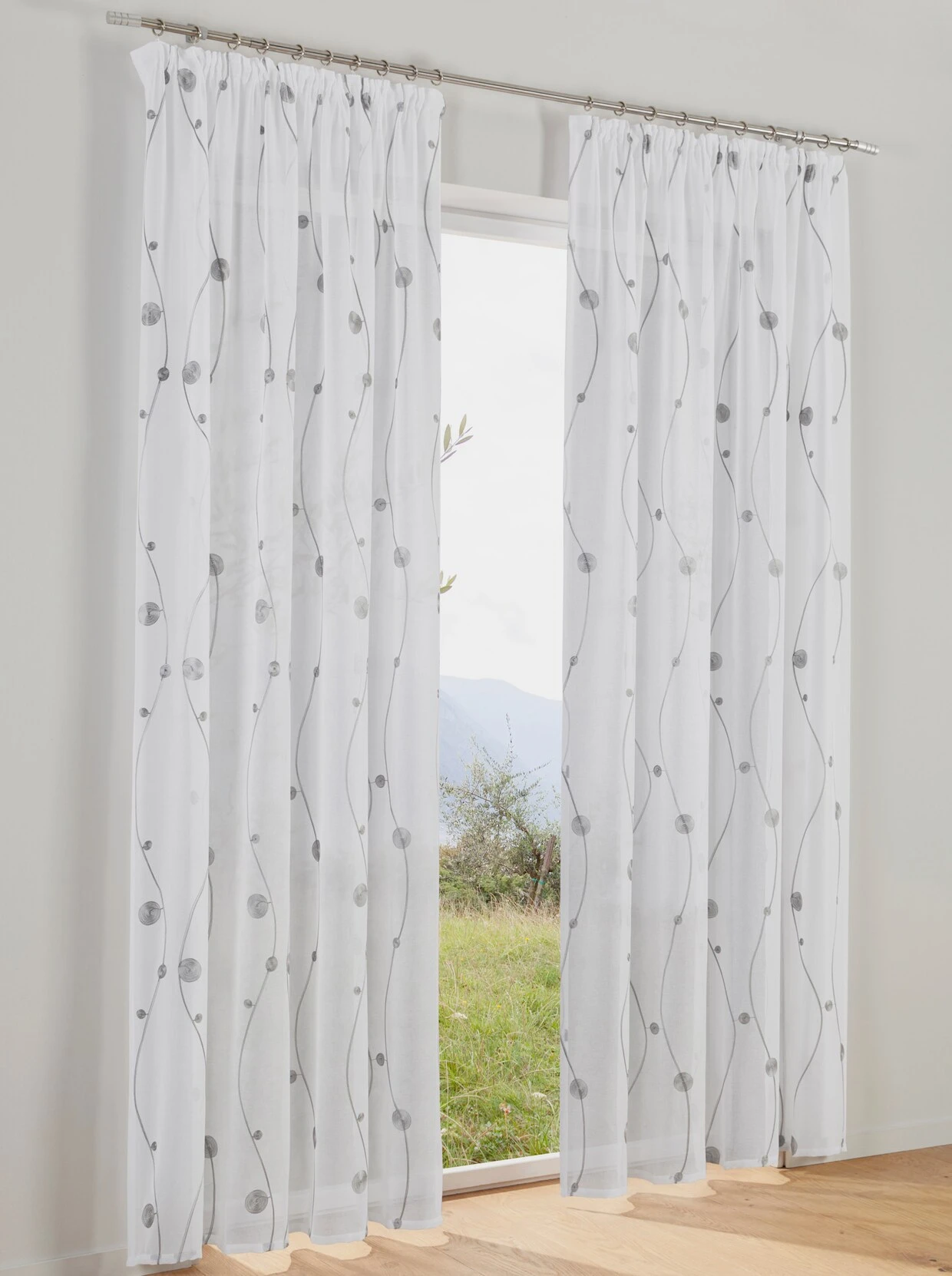 Dekostore Mit grauen gestickten Ornamenten. Gewebte Ware. Transparent.