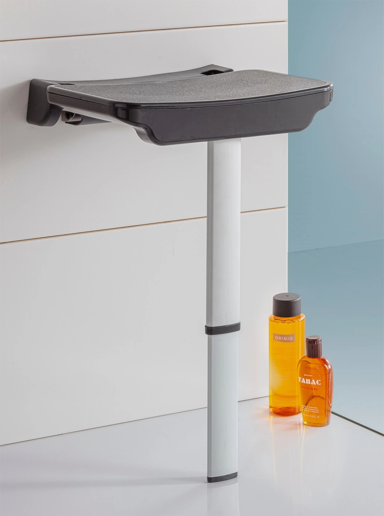 Dusch- und Badesitz Aus stabilem Kunststoff und Aluminium. Rostfrei. Rutschhemmende, strukturierte Sitzfläche in optimaler Größe. 4-fach verstellbarer rutschhemmender Fuß. Platzsparend klappbar. Belastbar bis ca. 120 kg. TÜV getestet und TÜV/GS zertifiziert. Selbstmontage.