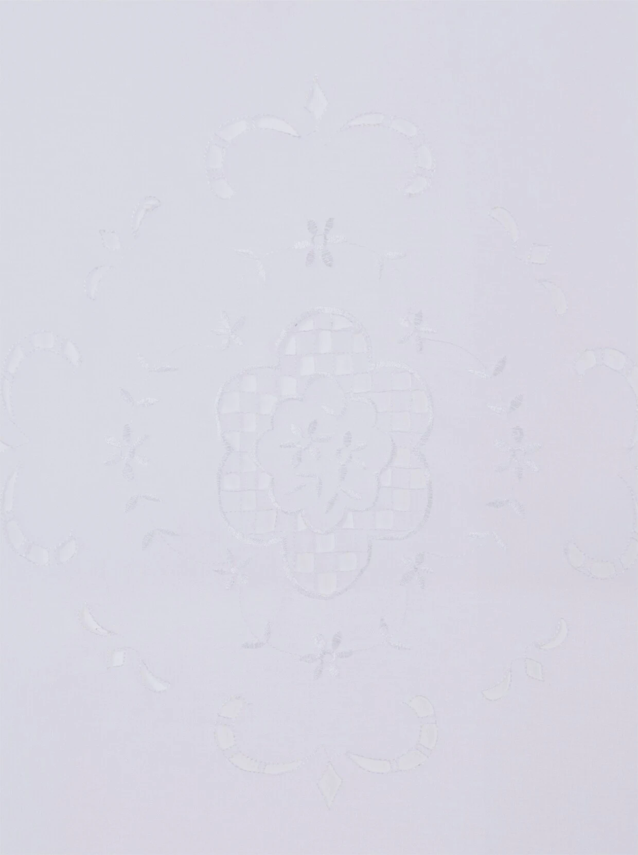 Fenster- und Türbehang In Leinenstruktur mit hochwertigem Lochstickereimotiv und Häkelbortenabschluss. Oben mit Tunnel für Stangendurchschub. Halbtransparent.
