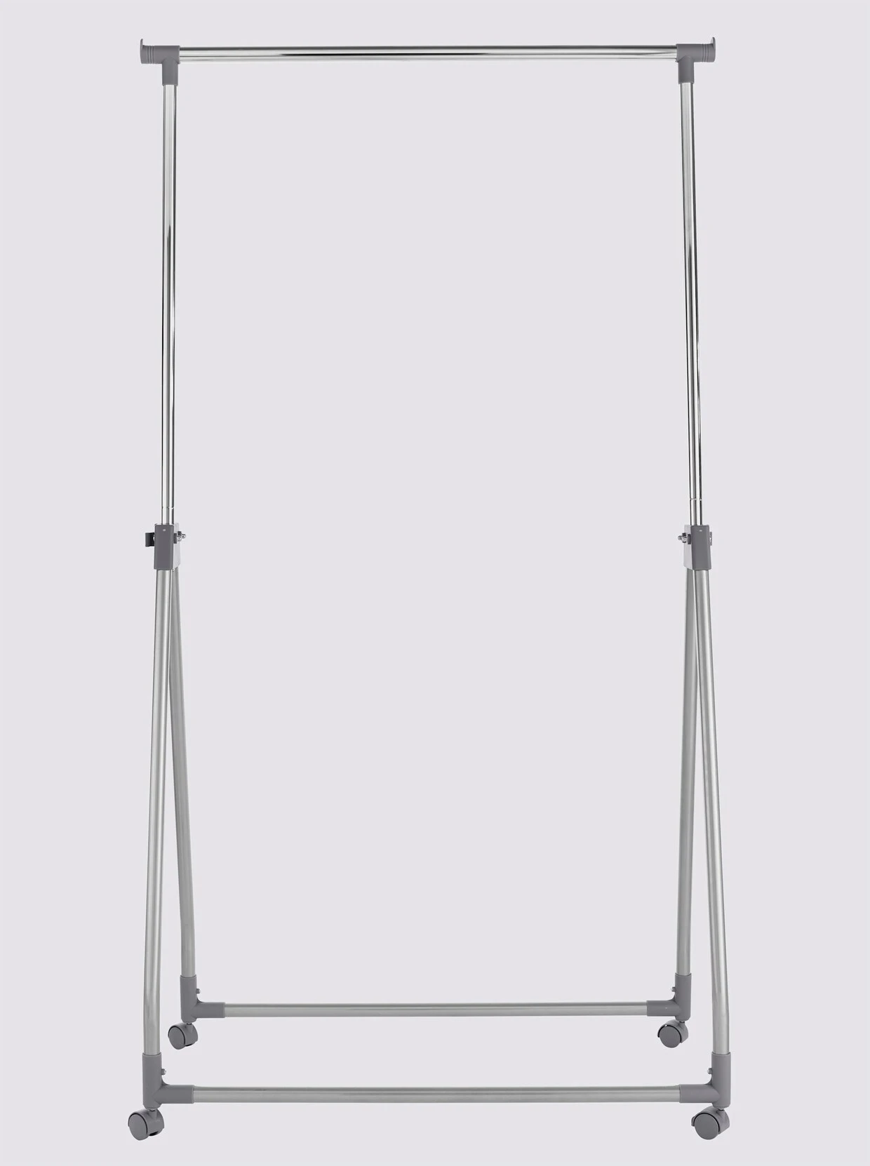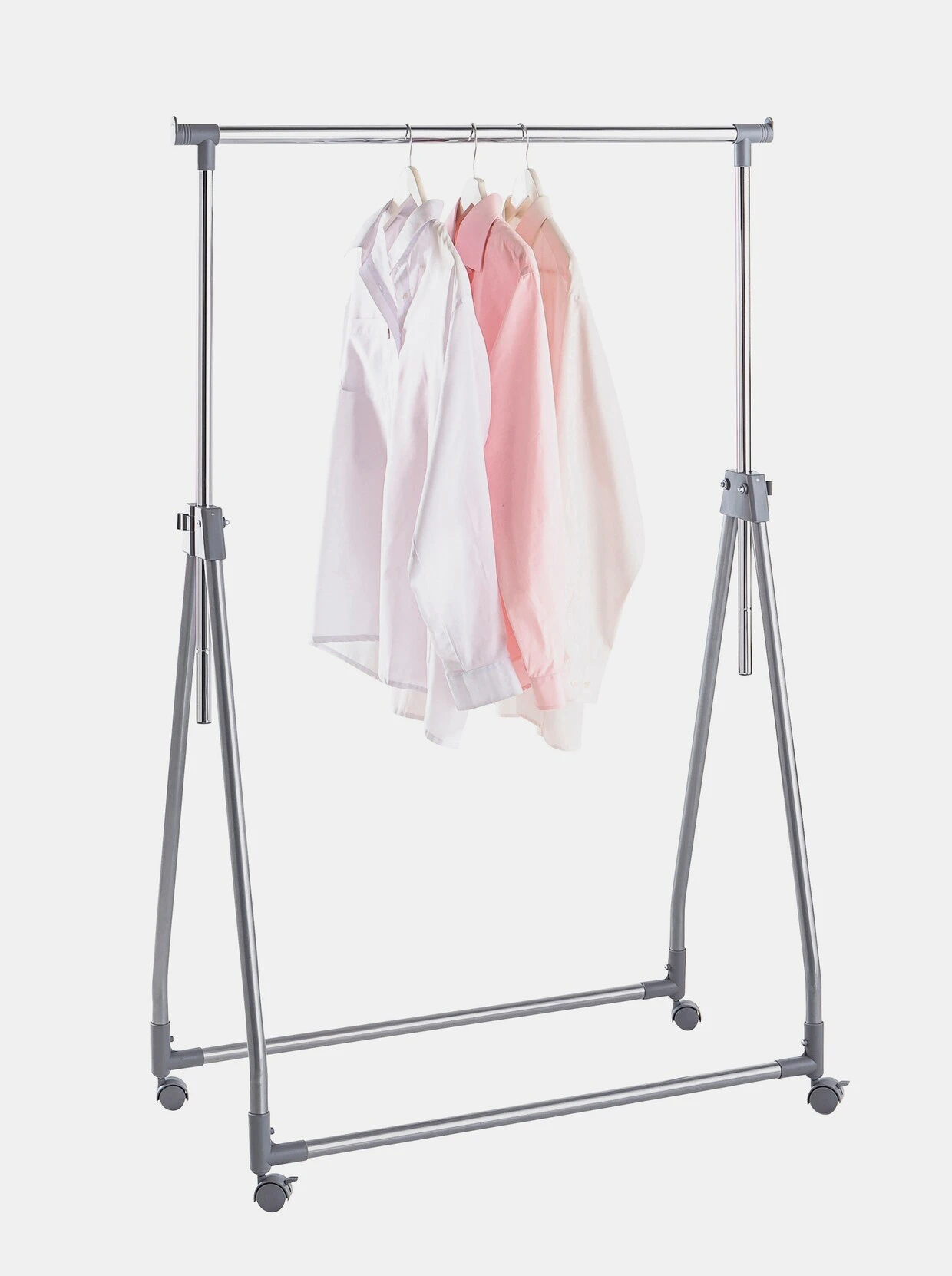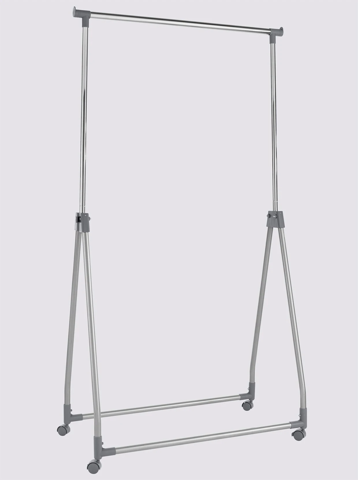 Garderobenständer Praktischer Kleiderständer zum Aufbewahren, Lüften und Transportieren von Kleidung. Mit 4 Rollen zum leichten Fortbewegen, davon 2 arretierbar. Mit 1 stufenloser höhenverstellbarer Kleiderstange. Extra schmal zusammenklappbar. Selbstmontage.
