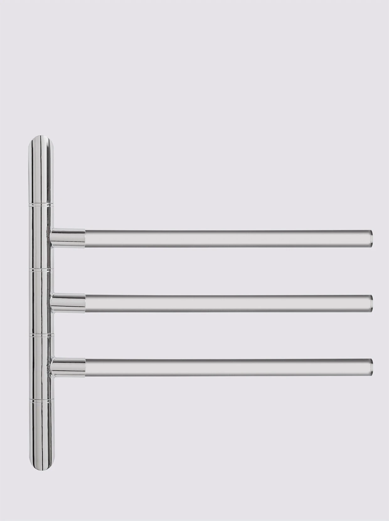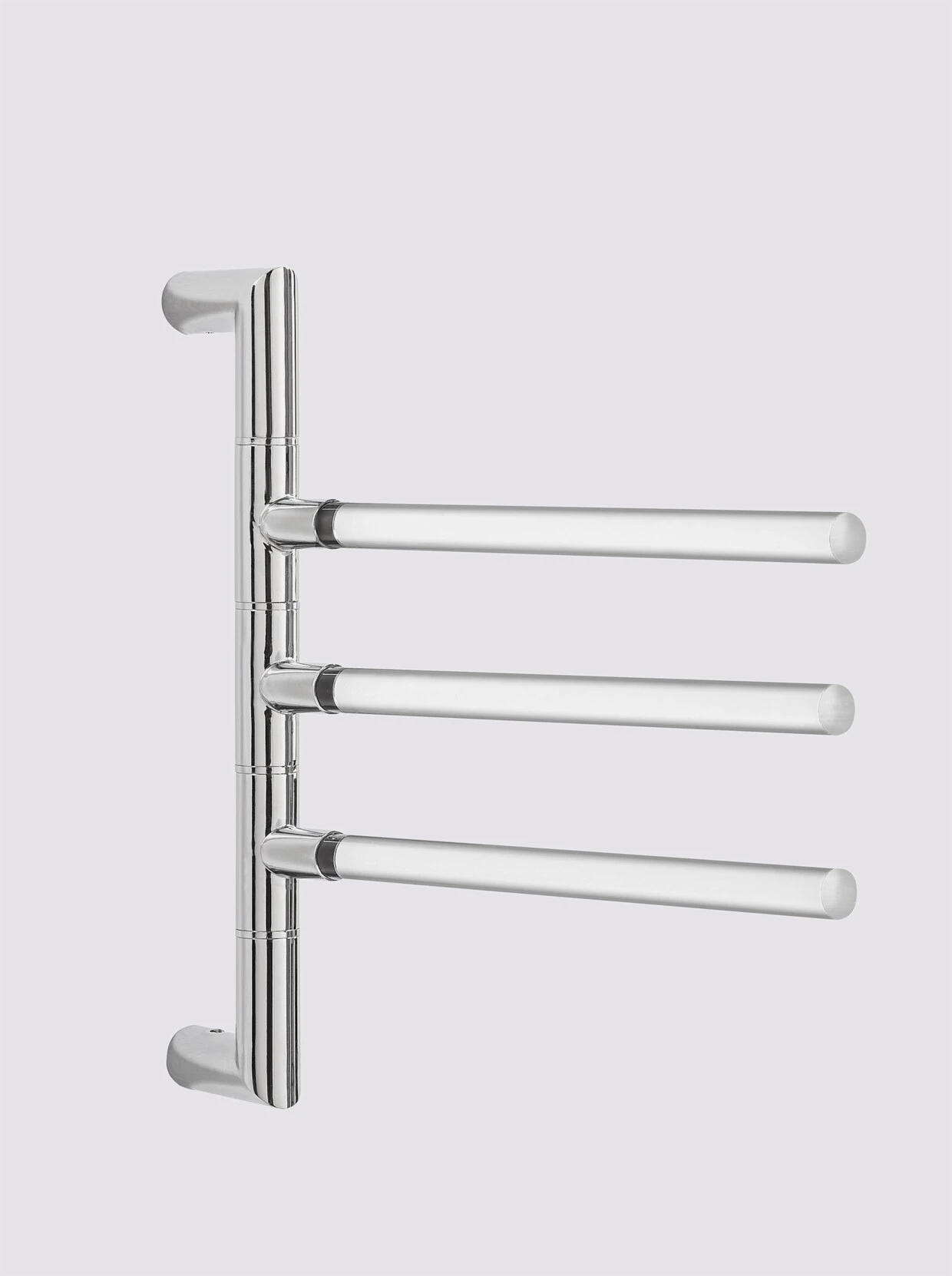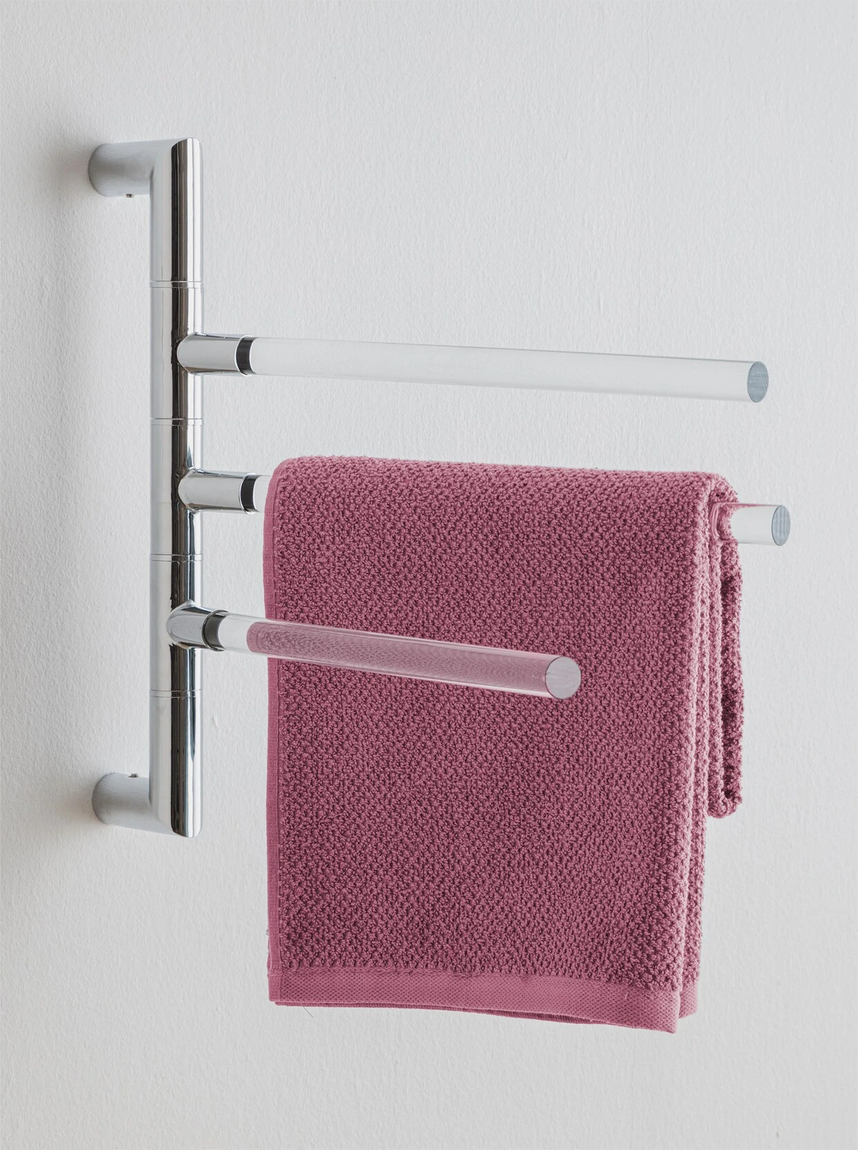 Handtuchhalter Aus Acrylglas und verchromtem Metall. Alle 3 Halterungen einzeln schwenkbar. Zur Wandmontage. Aufgebaut.