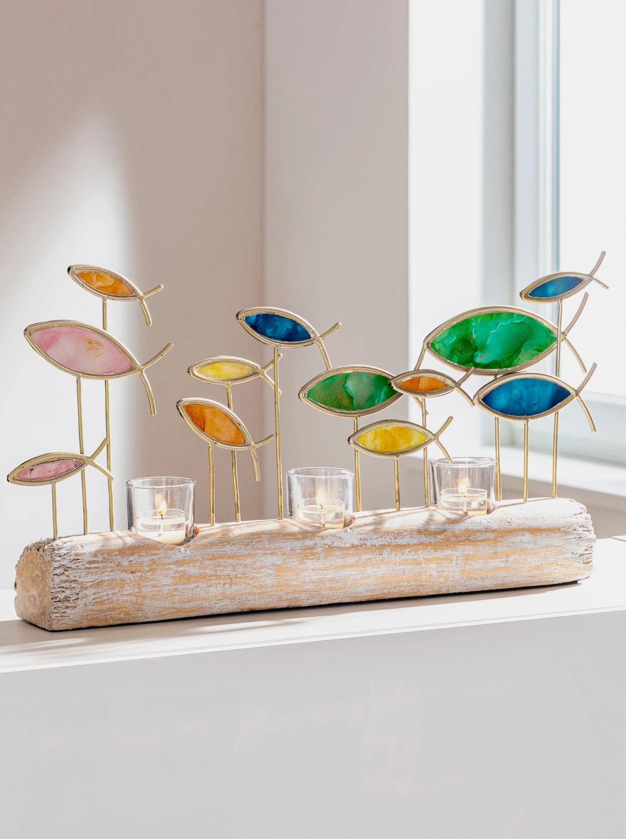 Kerzenhalter Aus massivem Albasiaholz, weiß gewischt. Metallfische mit Glasfüllung, handbemalt. Kunsthandwerkliche gefertigt. Jedes Teil fällt individuell aus. Abweichungen möglich. Mit 3 Glaseinsätzen, H/ø ca. 6,5/5,5 cm.
