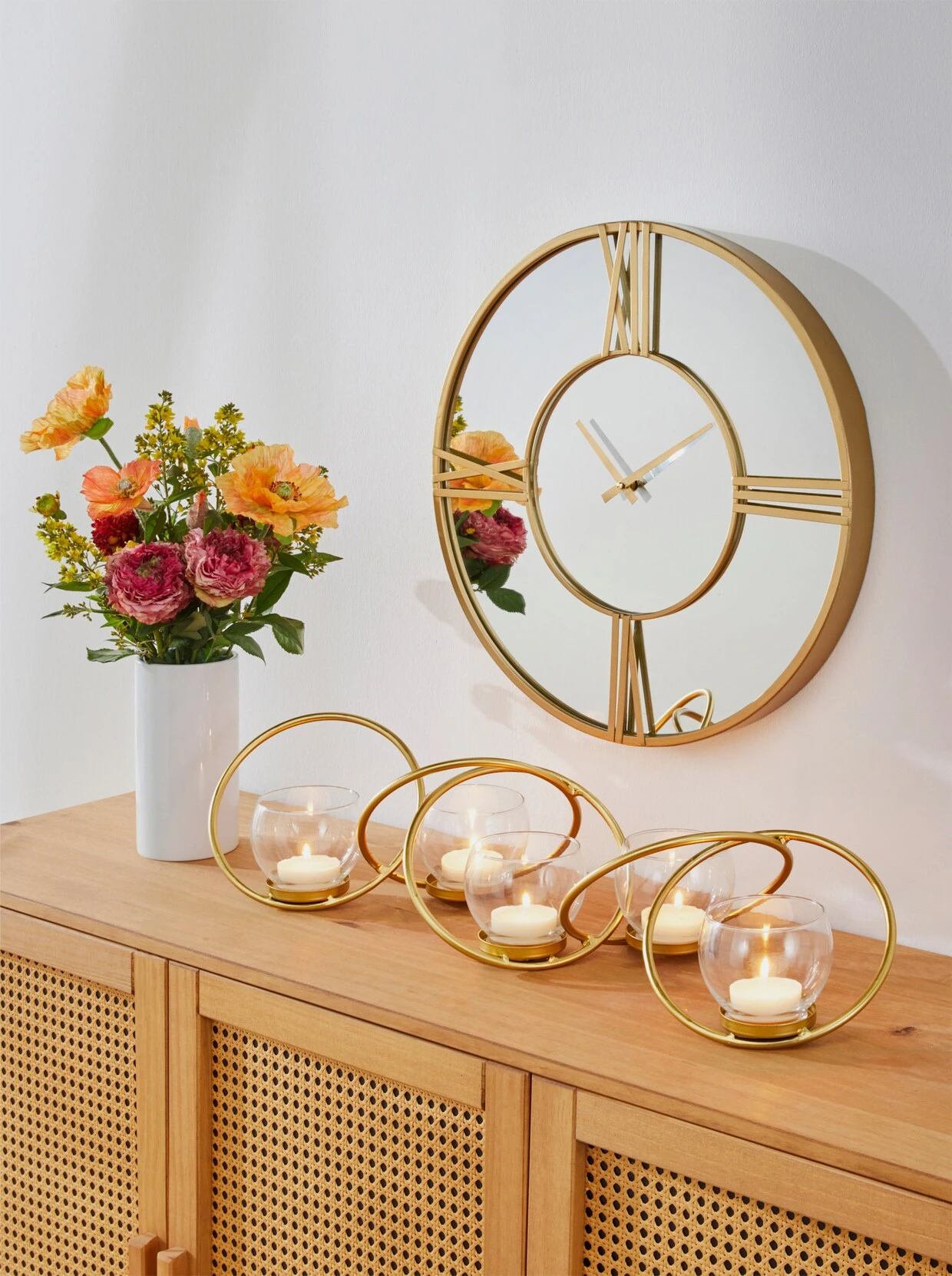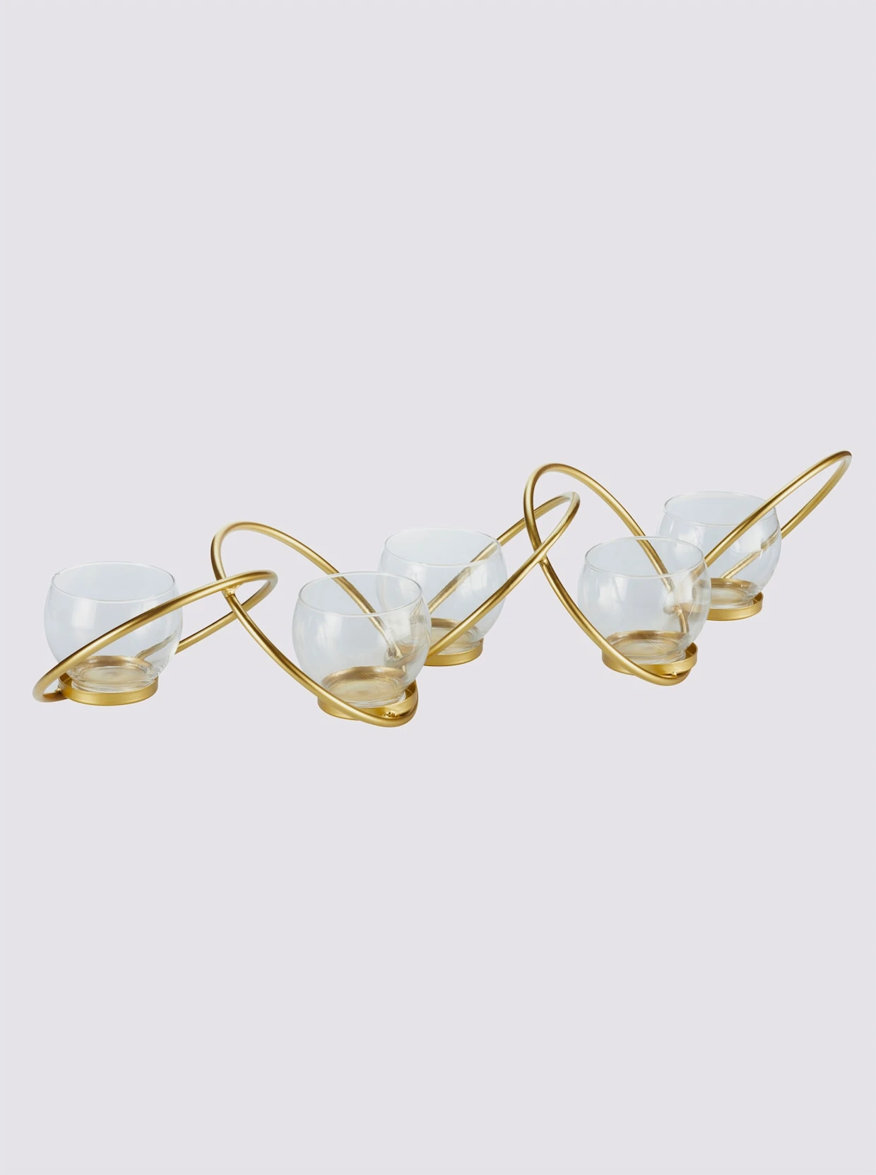 Kerzenleuchter Trendiges Dekoelement. Gestell aus Metall, goldfarben lackiert. Mit 5 Glaseinsätzen, H/ø ca. 9/9,5 cm.