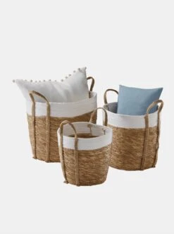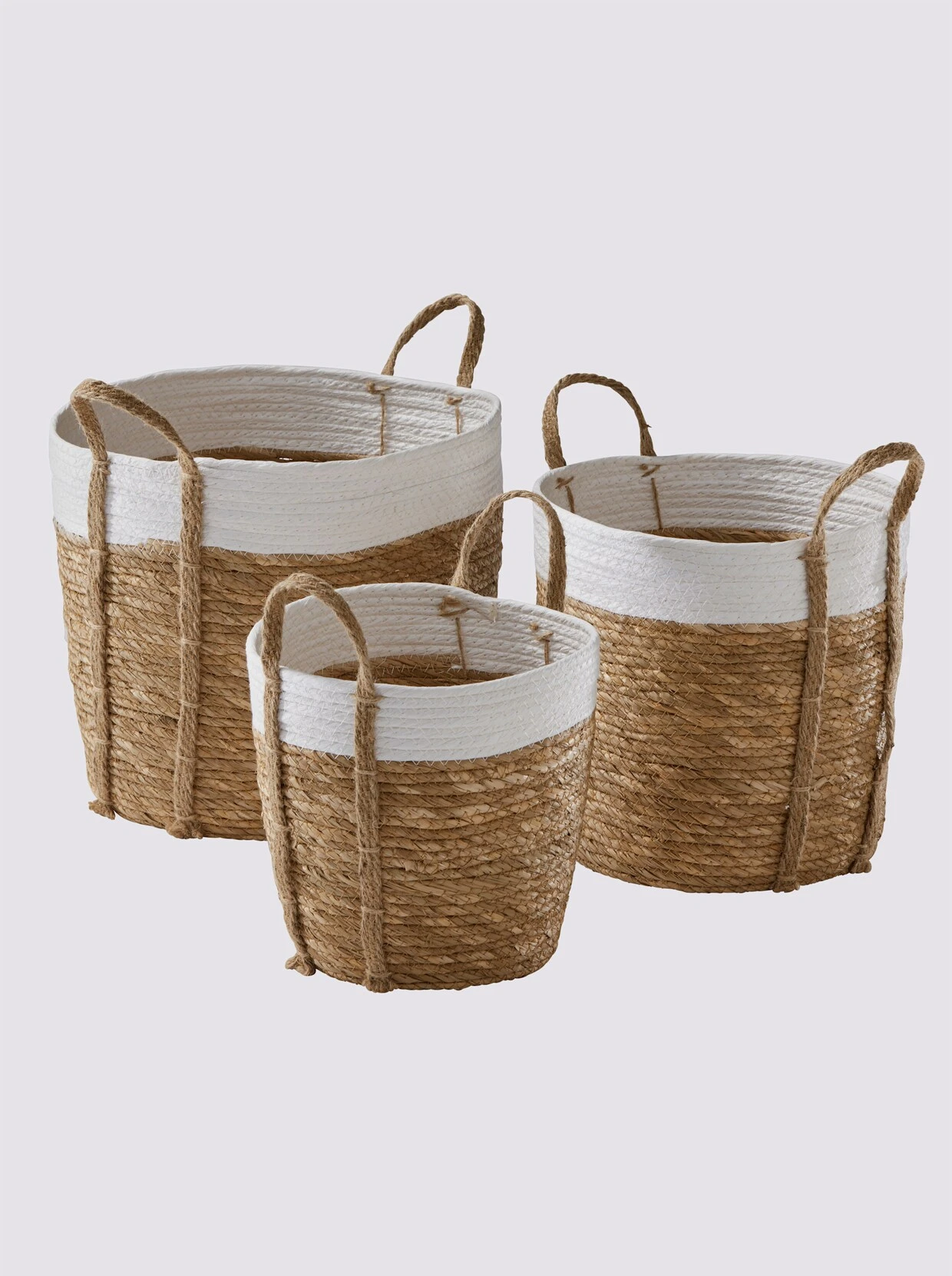 Körbe 3er Aus Seegras und Papier geflochten. Henkel aus robustem Naturmaterial. Platzsparend ineinander stellbar.