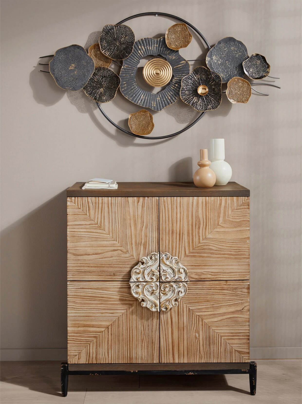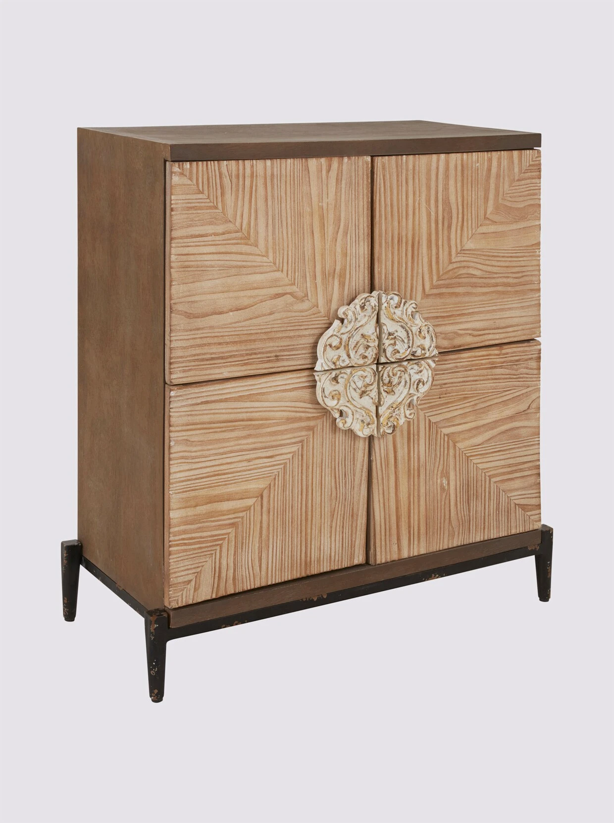Kommode Teils aus massivem Kiefernholz aus China, teils aus MDF-Holzfaserplatte. Fußgestell aus Metall, schwarz lackiert und antikisiert. Hinter den 4 Türen 1 fester Zwischenboden. Teilmontage.