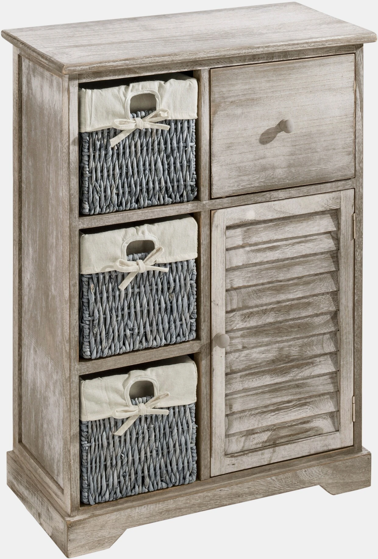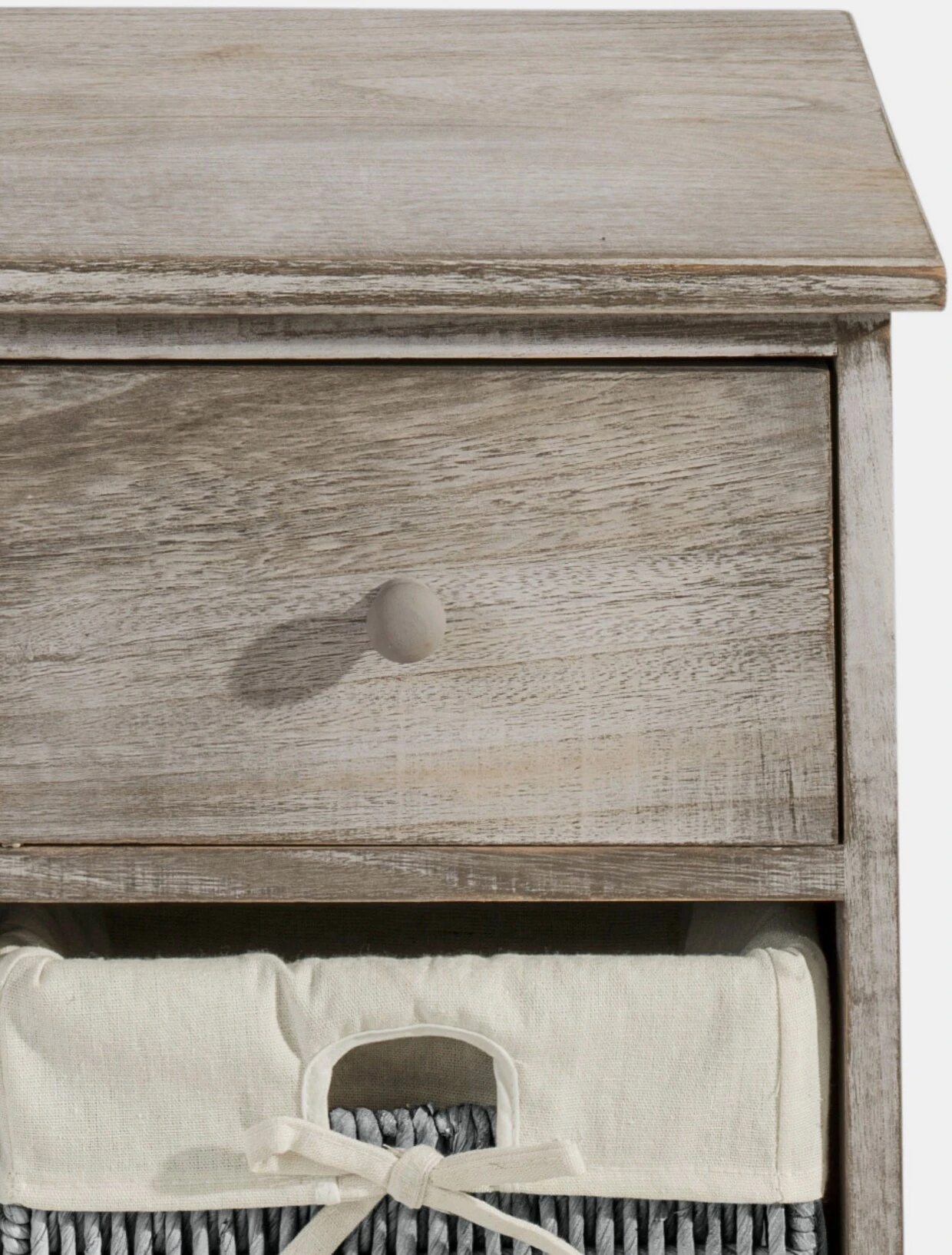 Kommode Massives Paulowniaholz aus China, braun oder grau gewischt, mit antikisierter Oberfläche und herausgearbeiteter Holzstruktur oder weiß lackiert. Inklusive geflochtenen Körben, Rahmen aus Eisen, mit Stoff aus 100% Baumwolle ausgeschlagen. Mit 1 Schublade, 1 Tür und 3 Körben. Aufgebaut.
