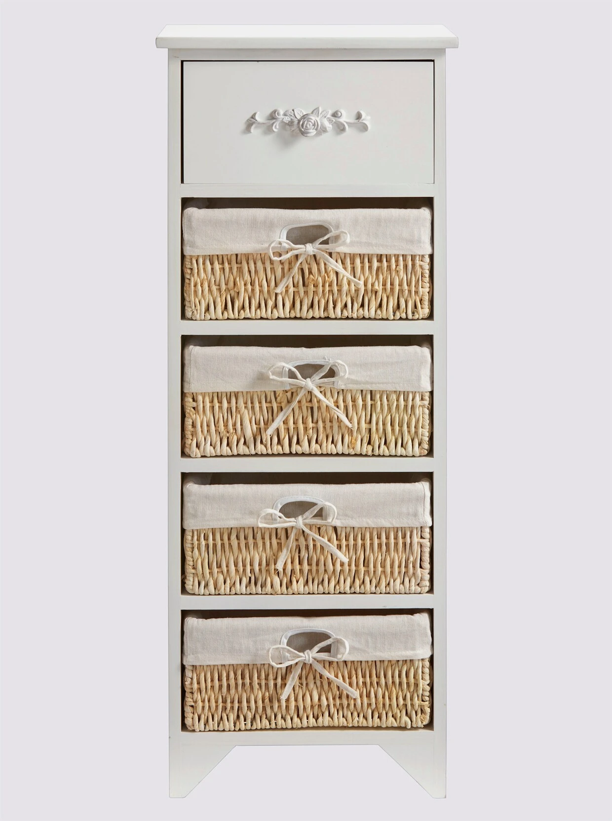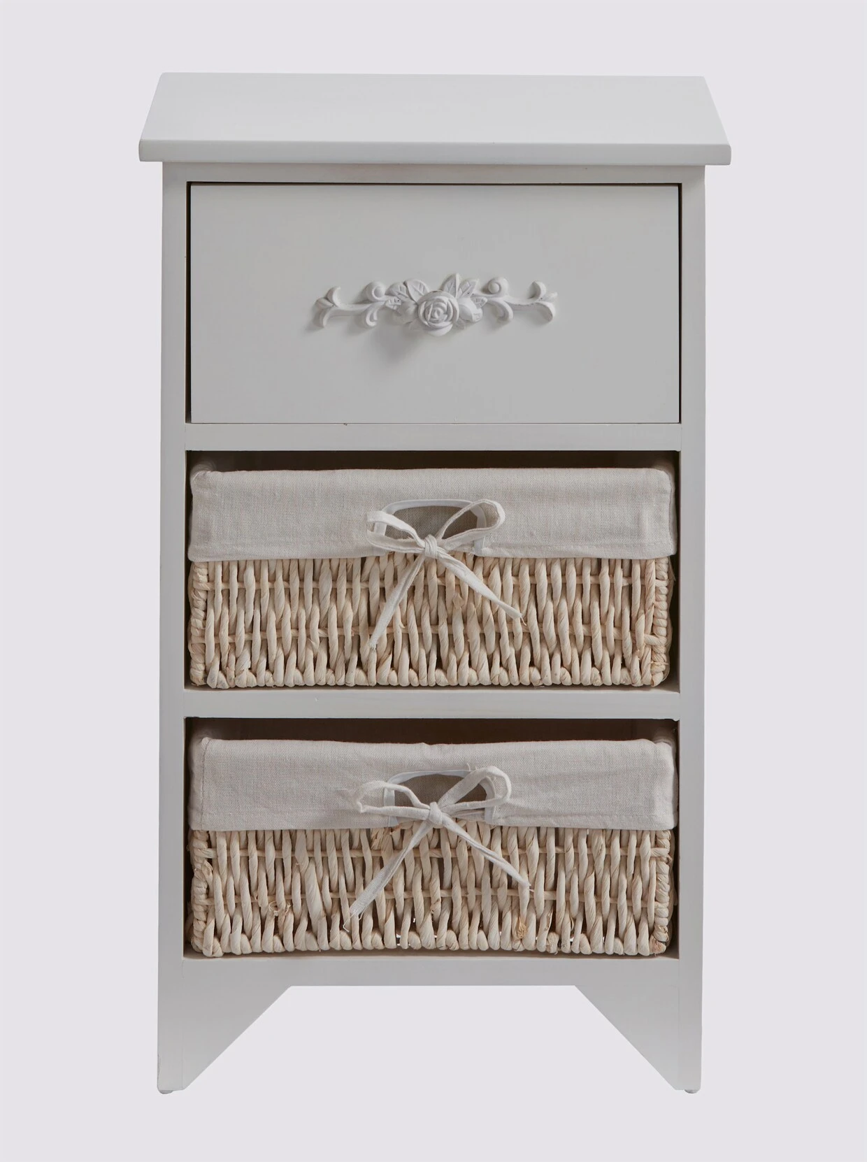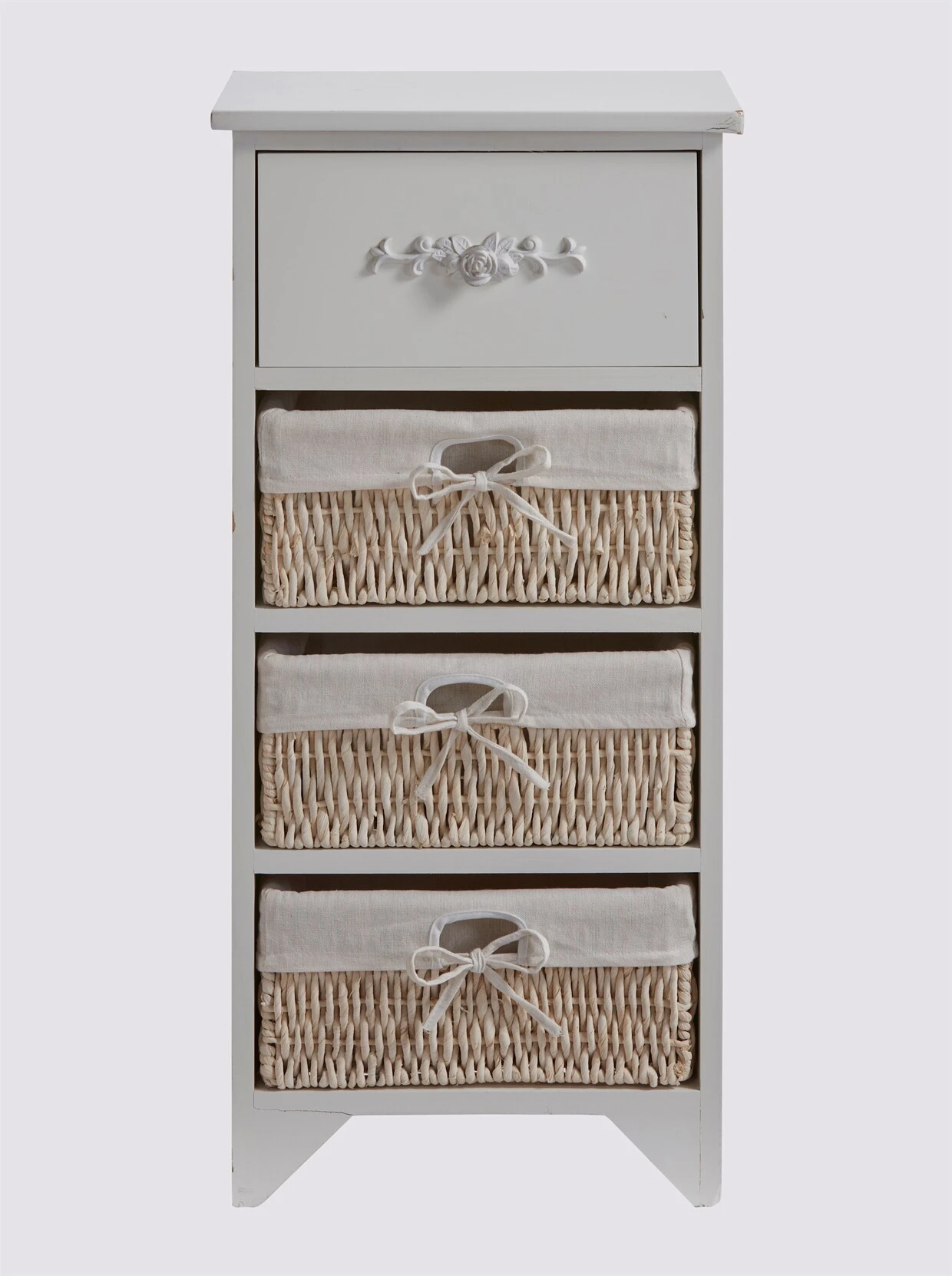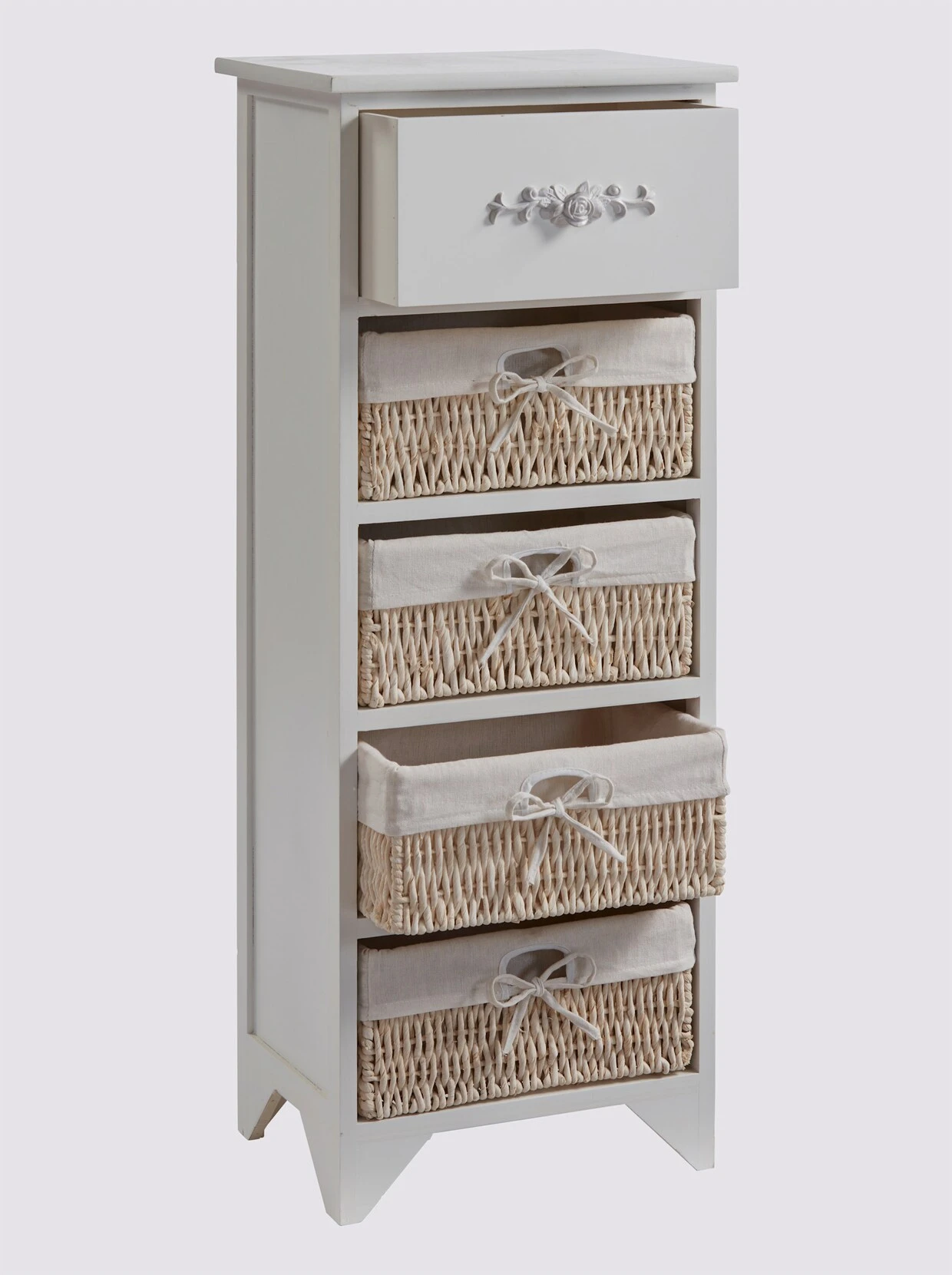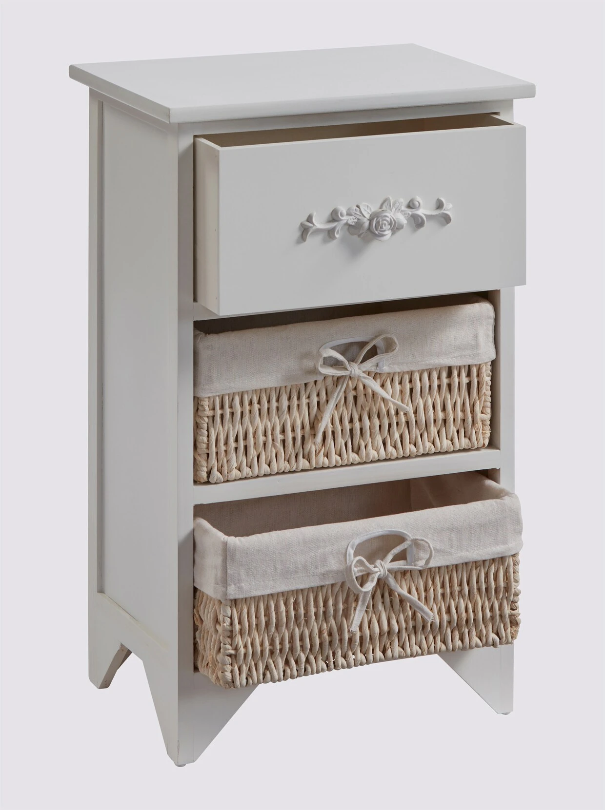 Kommode Aus massivem Paulowniaholz aus China, weiß lackiert. Je 1 Schublade aus Holz, mit dekorativ modellierten Rosenranken-Griff. Körbe aus Papierseilen geflochten, mit waschbarem Textilbezug. Aufgebaut.