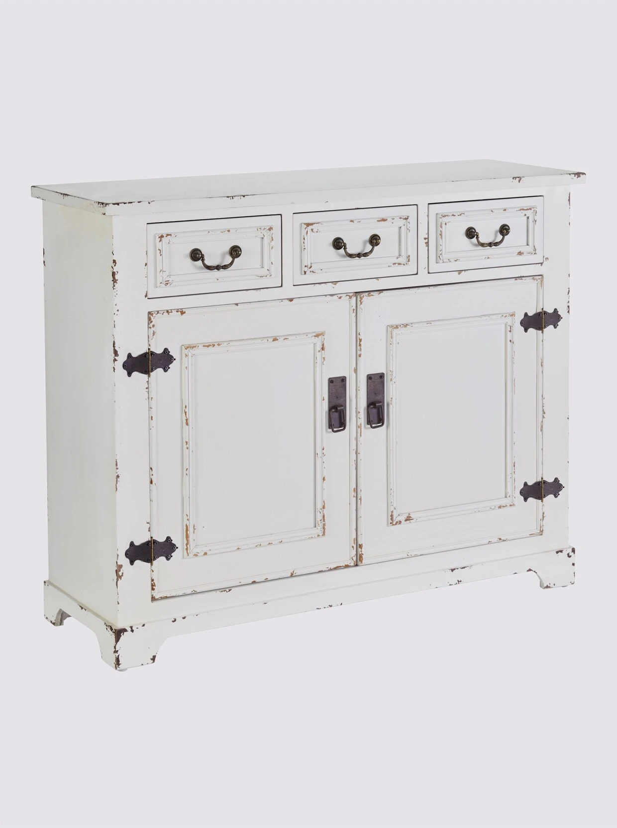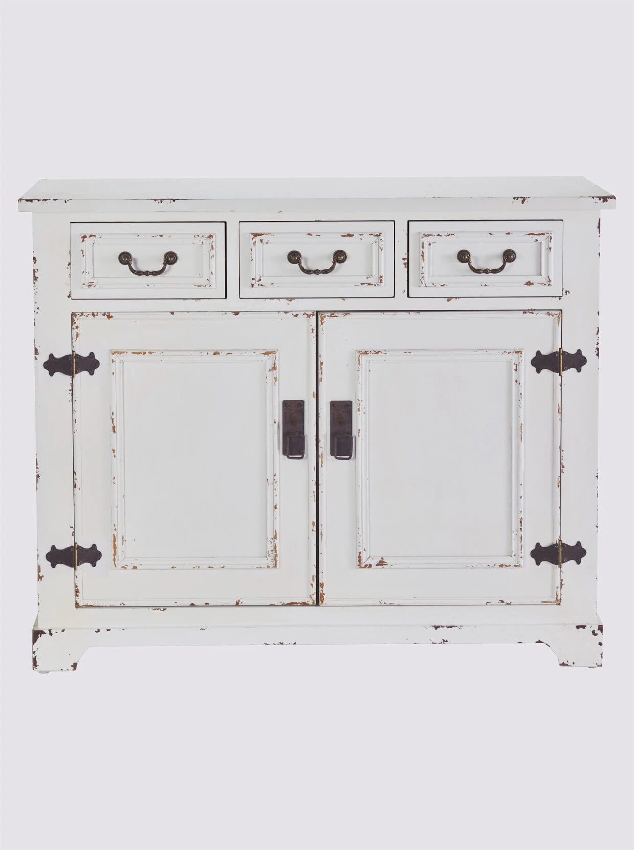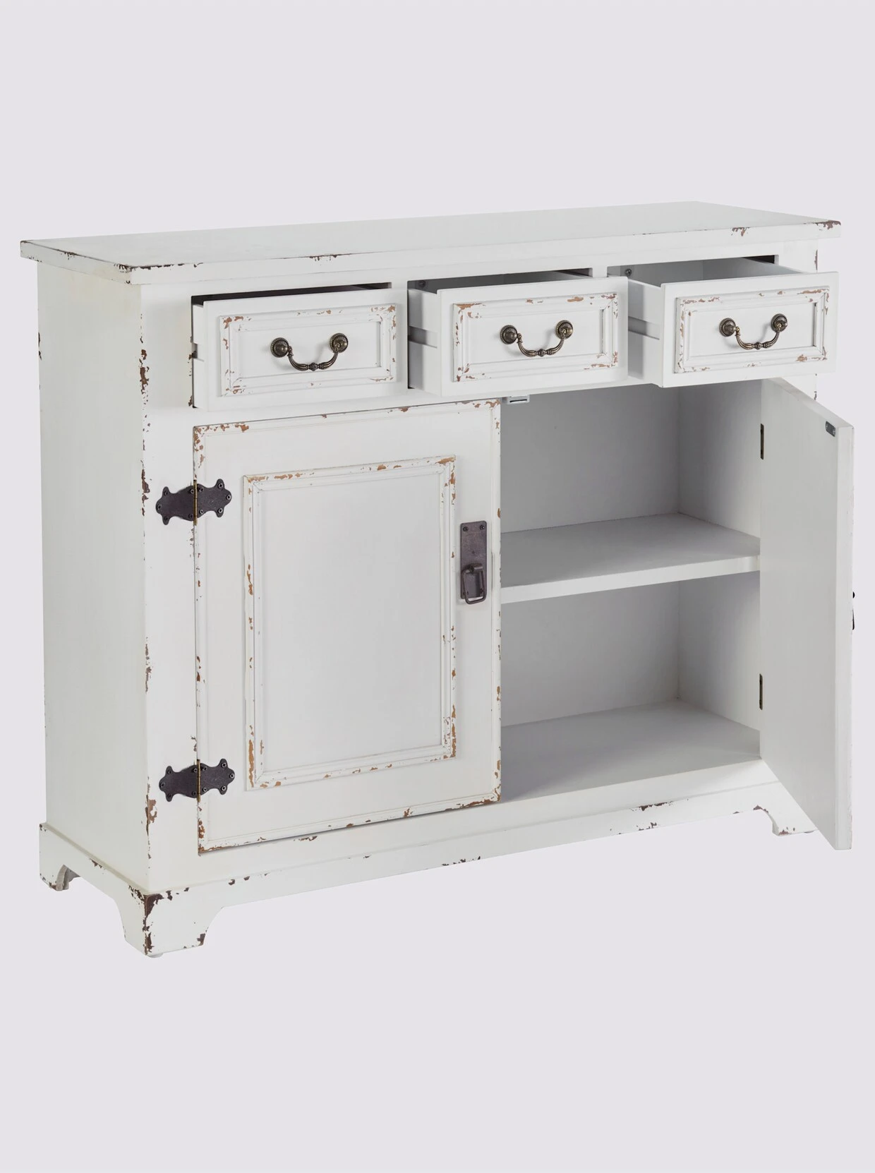 Kommode Weiß gewischt und antikisiert mit gewollten Gebrauchsspuren. Beschläge in Rostoptik. Teils aus massivem Tannenholz aus China, teils aus MDF-Holzfaserplatte. 3 Schubladen auf Holzführung, H/B/T ca. 11/22,5/26 cm. Hinter den Türen 1 fester Zwischenboden ca. 87/27,5 cm. Aufgebaut.