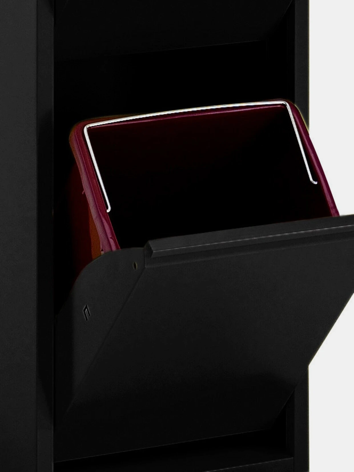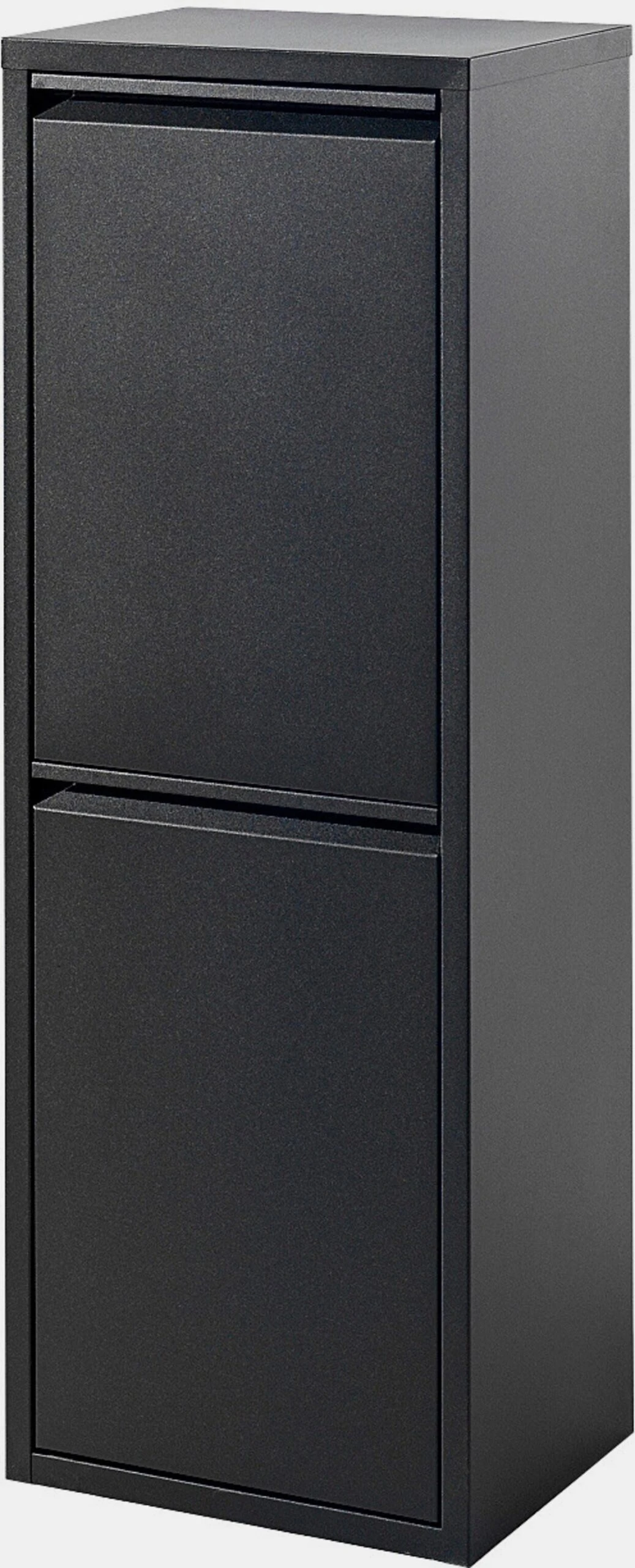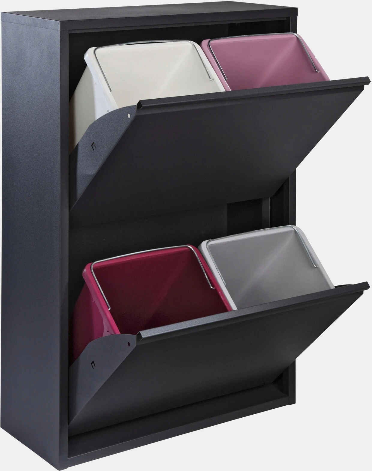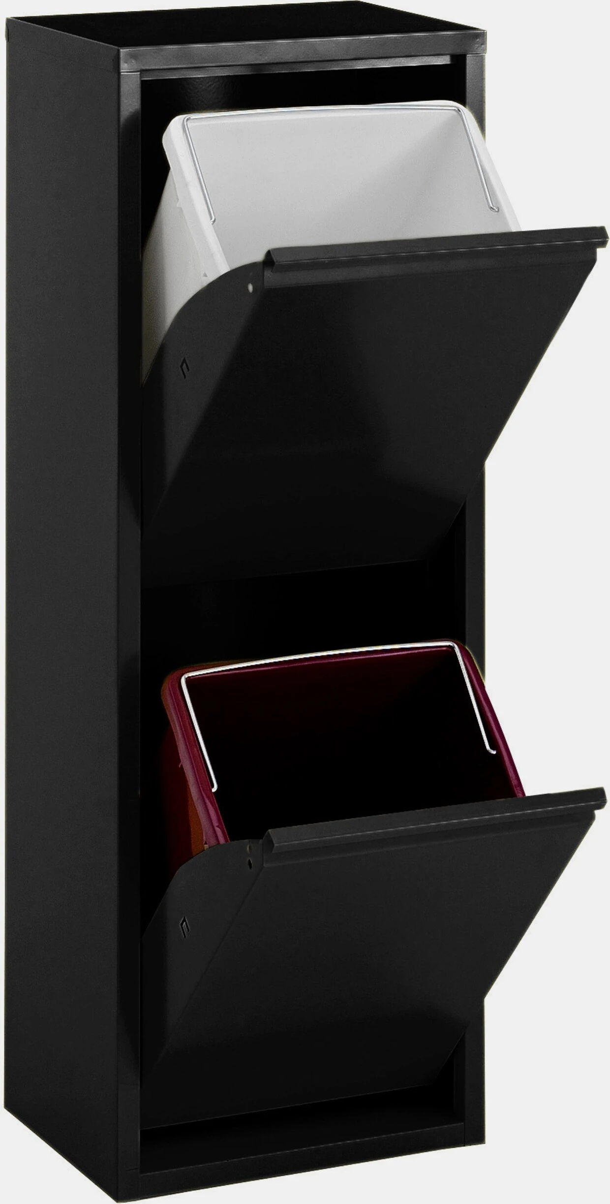 Mülltrenner Aus farbig lackiertem Metall. Frontklappen mit 2 bzw. 4 herausnehmbaren Kunststoff-Eimern. Zusätzliche Wandbefestigung möglich.