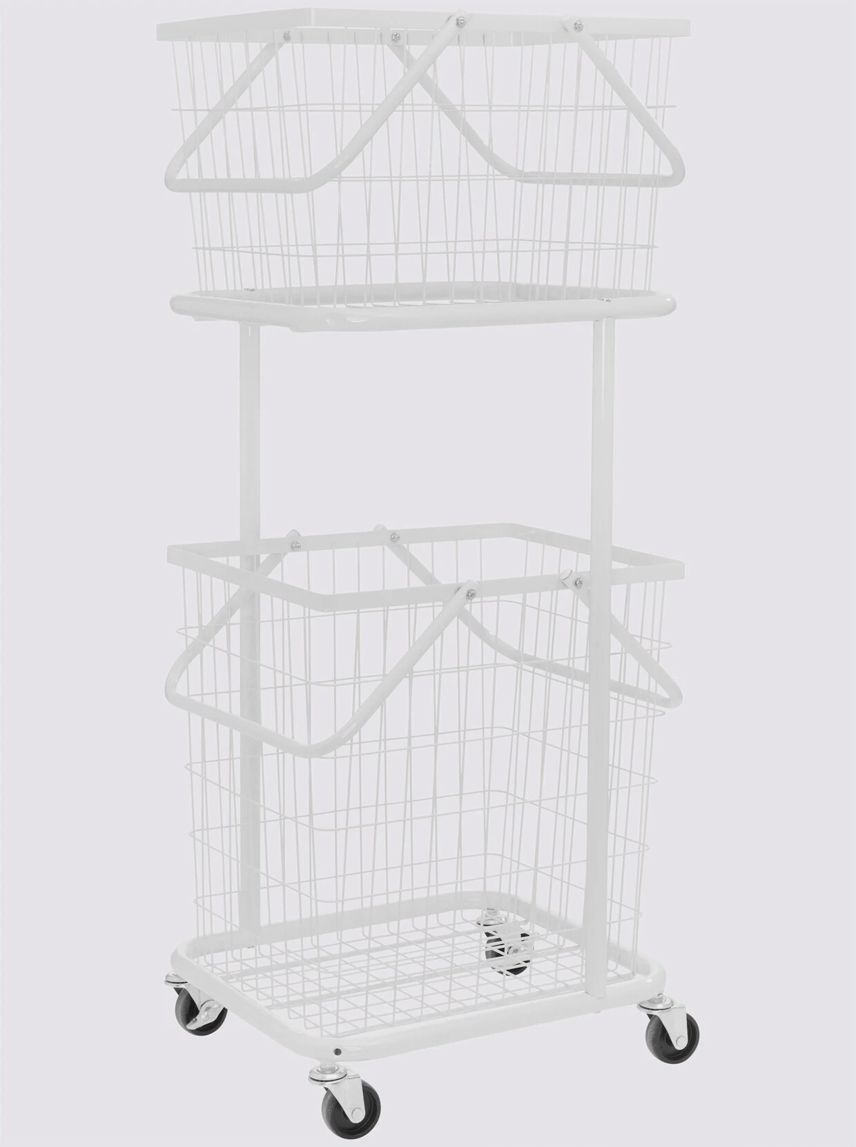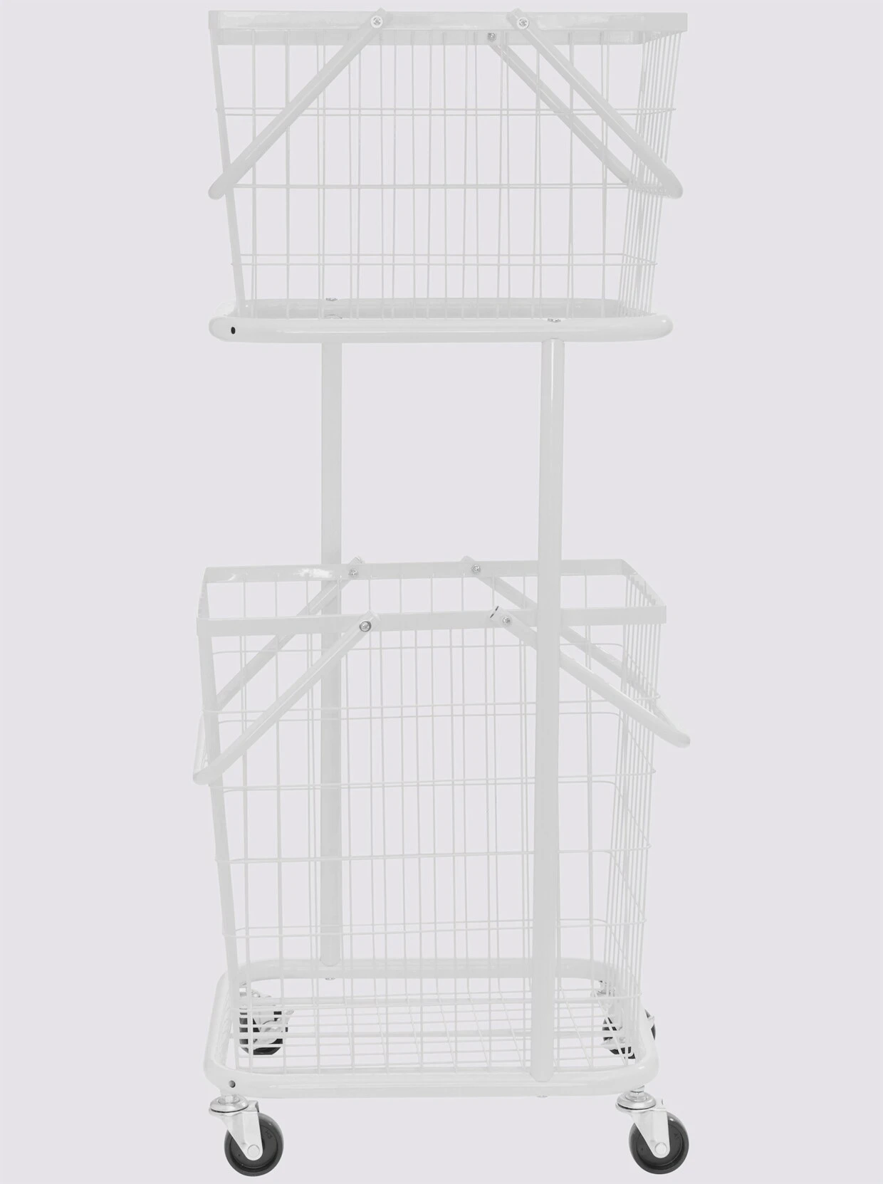 Ordnungswagen Aus Metall, weiß lackiert. Mit 2 herausnehmbaren Gitterkörben. Beweglich durch 4 Leichtlaufrollen, 2 davon feststellbar. Selbstmontage.