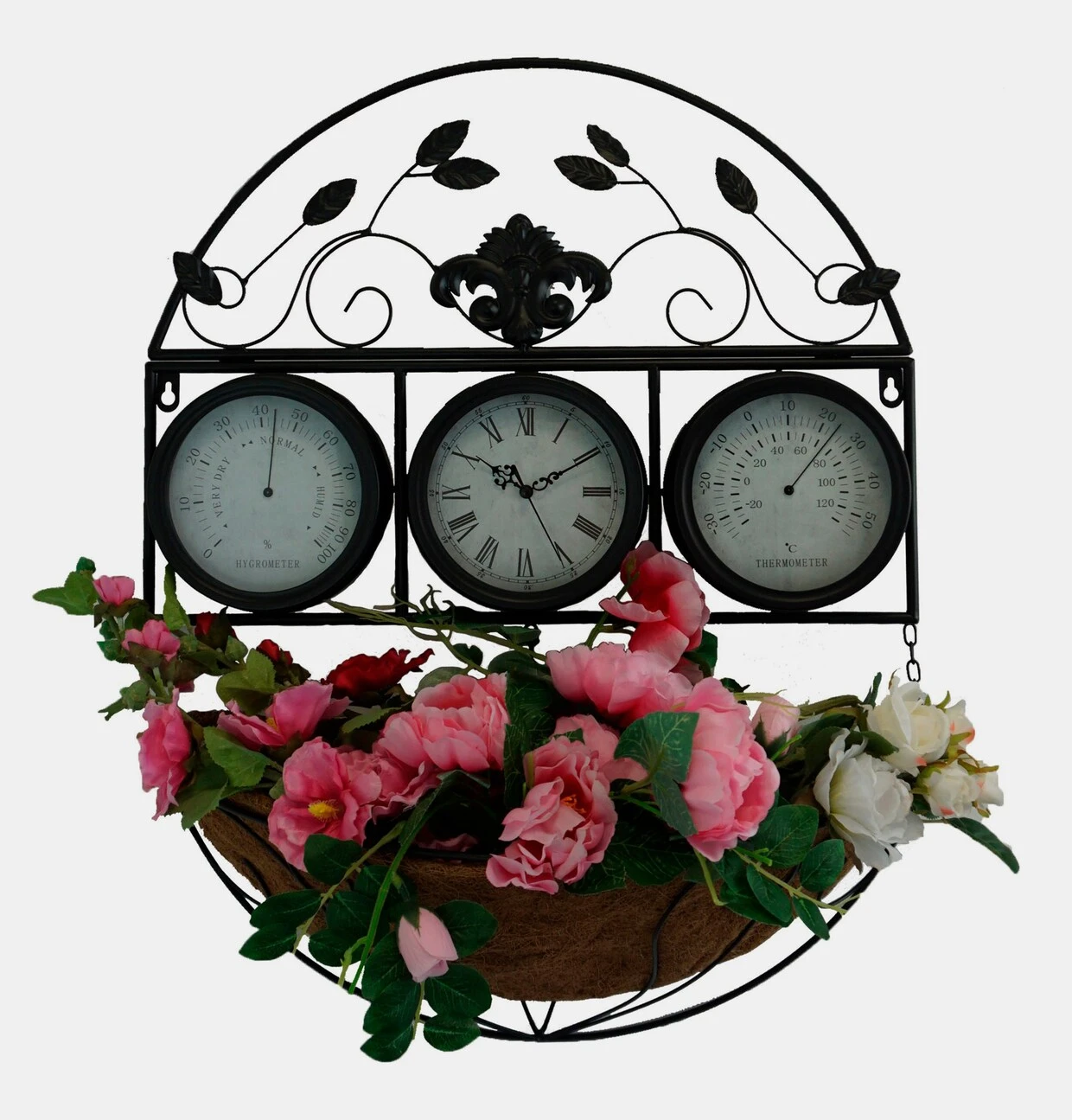 Pflanzgefäß Äußerst dekorativ und praktisch zugleich! Pflanzschale mit Uhr, Hygrometer und Thermometer. Aus Metall gefertigt und schwarz lackiert. Lieferung ohne 1x AA-1,5 V-Batterie. Für den Außenbereich, zur Wandmontage.