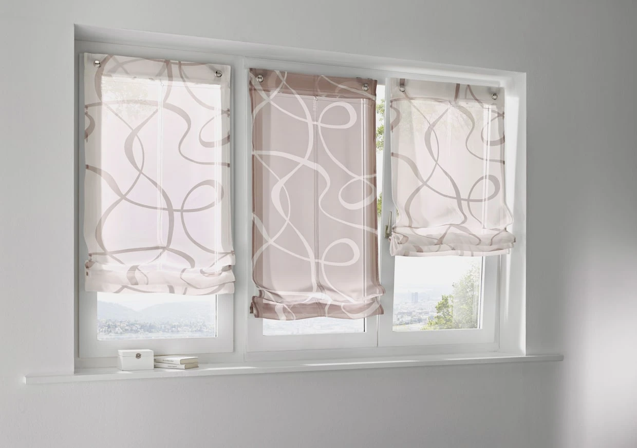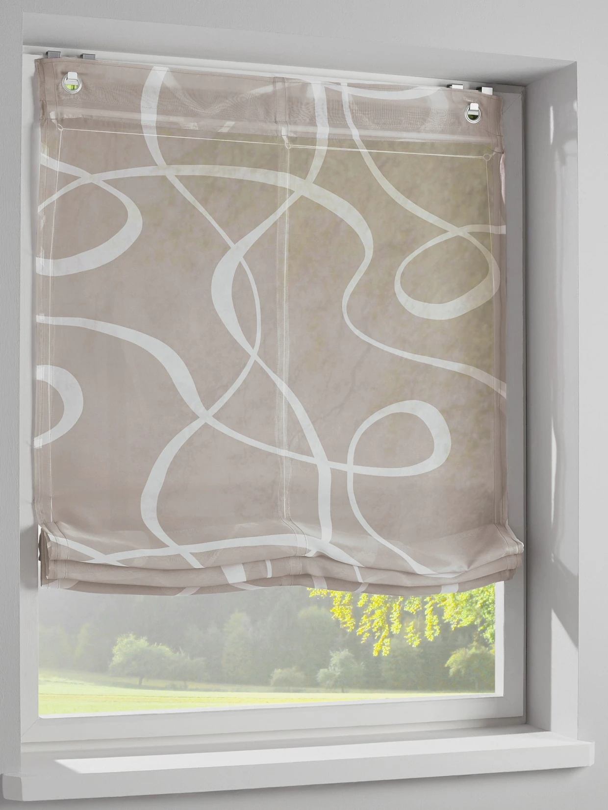 Raffrollo Halbtransparenter Voile mit Grafik-Print. Einfaches Aufhängen am Fensterrahmen mittels Ösen und U-Haken. Gr. 1, 2 und 3 mit 2 Ösen, Gr. 4 und 5 mit 3 Ösen. Haken bitte extra bestellen. Maßinfos im Internet.