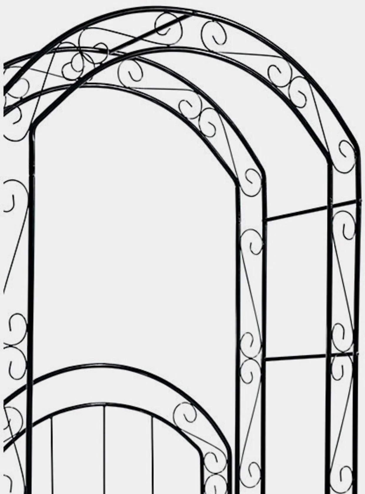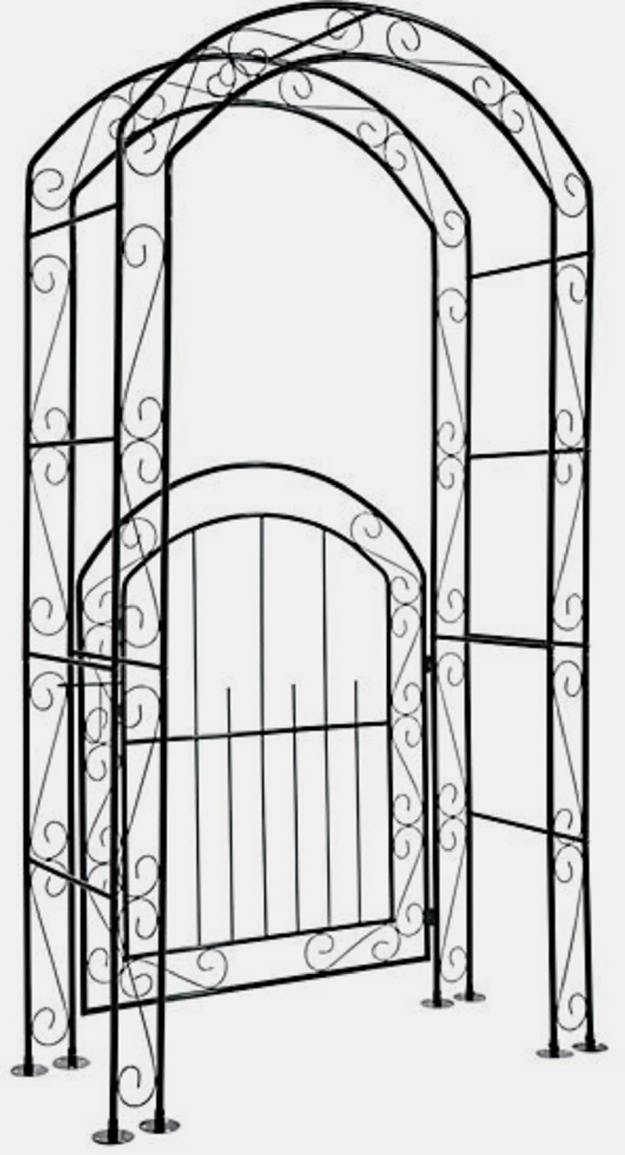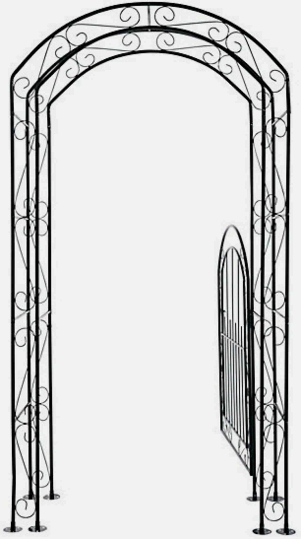 Rankgitter Dekorativ verziertes Gartenportal mit Rosenbogen. Äußerst robust, aus schwarz lackiertem Metall, mit stabilisierenden Querstreben. Tür-H/B ca. 115/90 cm. Selbstmontage.