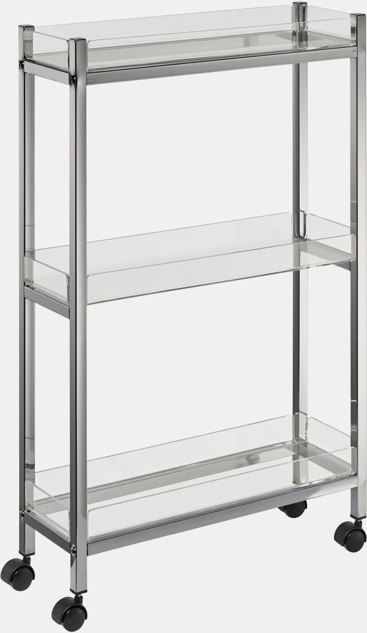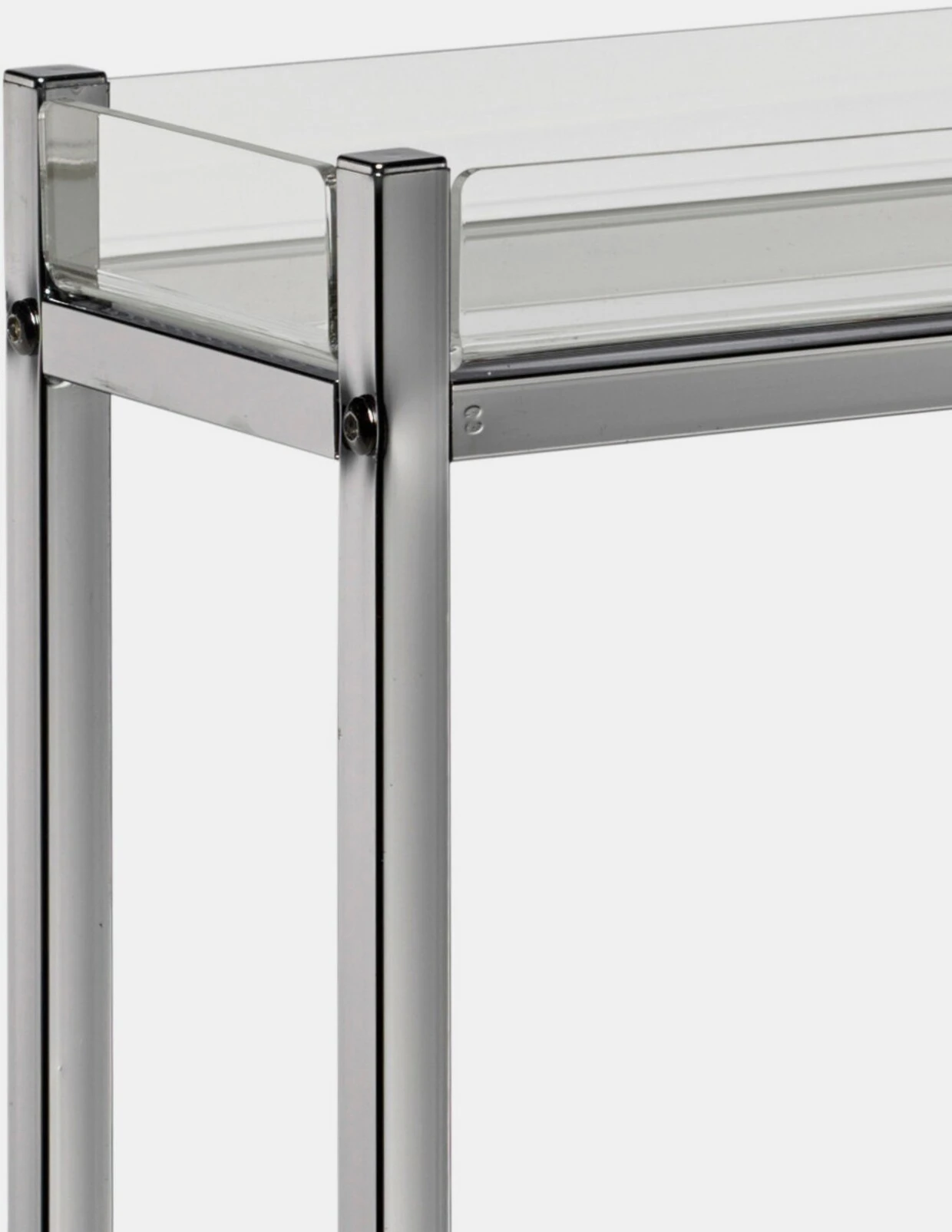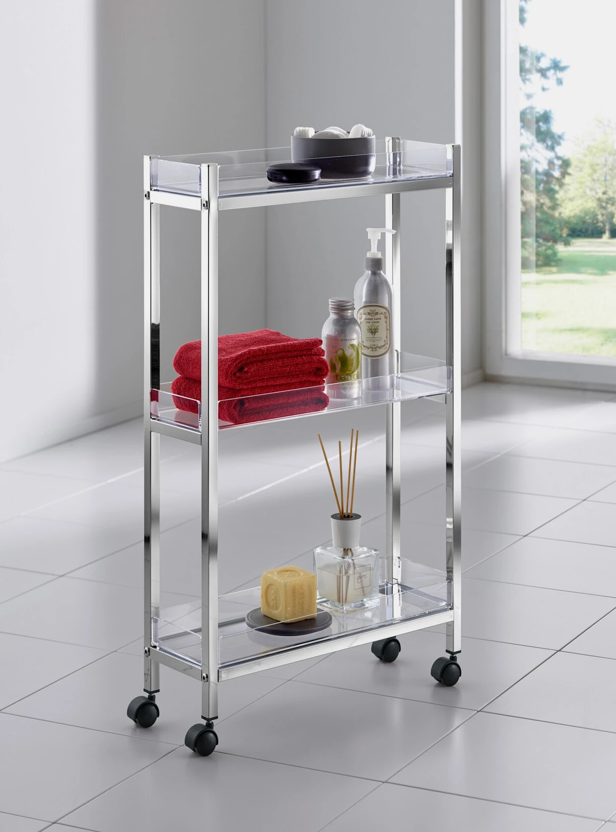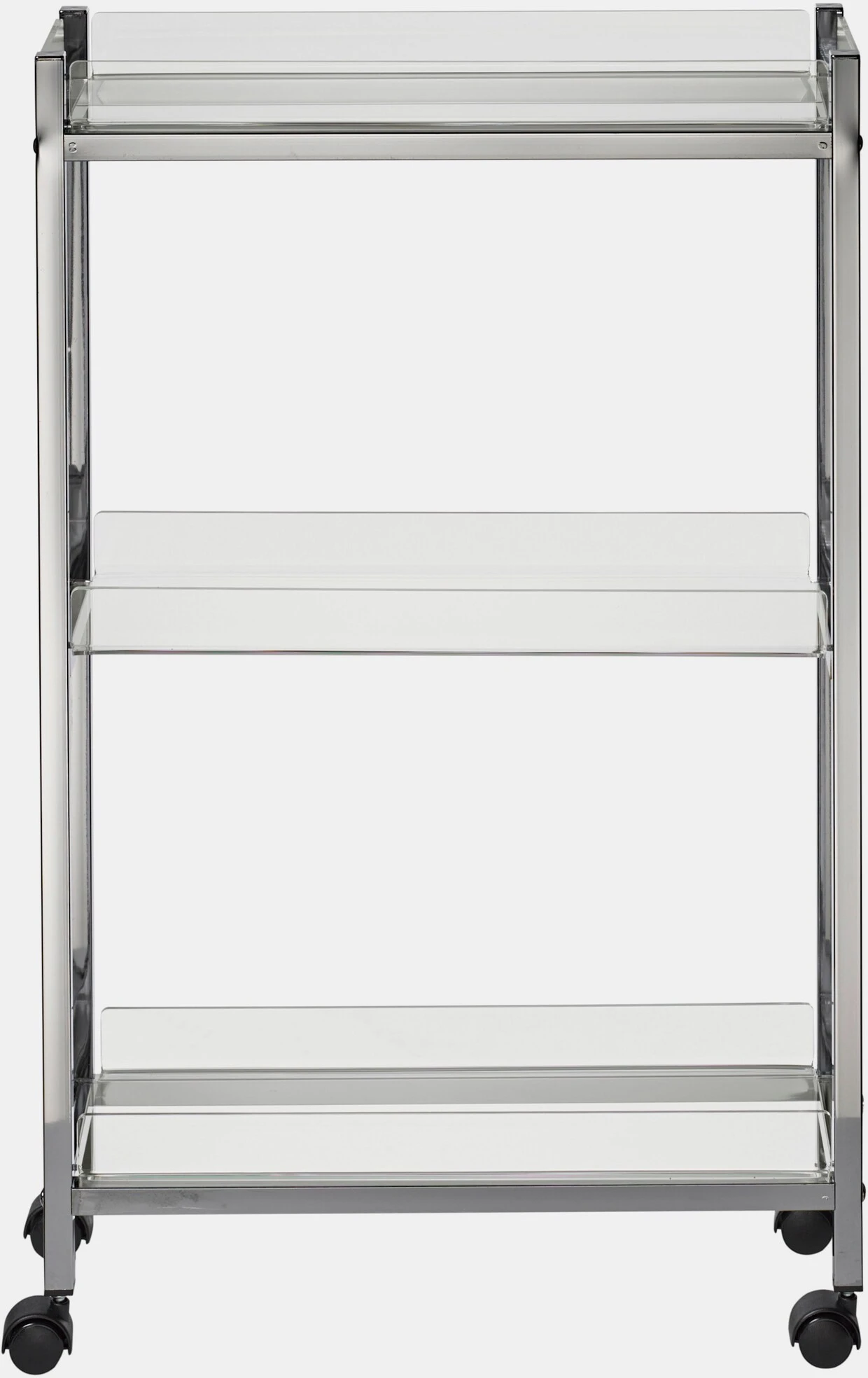Rollwagen Gestell aus verchromtem Metall, fahrbar auf 4 Rollen. Einlegeböden aus Acrylglas. Selbstmontage.