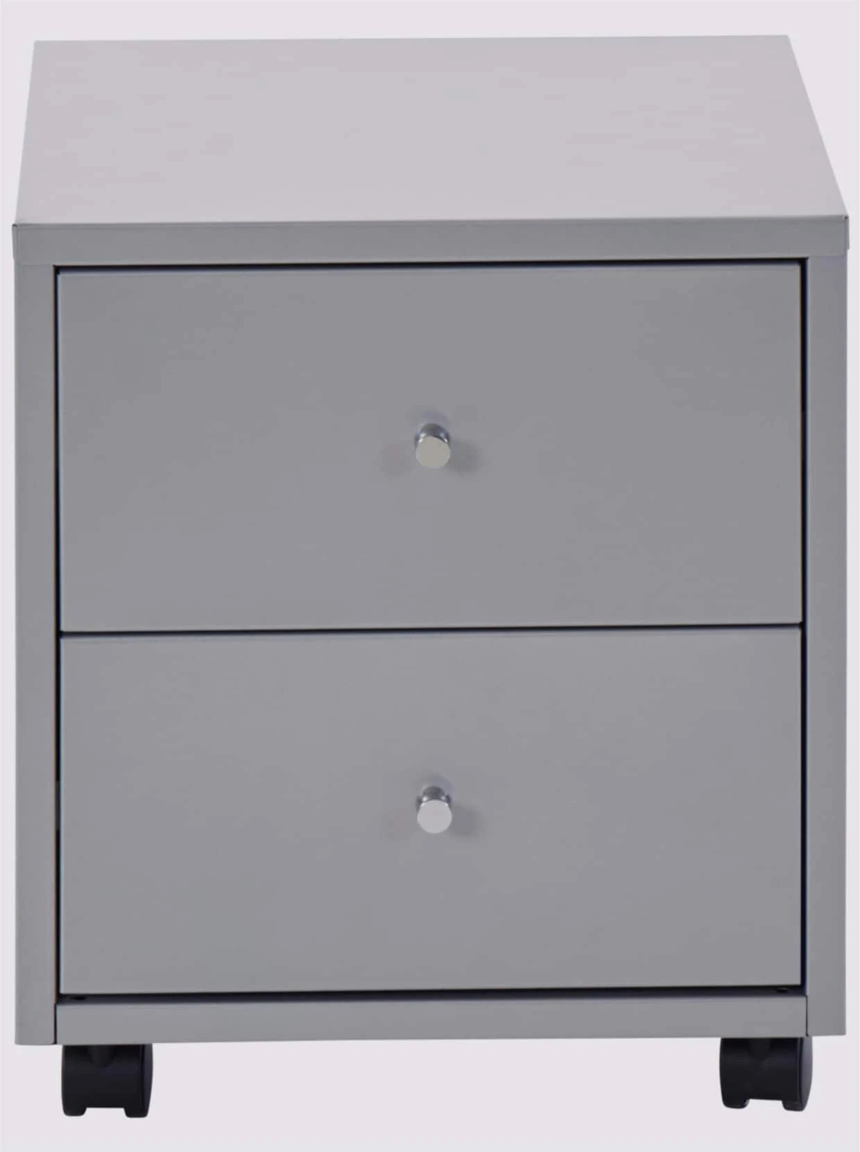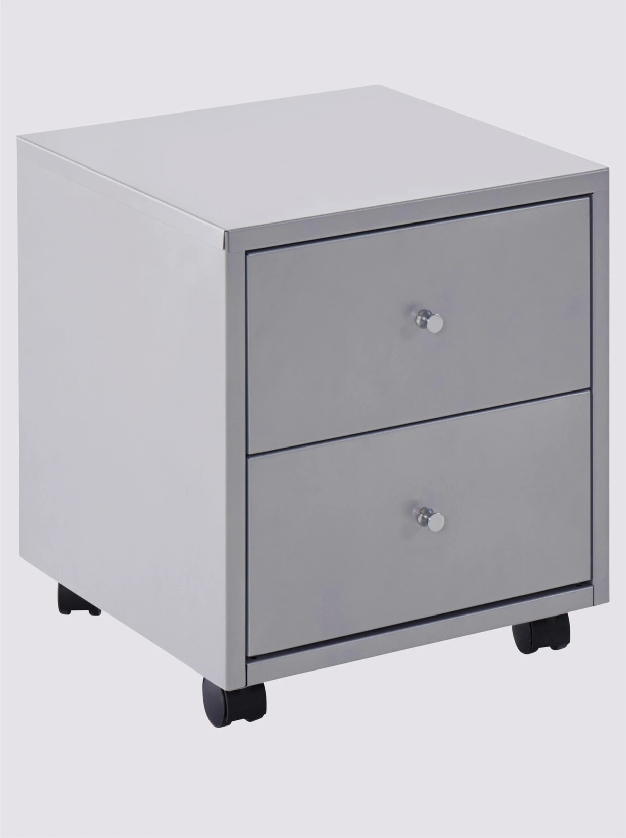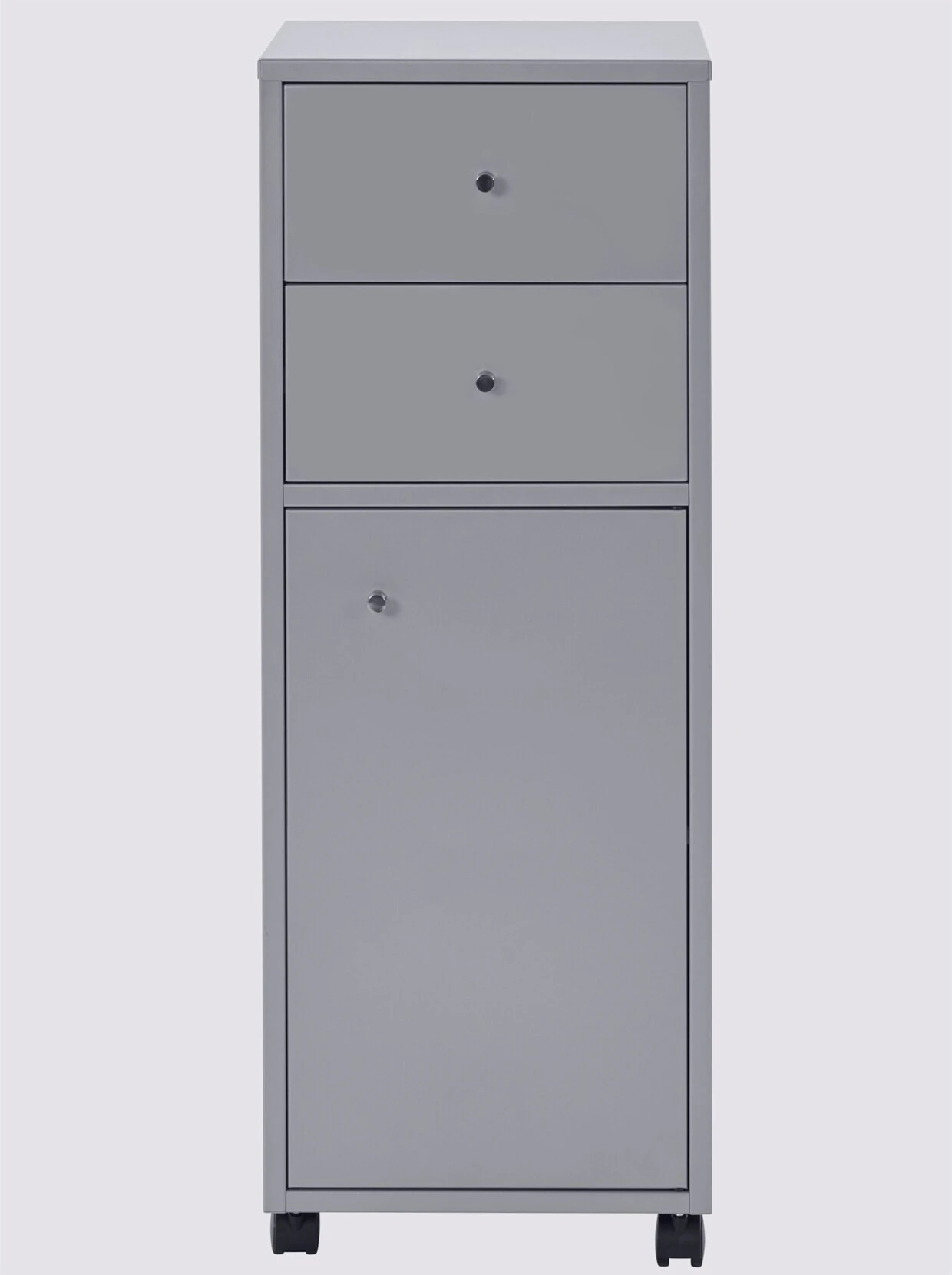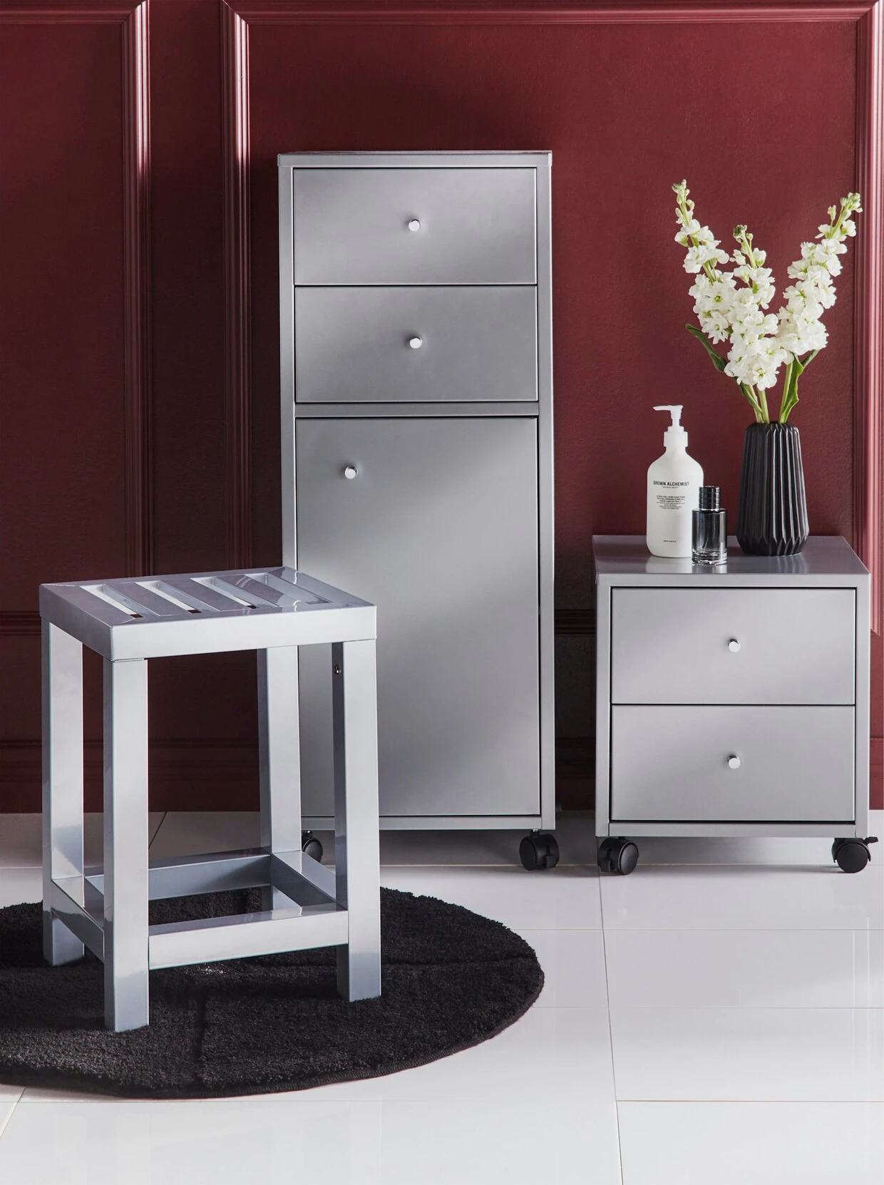 Rollwagen Aus Metall, pulverbeschichtet. In 2 Ausführungen: klein mit 2 Schubladen, groß mit 2 Schubladen und 1 Tür. Schubladen auf Metallschienen. Einlegeboden flexibel. Auf Kunststoffrollen, 2 davon feststellbar. Selbstmontage.