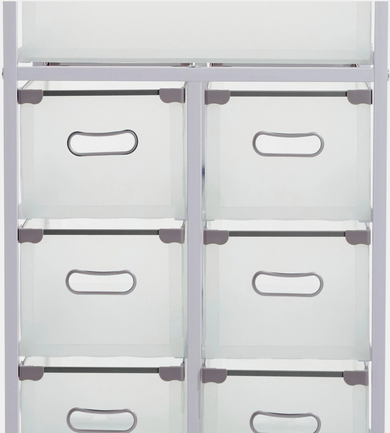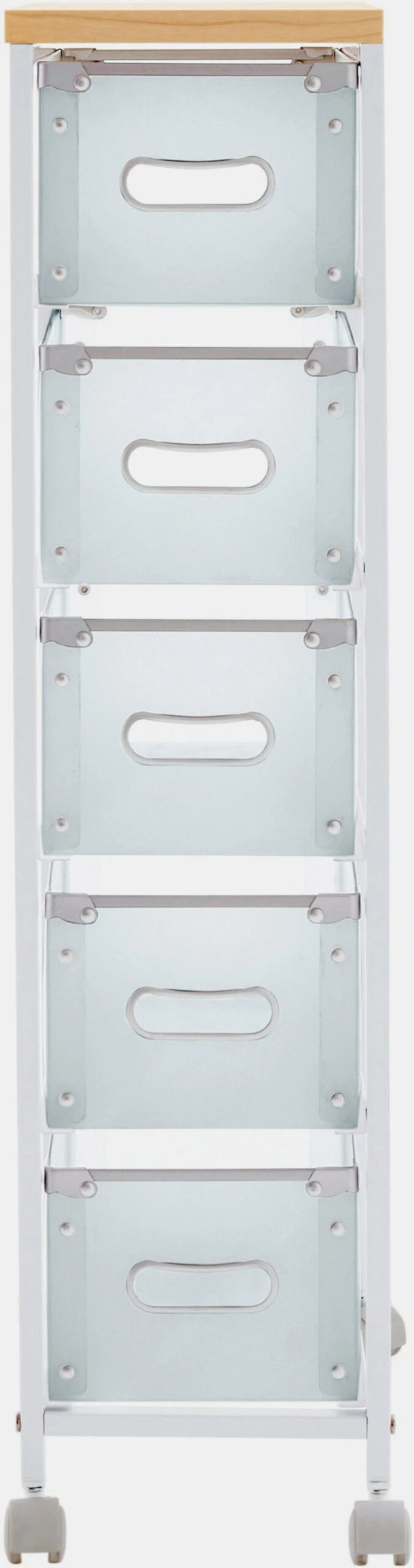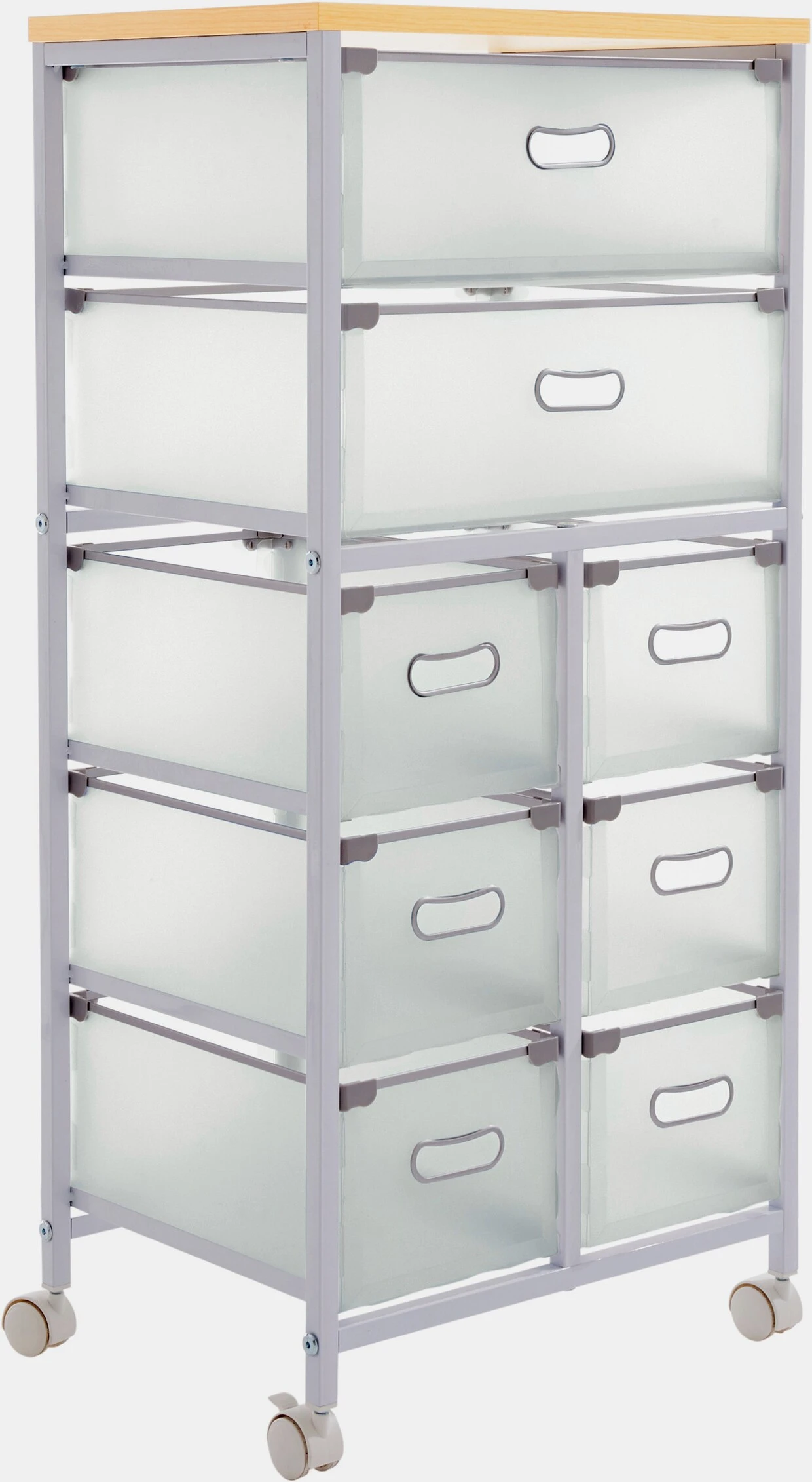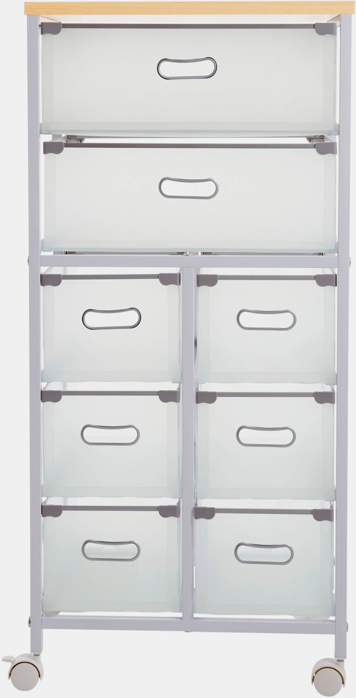 Rollwagen Aus stabilem Metall. Deckplatte aus MDF-Holzfaserplatte, beschichtet. Auf 4 Rollen fahrbar. Schubladen aus Kunststoff, auf Metallschienen, mit Grifflöchern. Selbstmontage.
