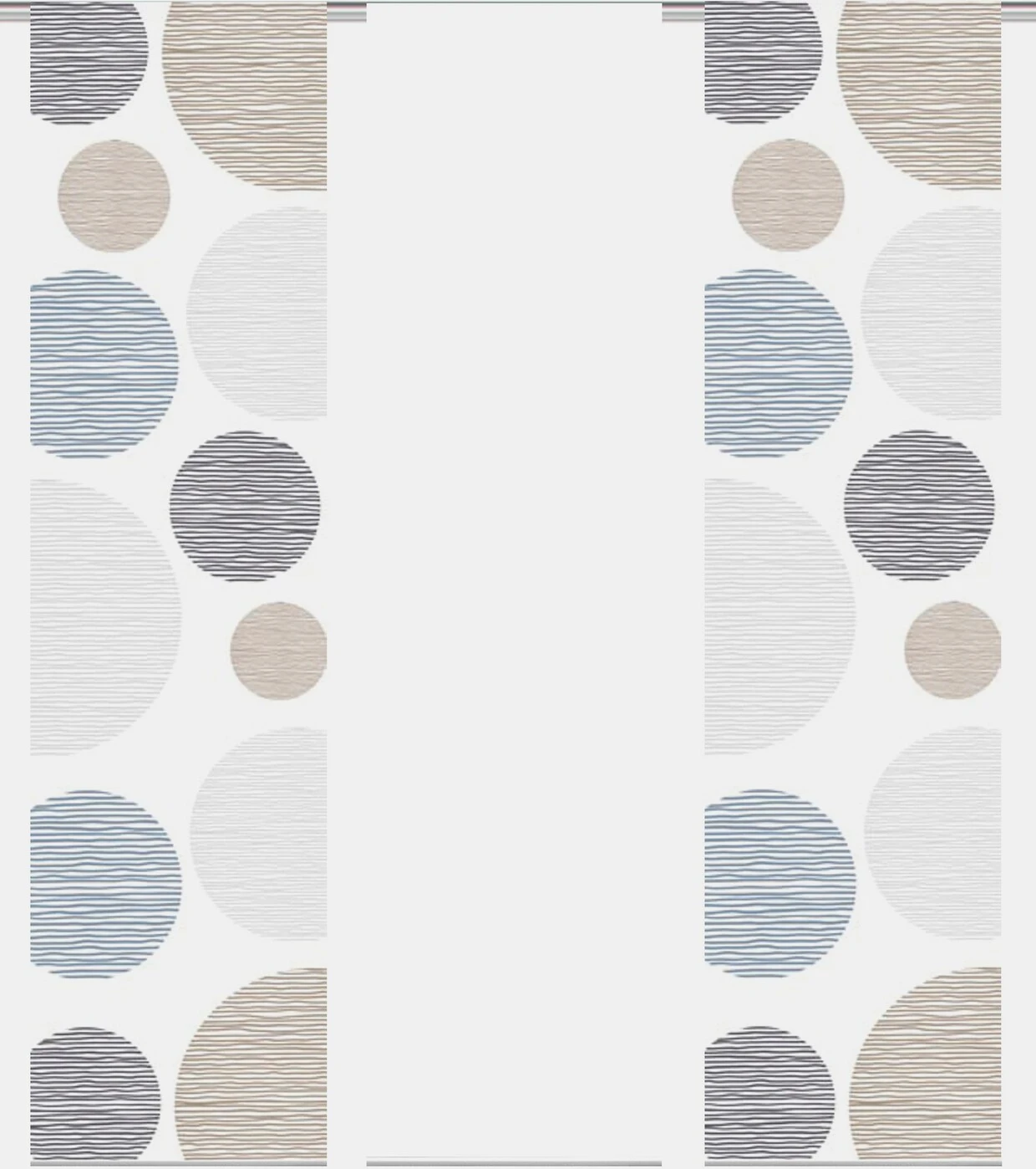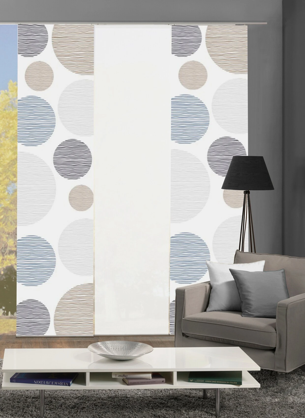 Schiebevorhang Mehrteiliges Set zum variablen Kombinieren: Schiebevorhang mit hochwertigem Digitaldruck auf blickdichtem Dekostoff in Seiden-Optik, Schiebevorhang uni blickdicht gefärbt. Alle Teile lasergeschnitten, inklusive Paneelwagen und Klemmleiste.