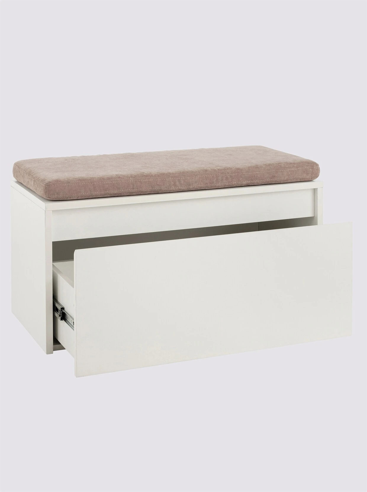 Schuhbank Aus melaminbeschichteter MDF-Holzfaserplatte. Mit leichtläufiger, geräumiger Schublade. Oben abnehmbares Schaumstoffkissen, mit waschbarem Textilbezug aus Polyester. Selbstmontage.