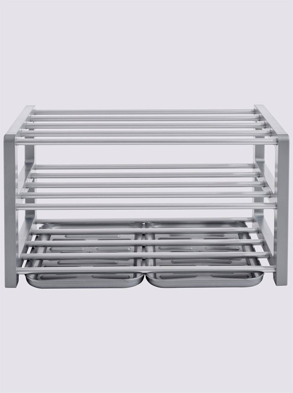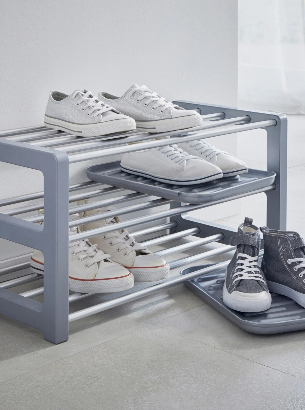 Schuhregal Made in Germany. Aus Aluminium und Kunststoff. Stapelbar. Für ca. 9 Paar Schuhe. Inkl. 2 Schmutzfangschalen.