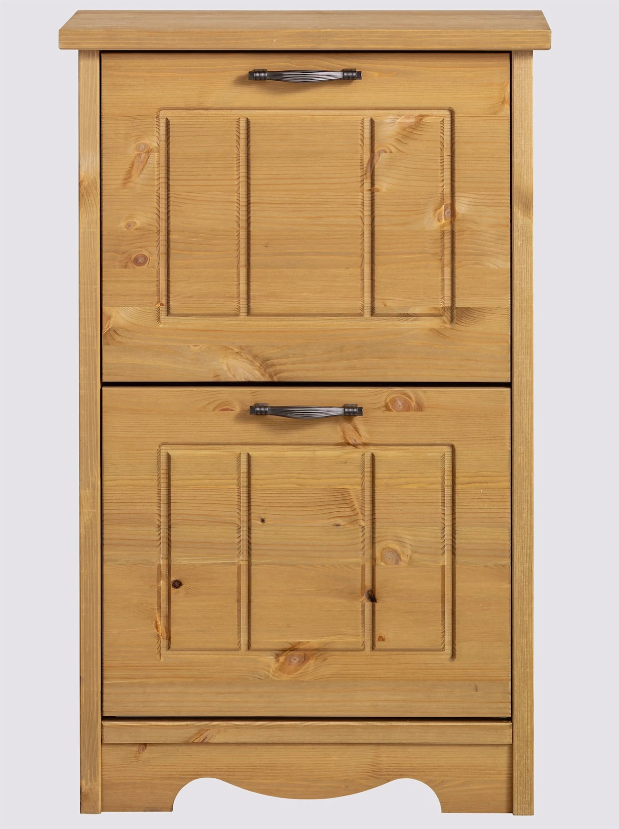 Schuhschrank Aus massivem Kiefernholz aus Lettland. Fronten mit dekorativen Ausfräsungen, Griffe aus Metall. Pro Klappe Platz für ca. 2 Paar Schuhe. Wandmontage möglich. Selbstmontage.