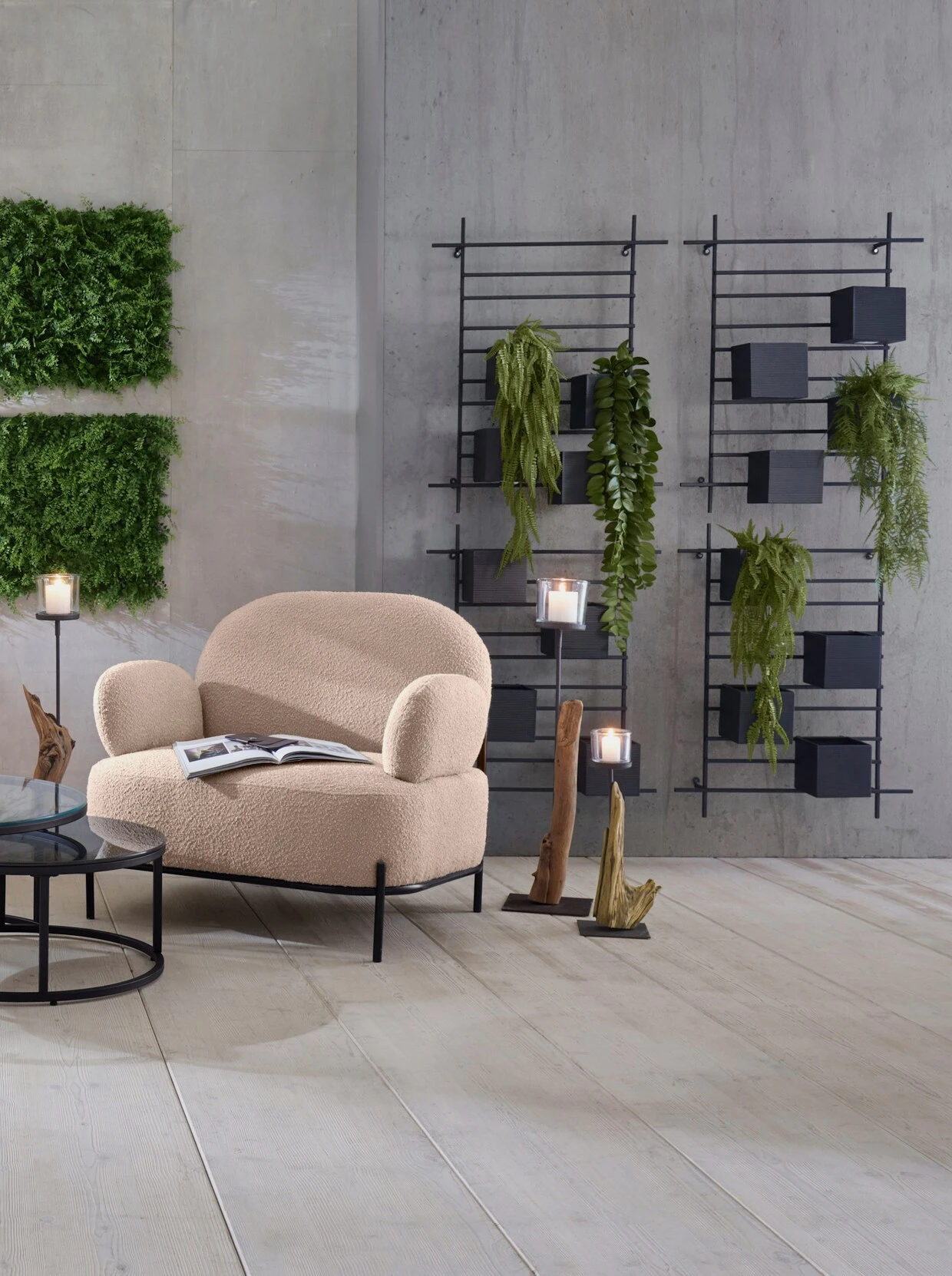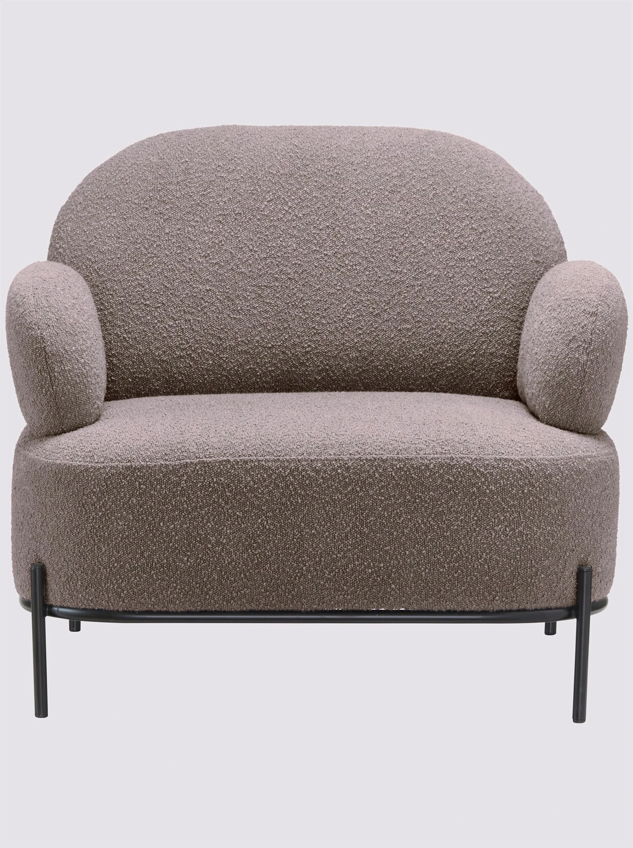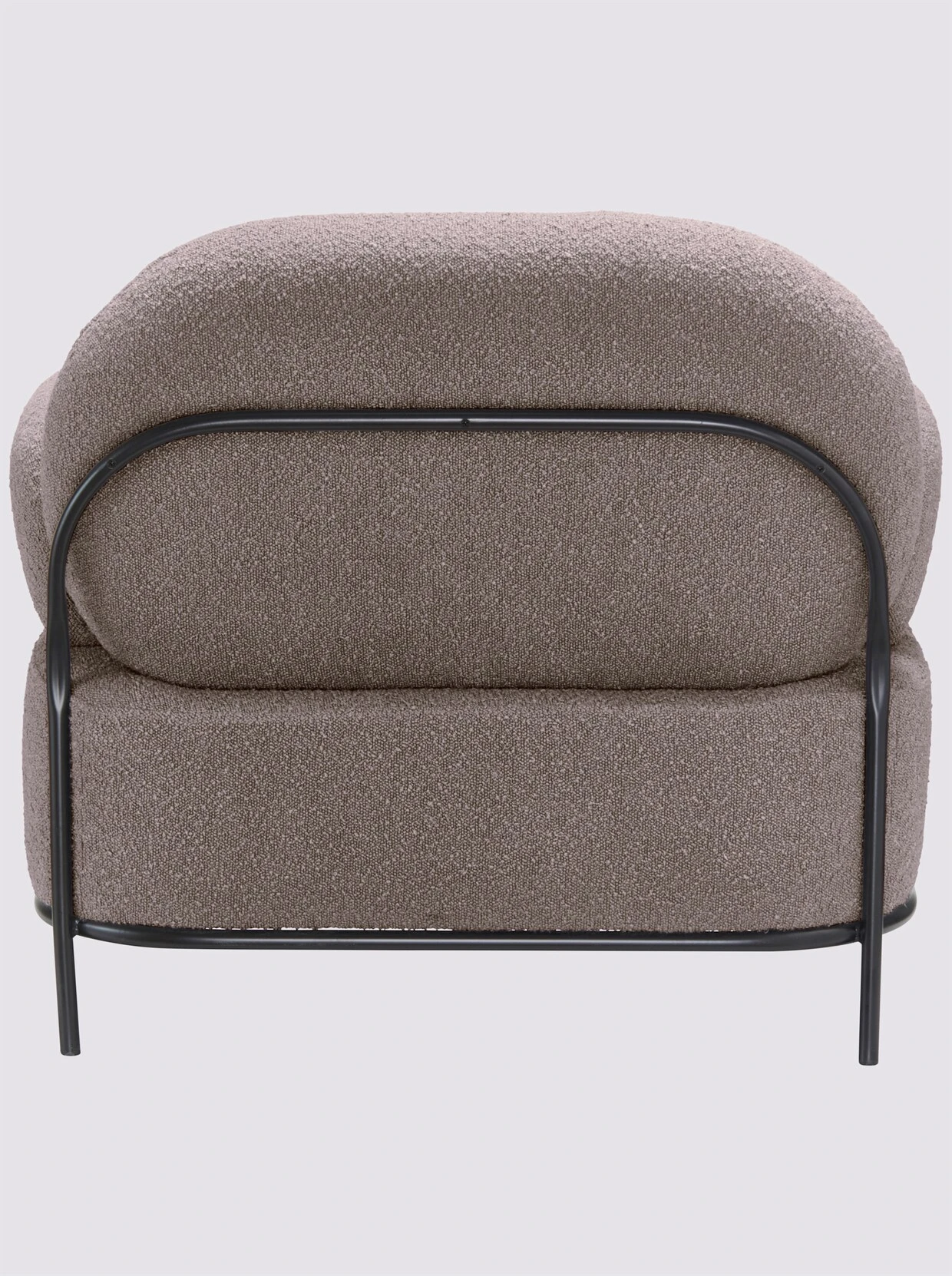 Sessel Bezug in Bouclé-Qualität. Fester Schaumstoffkern. Grundgestell aus Kiefernholz aus China. Außengestell und Füße aus Metall schwarz pulverbeschichtet. Sitz-H/B/T ca. 40/63/53 cm. Teilmontage.