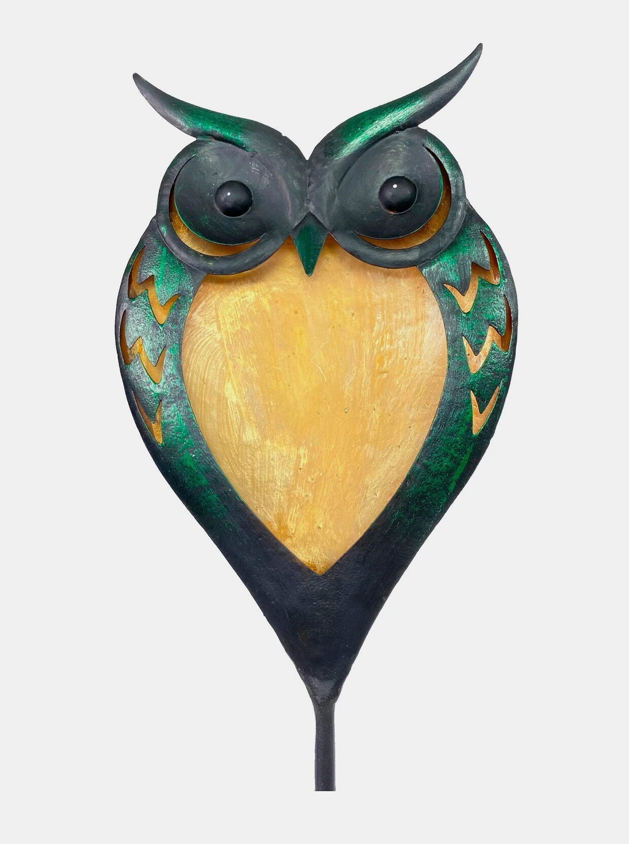 Solarstecker Eule. Ein schöner Blickfang für den Außenbereich! Aus Metall und Polyresin gefertigt, lackiert und antikisiert. Mit fest verbauter warmweißer LED und AAA-NiMH-Akku.
