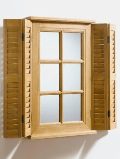 Spiegelfenster Aus massivem Pinien- und Pappelholz und MDF-Holzfaserplatte, naturbelassen oder weiß lackiert, gewischt und antikisiert. Spiegelfläche mit Sprossen. Fensterläden zuklappbar. Handgearbeitet, leichte Abweichungen möglich.