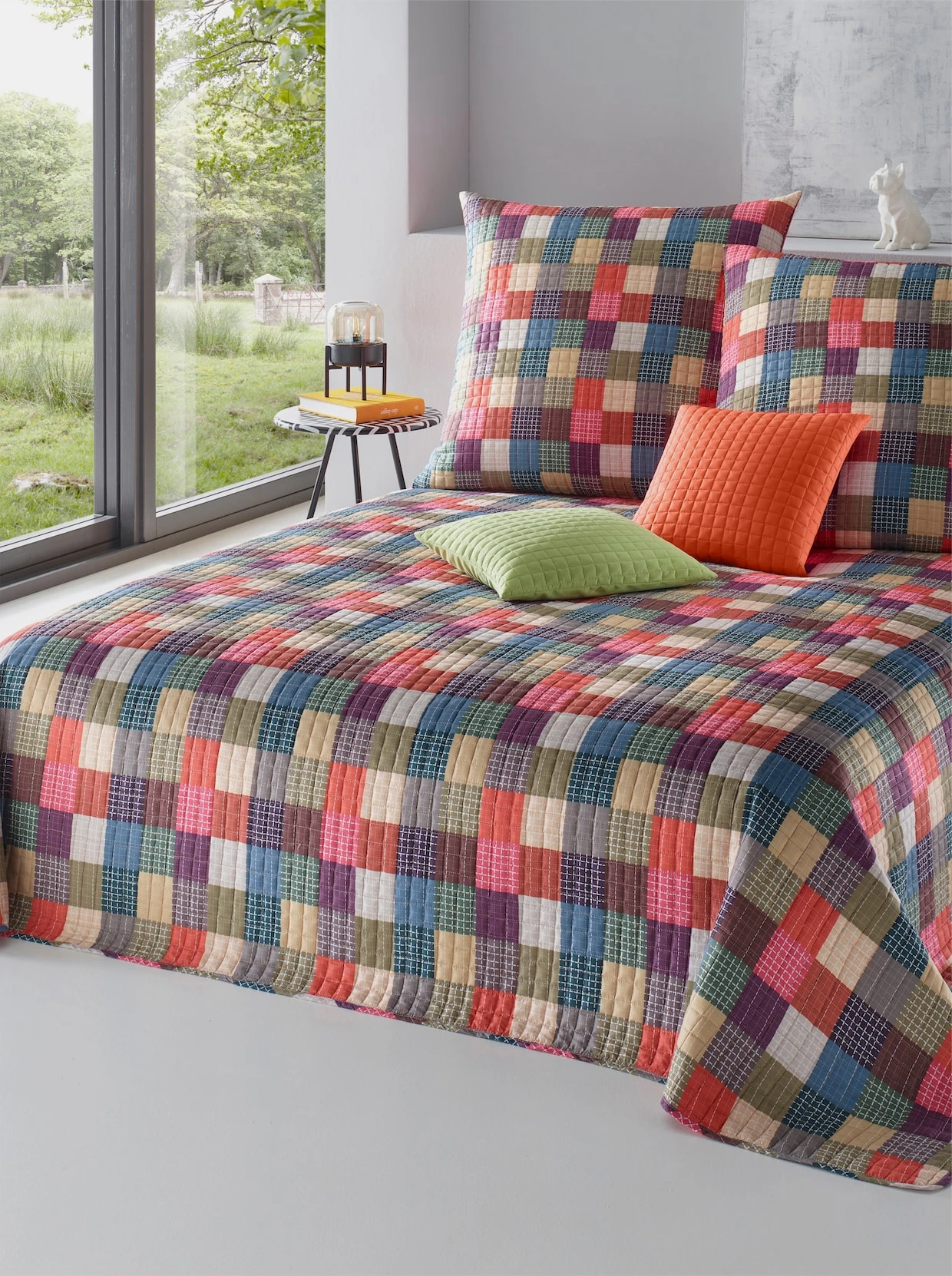 Tagesdecke Digitaldruck. Leicht wattiert. Aufwendige Steppung in Kästchen-Optik. Kissenhüllen mit Reißverschluss. Maßinfos im Internet.