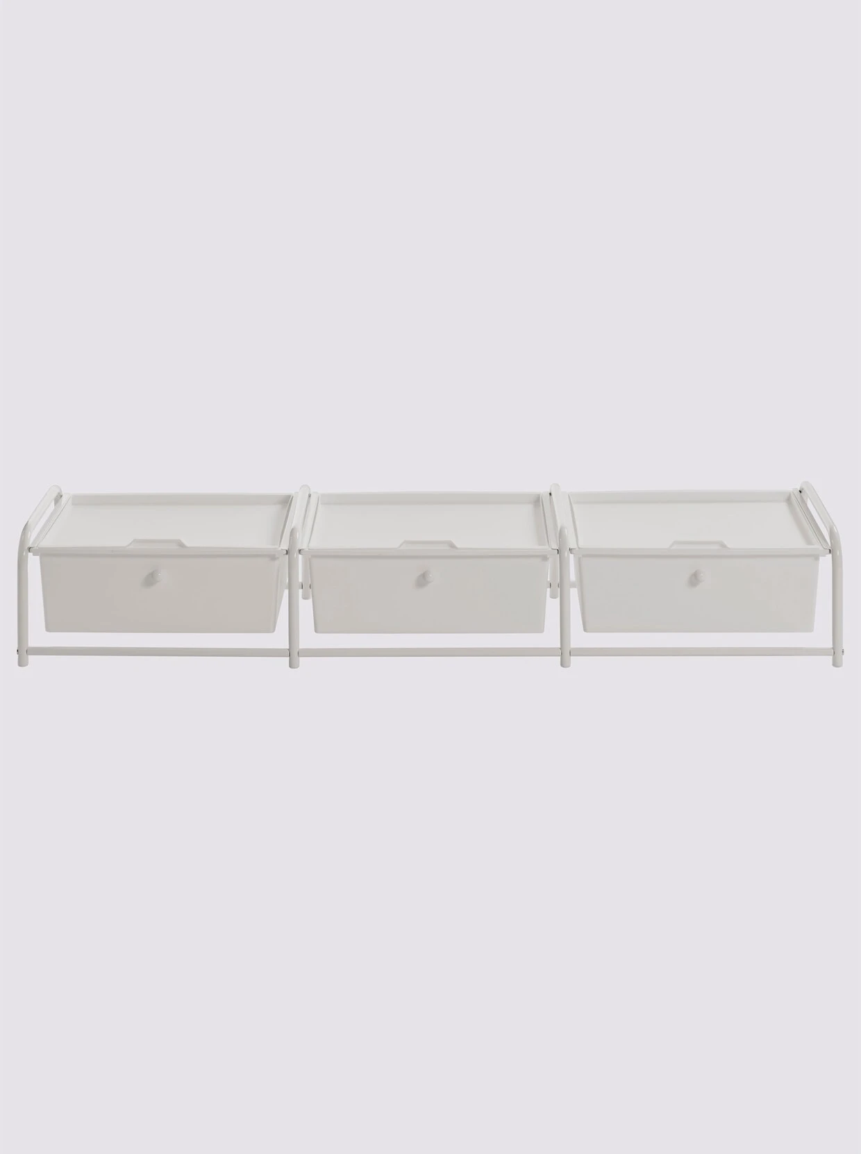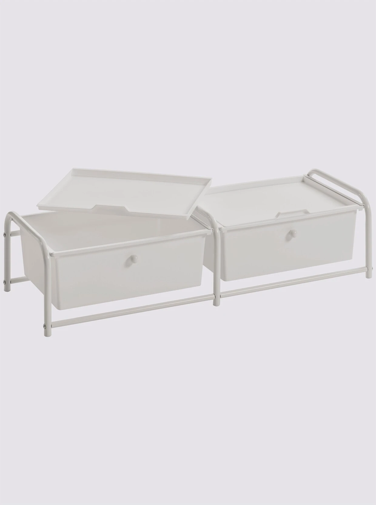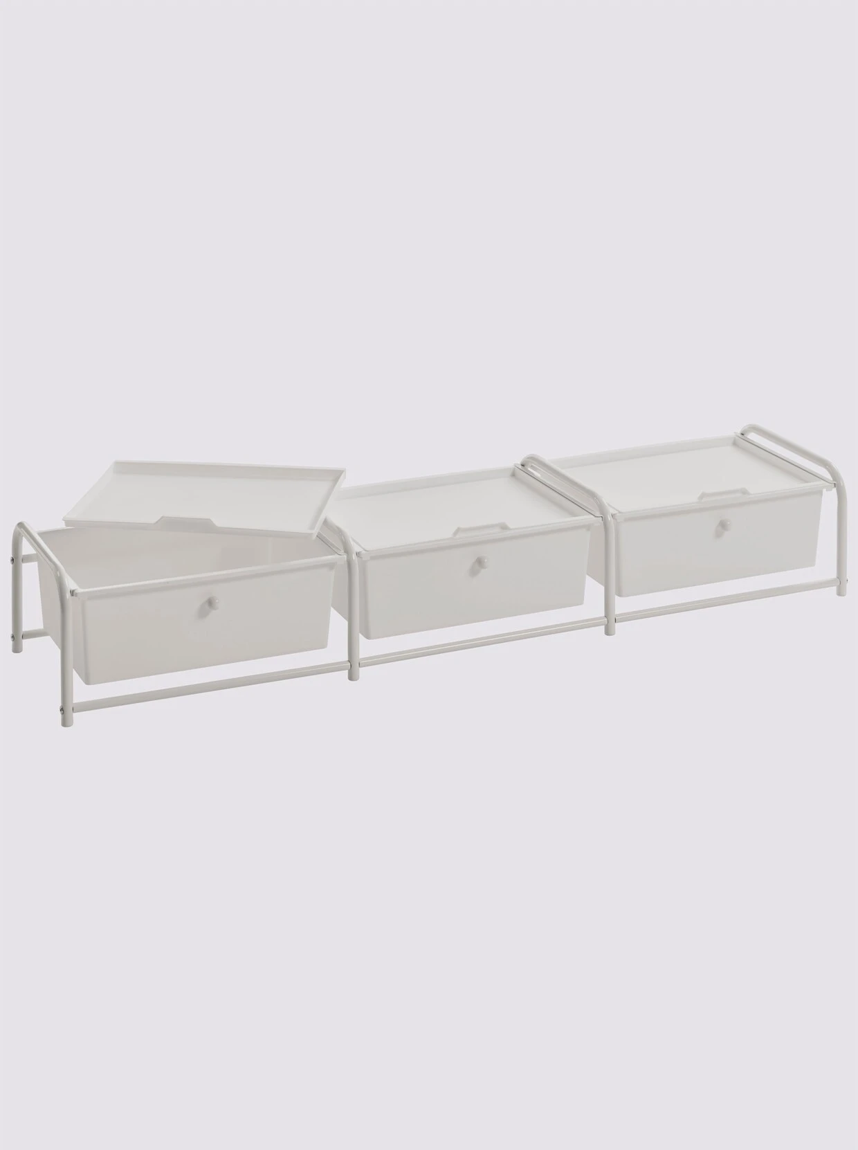 Unterbett-Kommode Gestell aus Metall, weiß lackiert. Schubladen aus weißem Kunststoff, auf Metallschienen. Komplett herausziehbar. Deckel abnehmbar. Mit Knopfgriffen. Selbstmontage.