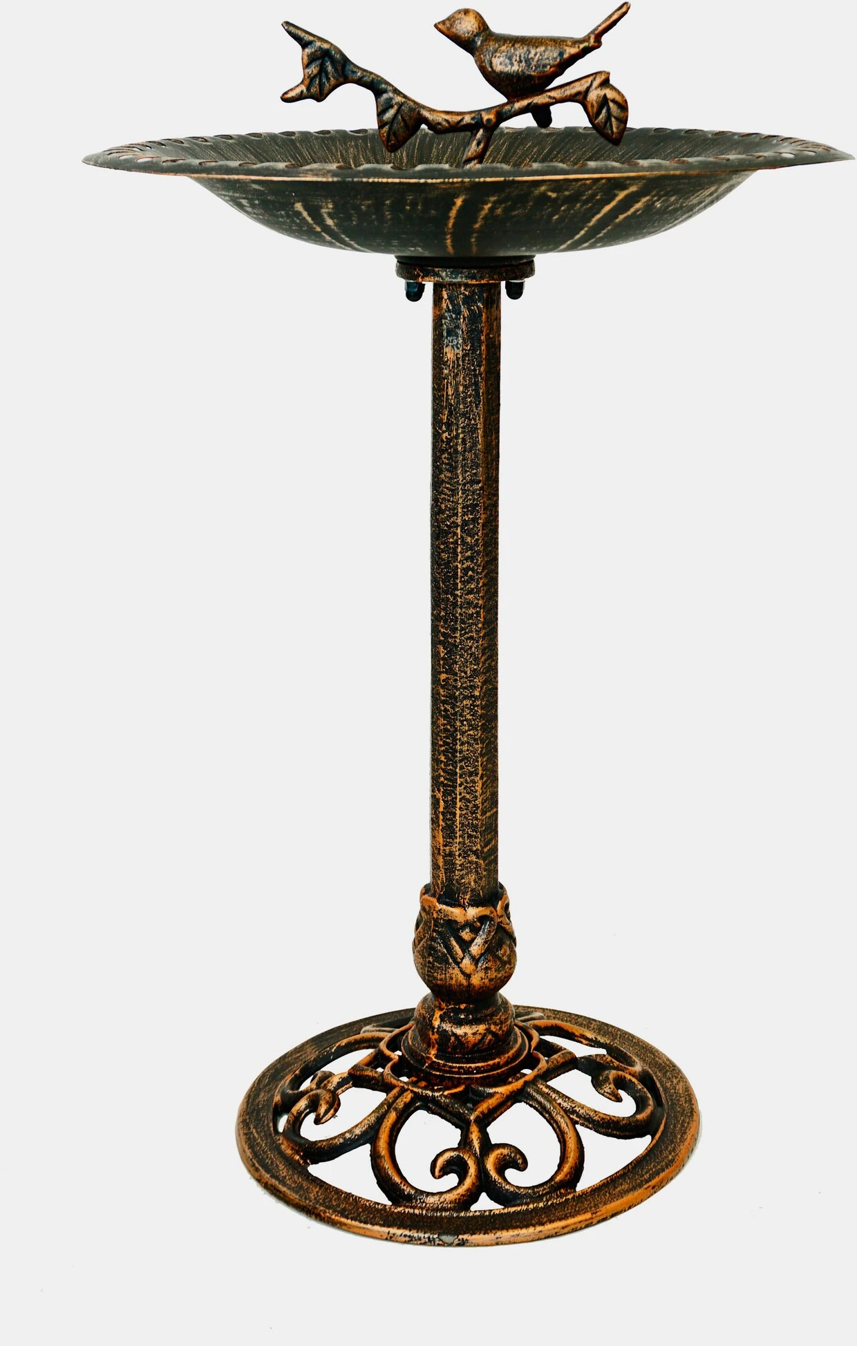 Vogeltränke In hochwertiger Antik-Optik. Schale aus Metall, Ständer aus Aluminiumguss gefertigt, grün-schwarz bzw. kupferfarben-schwarz patiniert und antikisiert. Selbstmontage.