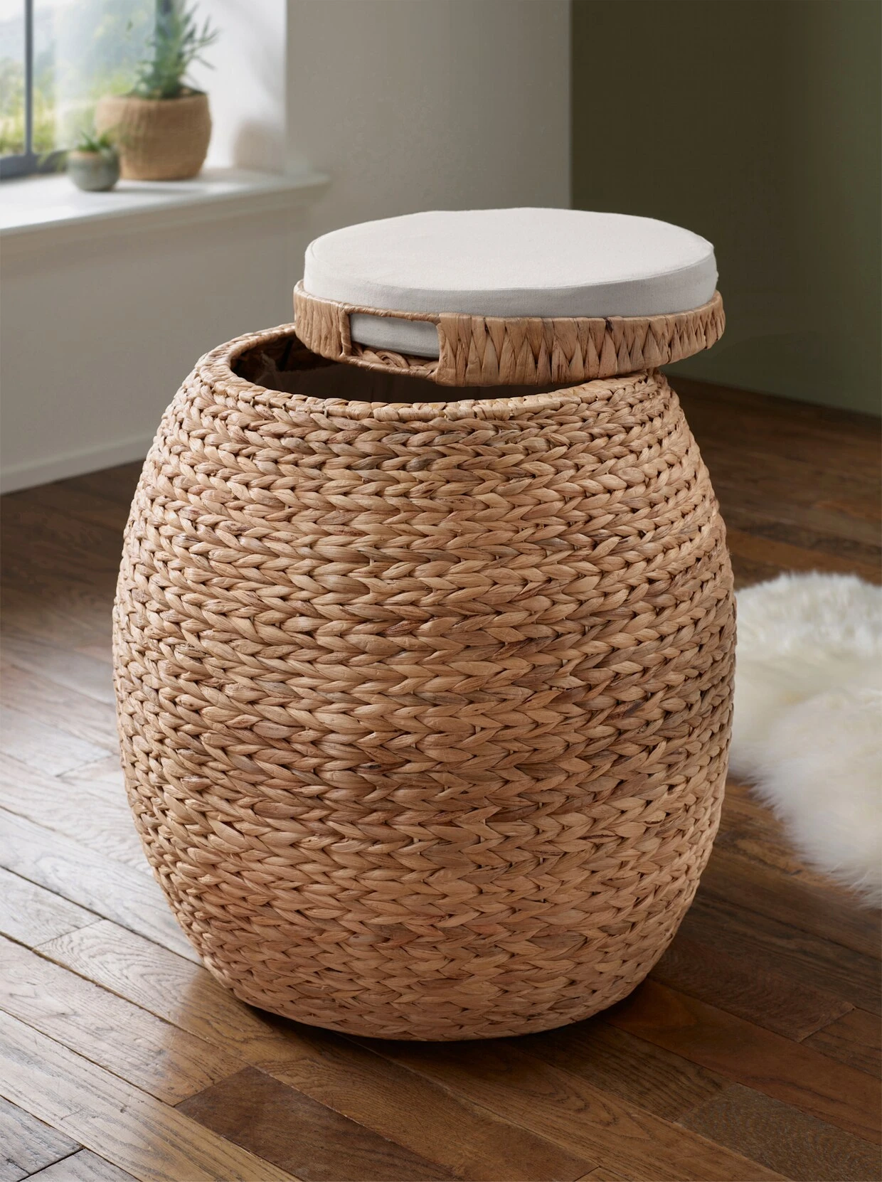 Wäschesammler Geräumiger Wäschesammler und Hocker in einem. Metallgestell mit Wasserhyazinthe umflochten. Abnehmbarer Deckel mit Schaumstoffkissen und waschbarem Baumwollbezug. Mit großem Wäschesack aus Baumwolle, herausnehmbar und waschbar. Aufgebaut.