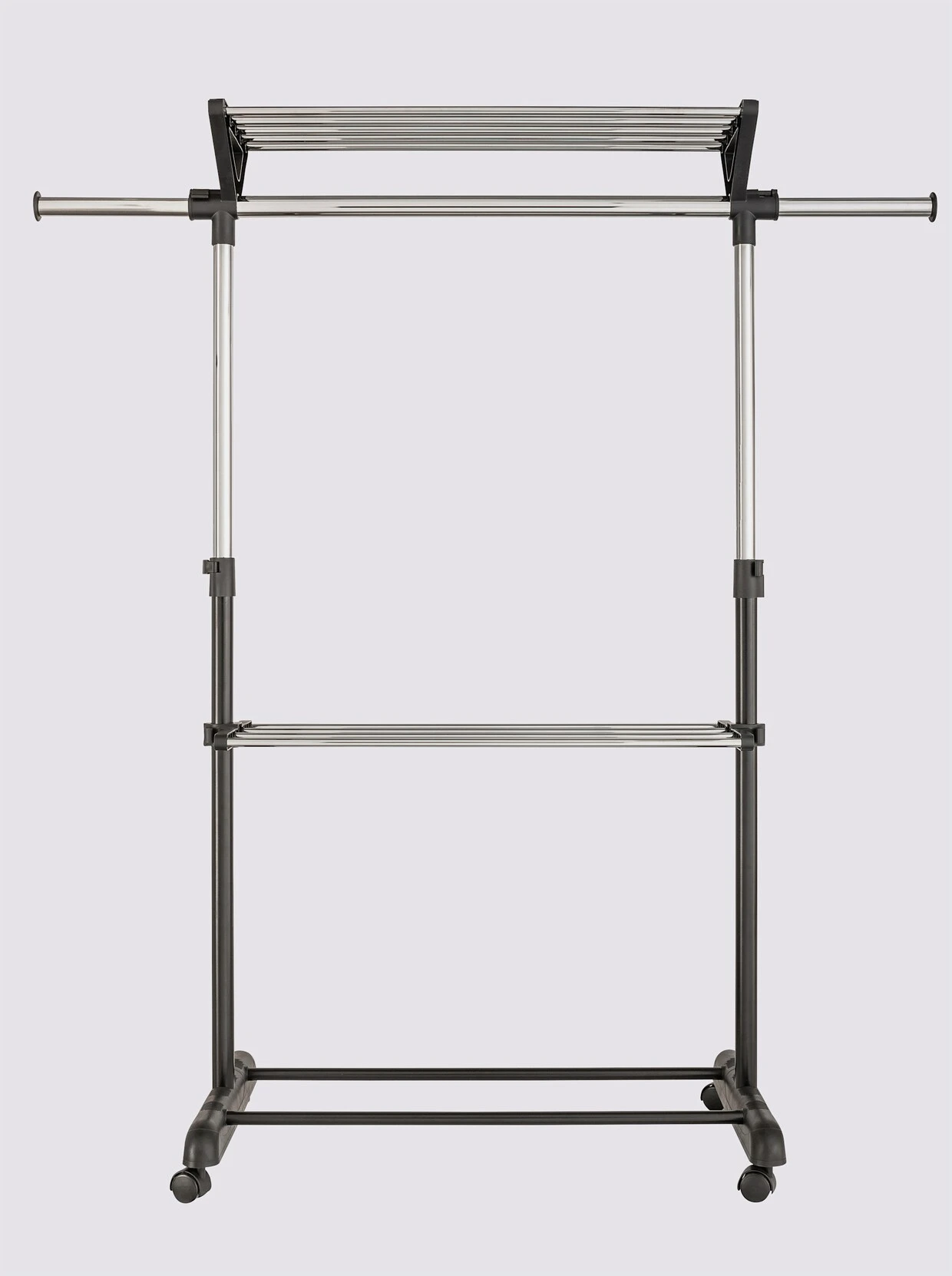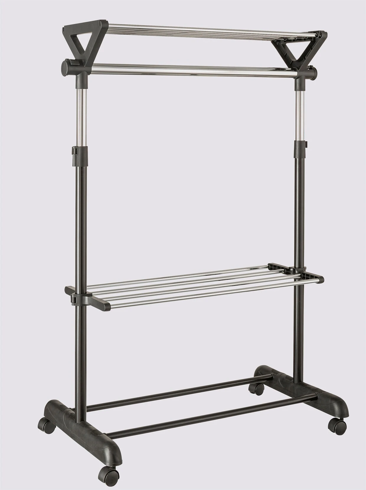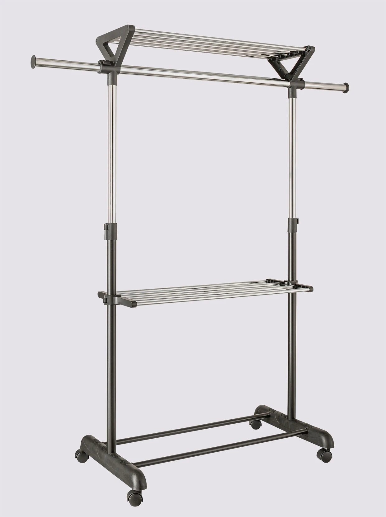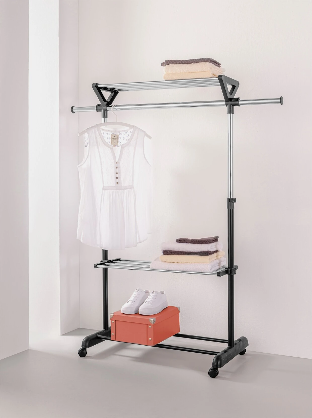 Wäscheständer Variabler Ständer teils aus Metall, pulverbeschichtet oder verchromt, teils aus Kunststoff. Mit ausziehbarer Kleiderstange und höhenverstellbarem Regalboden. Mit 4 Rollen zum leichten Fortbewegen. Selbstmontage.