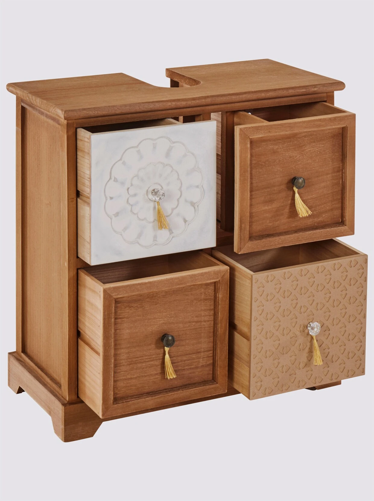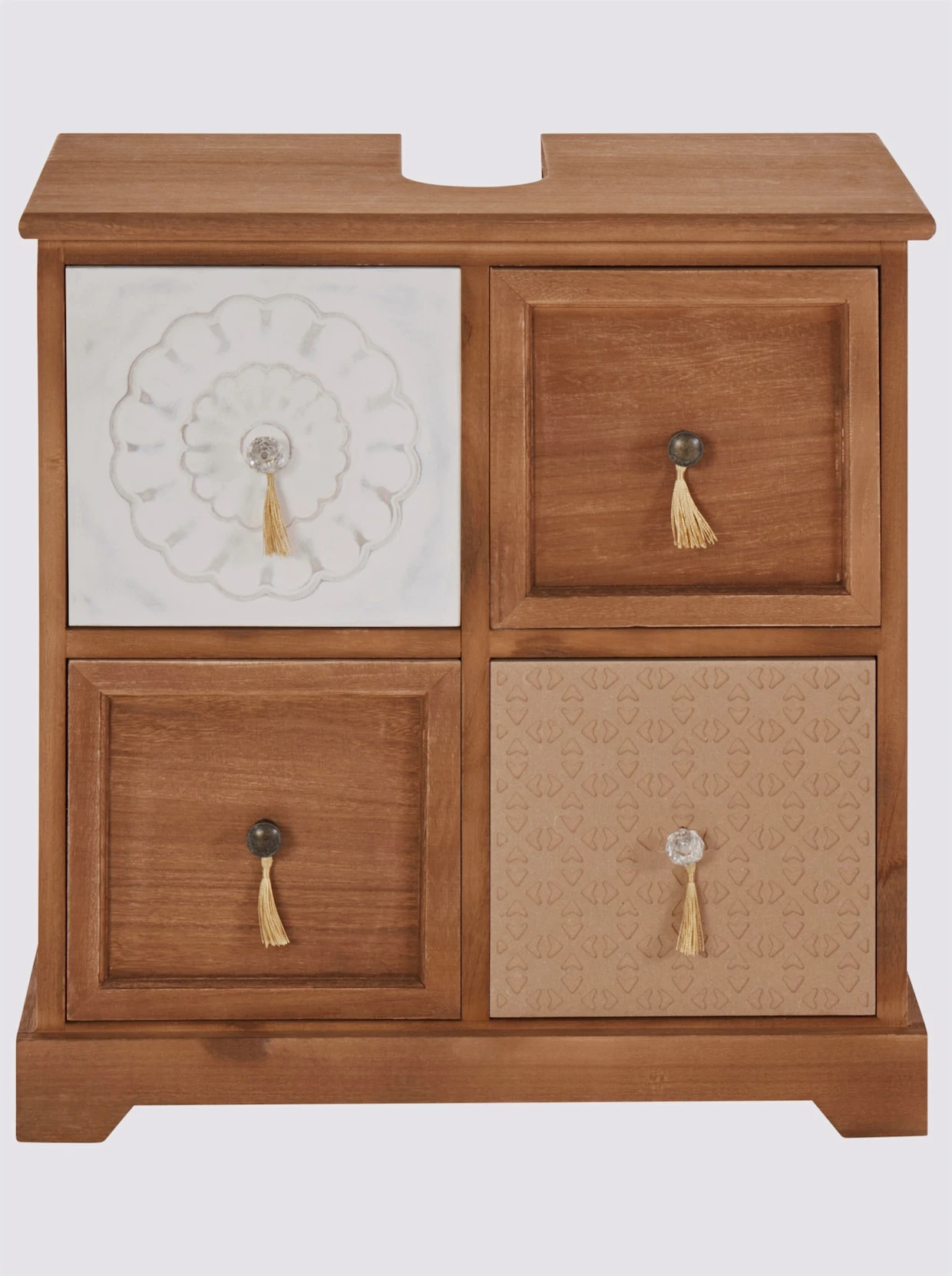 Waschbecken-Unterschrank Aus massivem Paulowniaholz aus China. Mit unterschiedlichen Schubladenfronten und Griffvarianten. Schubladen auf Holzführung. 4 Kunststoffnoppen, die den Bodenschutz gewährleisten.