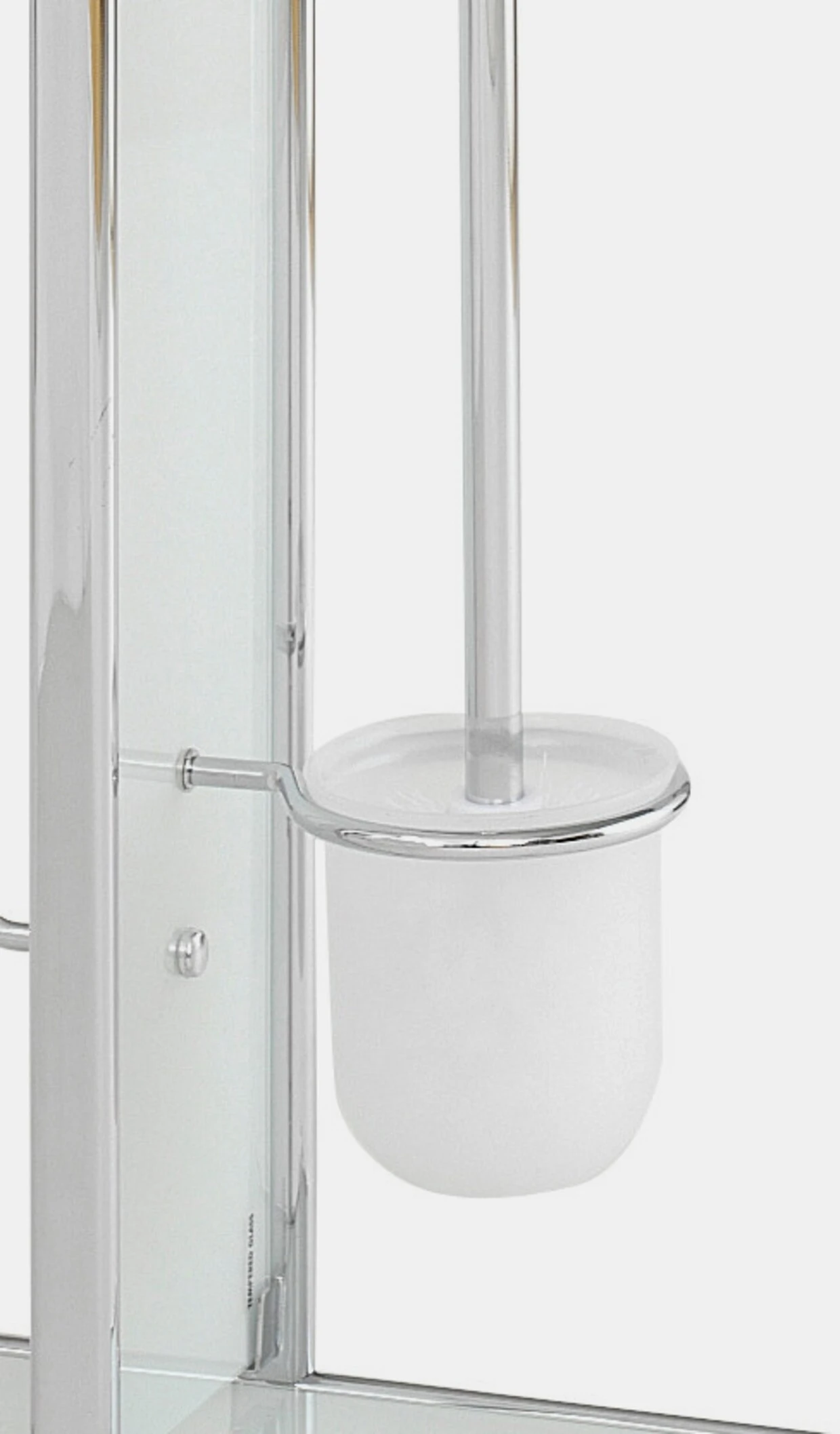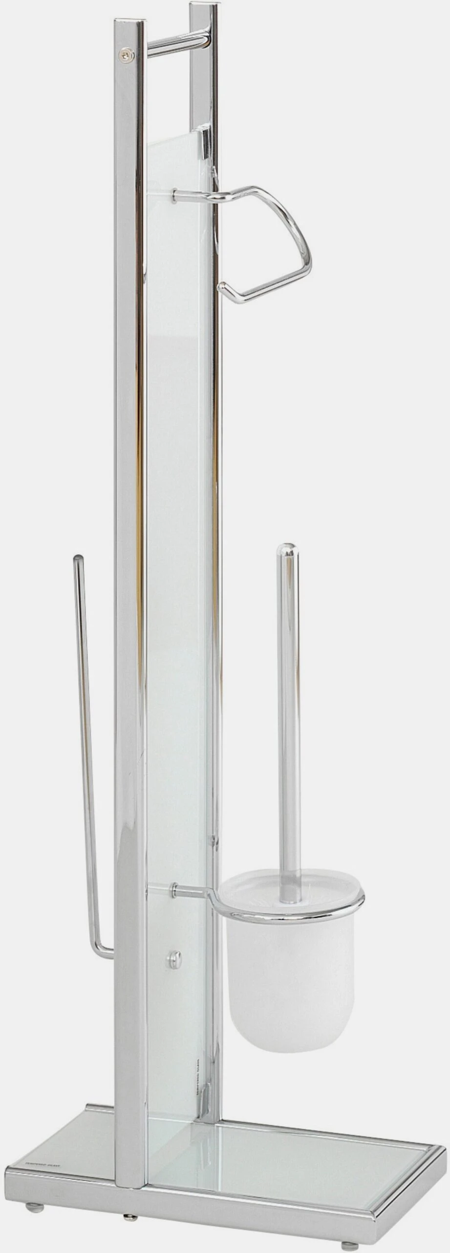 WC Ständer Verchromtes Metall und Glas. Vorn Rollen- und WC-Bürstenhalter, hinten mit Halter für 2 Ersatzrollen. Selbstmontage.