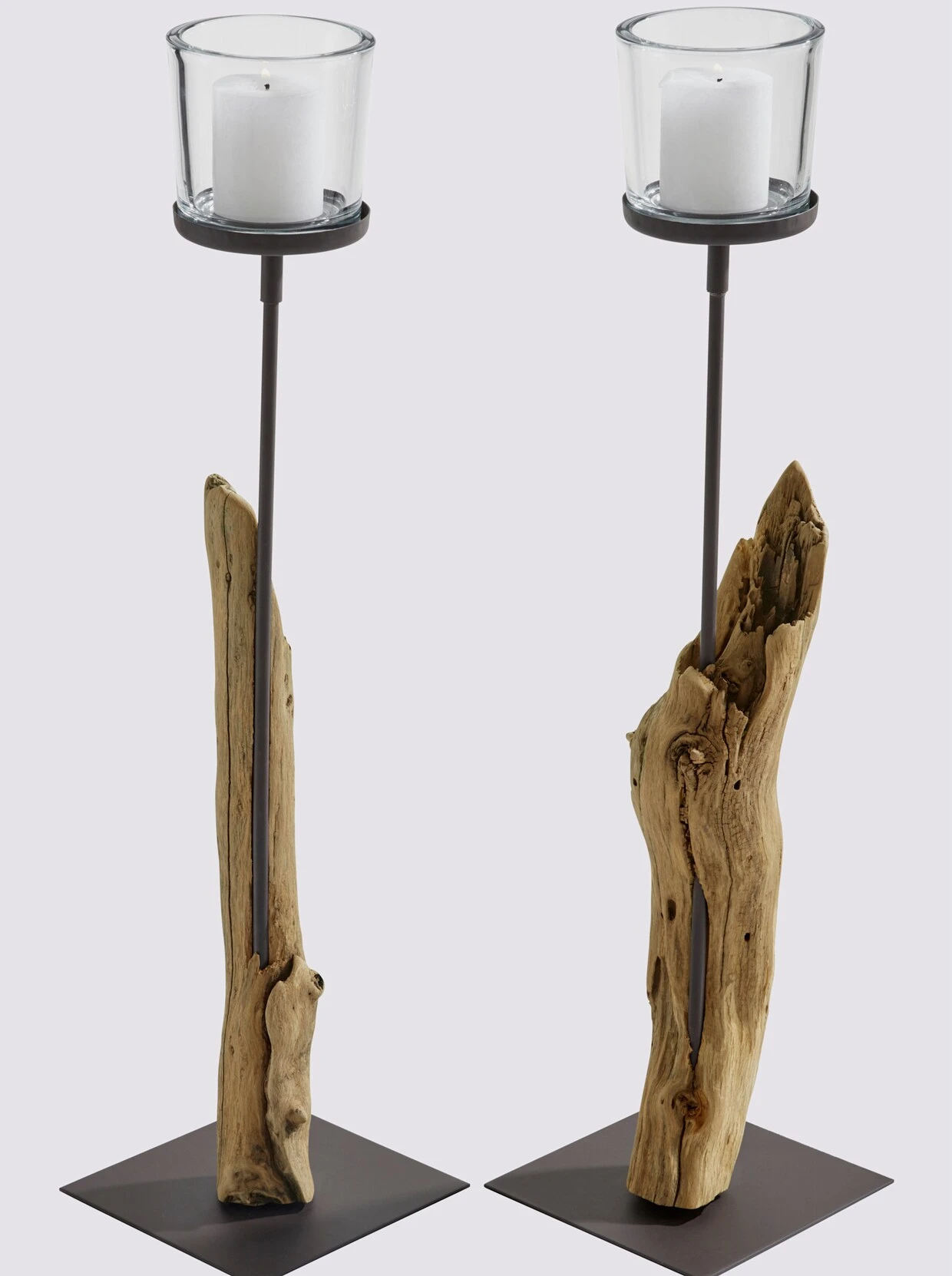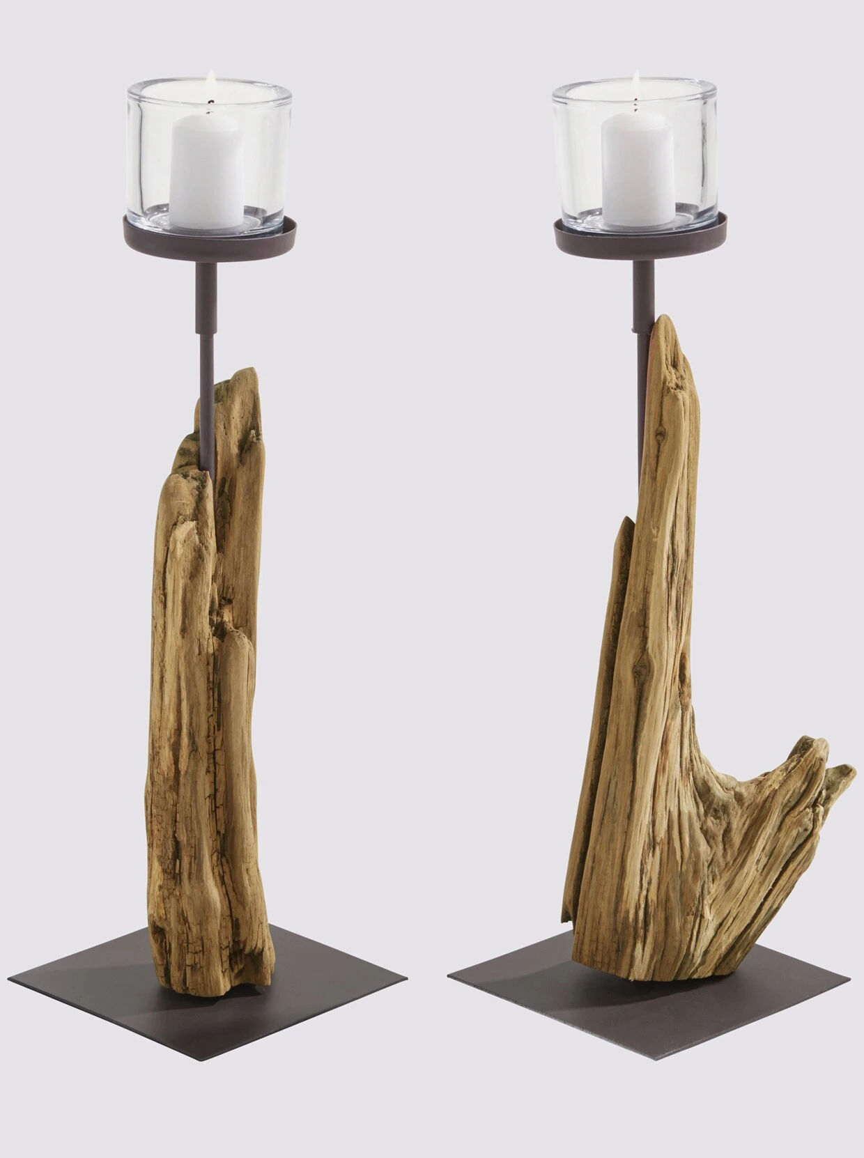 Windlicht Aus recyceltem Holz. Fußplatte und Metallhalterung braun lackiert. Windlicht klein: Glaseinsatz-H/ø ca. 8/9 cm. Windlicht groß: Glaseinsatz-H/ø ca. 12,5/13 cm. Farb-, Form- und Maßabweichungen möglich. Ohne Teelichter bzw. Kerzen.