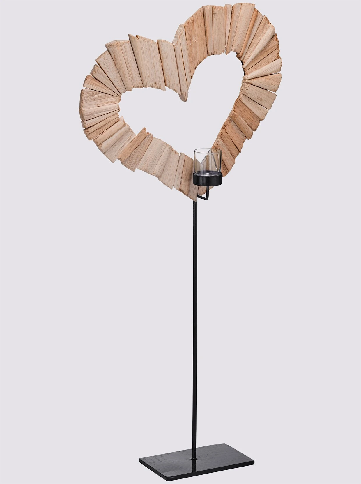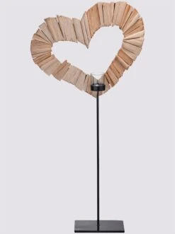 Windlicht Kunsthandwerklich gefertigt. Jedes Teil fällt individuell aus. Abweichungen möglich. Gestell aus Metall, schwarz lackiert. Herz aus Albasiaholz. Windlichteinsatz aus Glas.