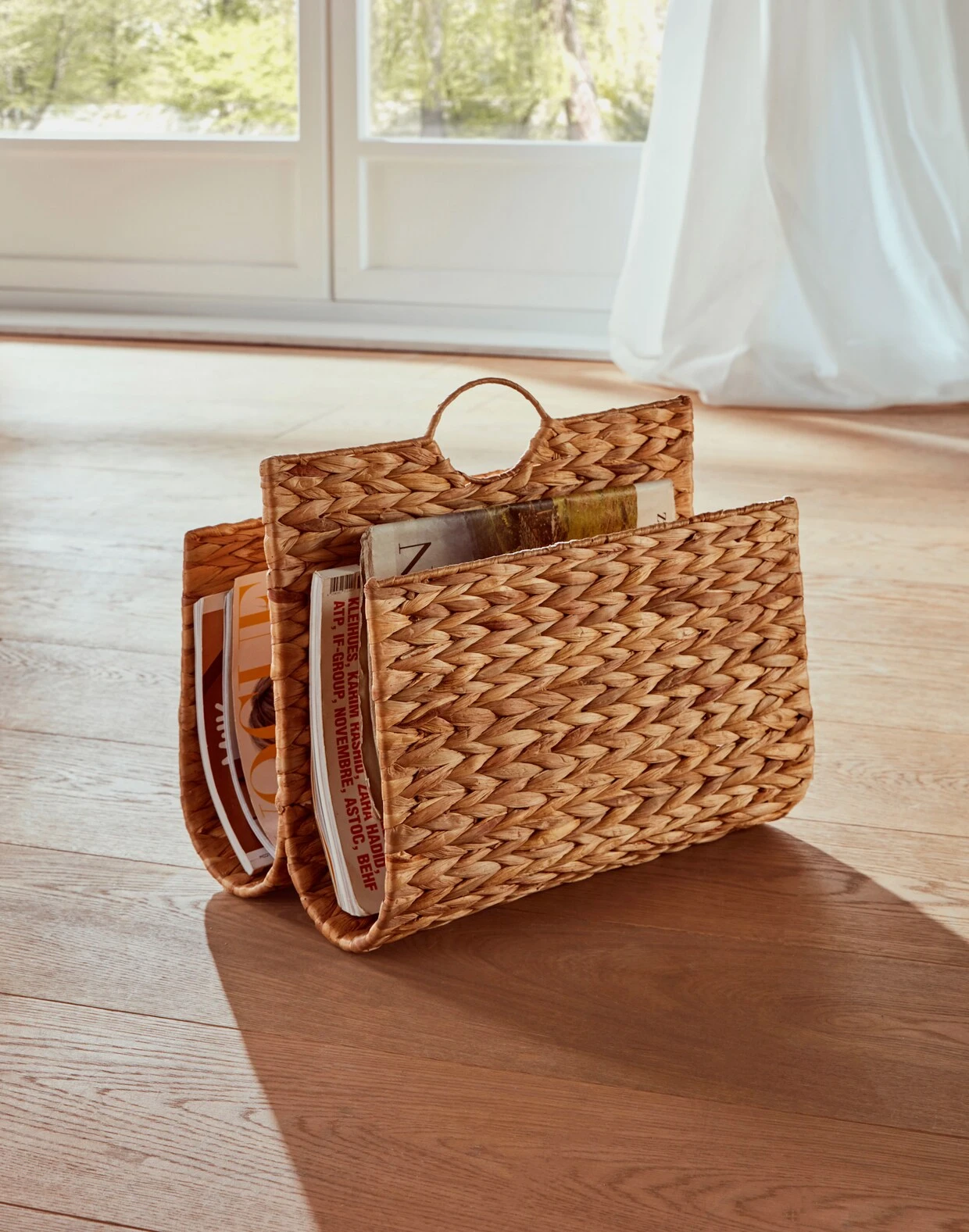 Zeitungssammler Aus Wasserhyazinthe von Hand geflochten. Abweichungen möglich. Stabiles Metallgestell. 2 Fächer. Mit Tragegriff.