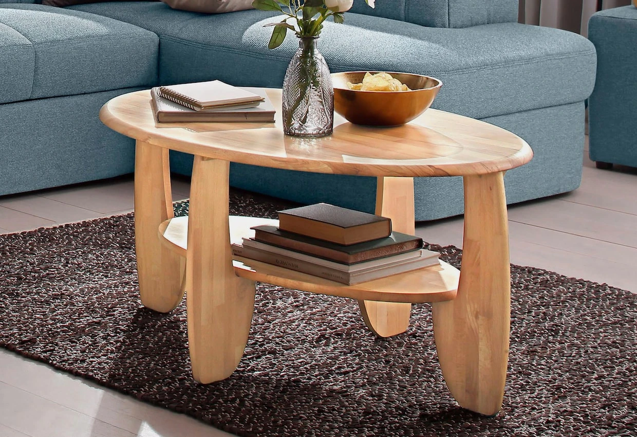Wunderschöner Couchtisch aus massiver, geölter FSC®-zertifizierter Kernbuche oder Wildeiche. Das Holz zeichnet sich durch eine kräftige Färbung und natürliche Wuchsmerkmale aus. Mit Massivholzplatte mit gerundeten Kanten und Ablage.