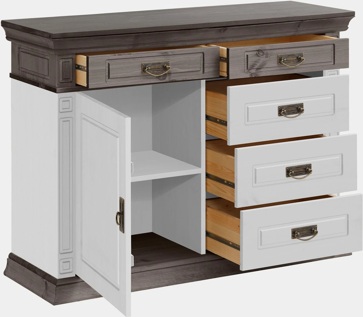 Kommode Hochwertige Verarbeitung aus massivem Kiefernholz, geölt. Mit messingfarbenen Ringgriffen. 2 kleine Schubladen oben, Innenmaß jeweils H/B/T ca. 8/42/30 cm, 3 Schubladen seitlich, Innenmaß jeweils H/B/T ca. 13/42/30 cm und 1 Holztür, dahinter 1 fester Einlegeboden. Gesamt-H/B/T ca. 83/112/39 cm. Selbstmontage.