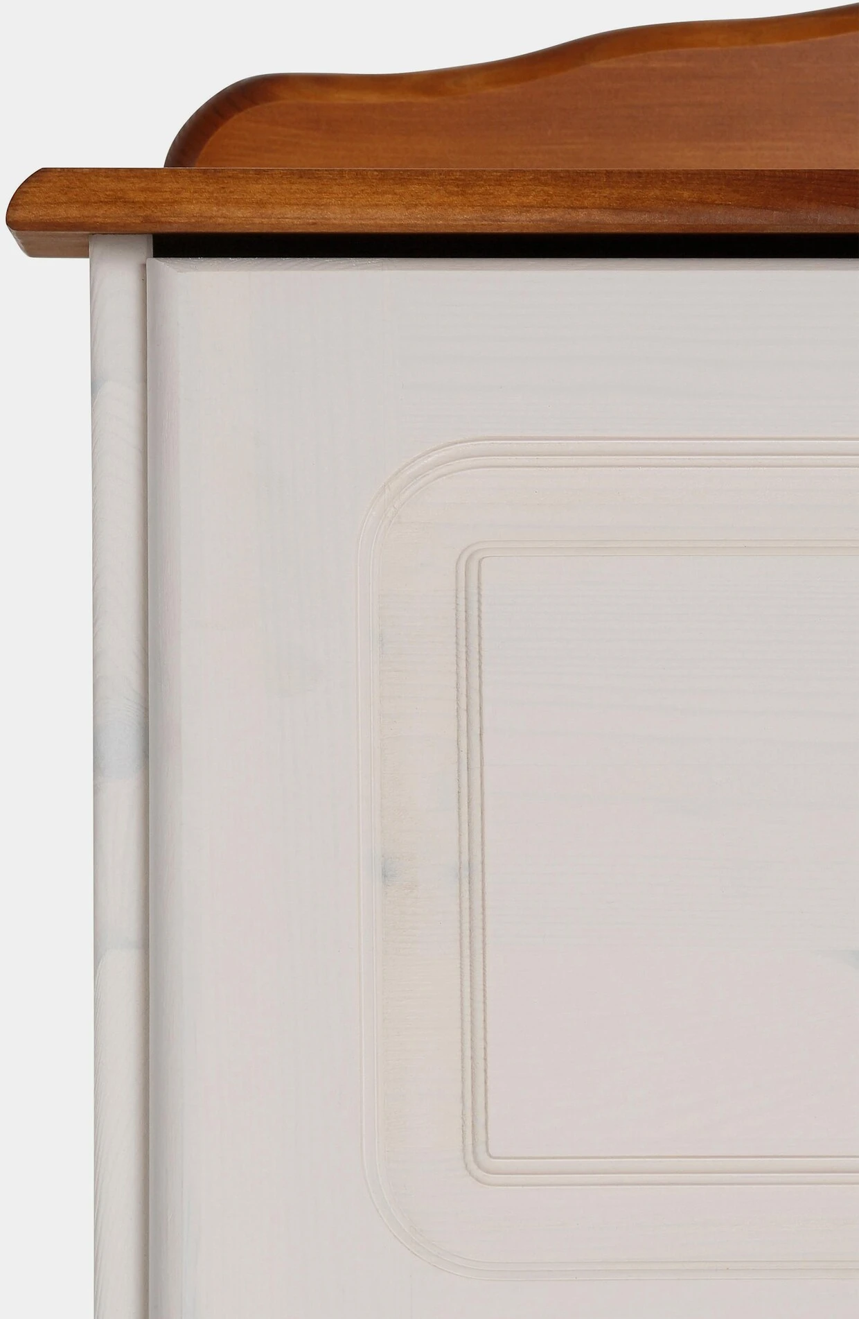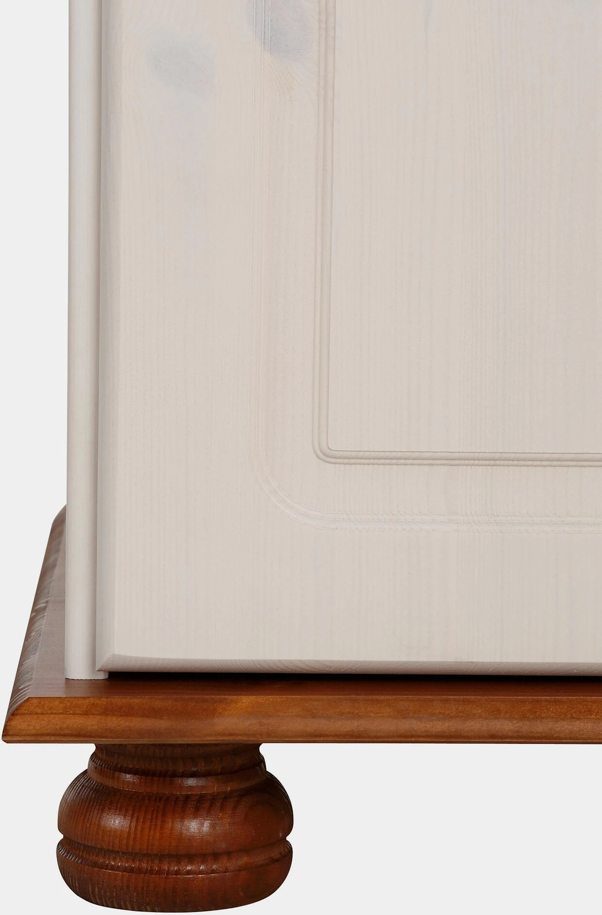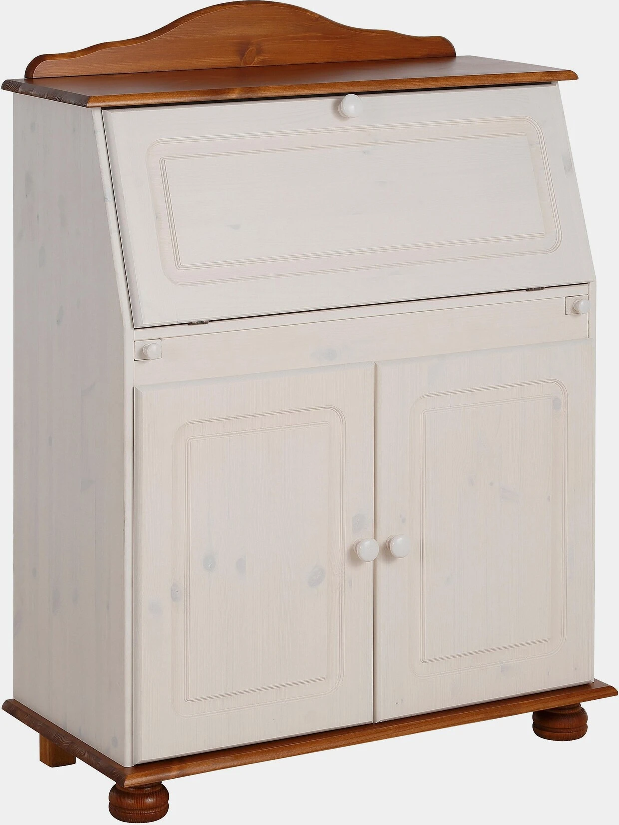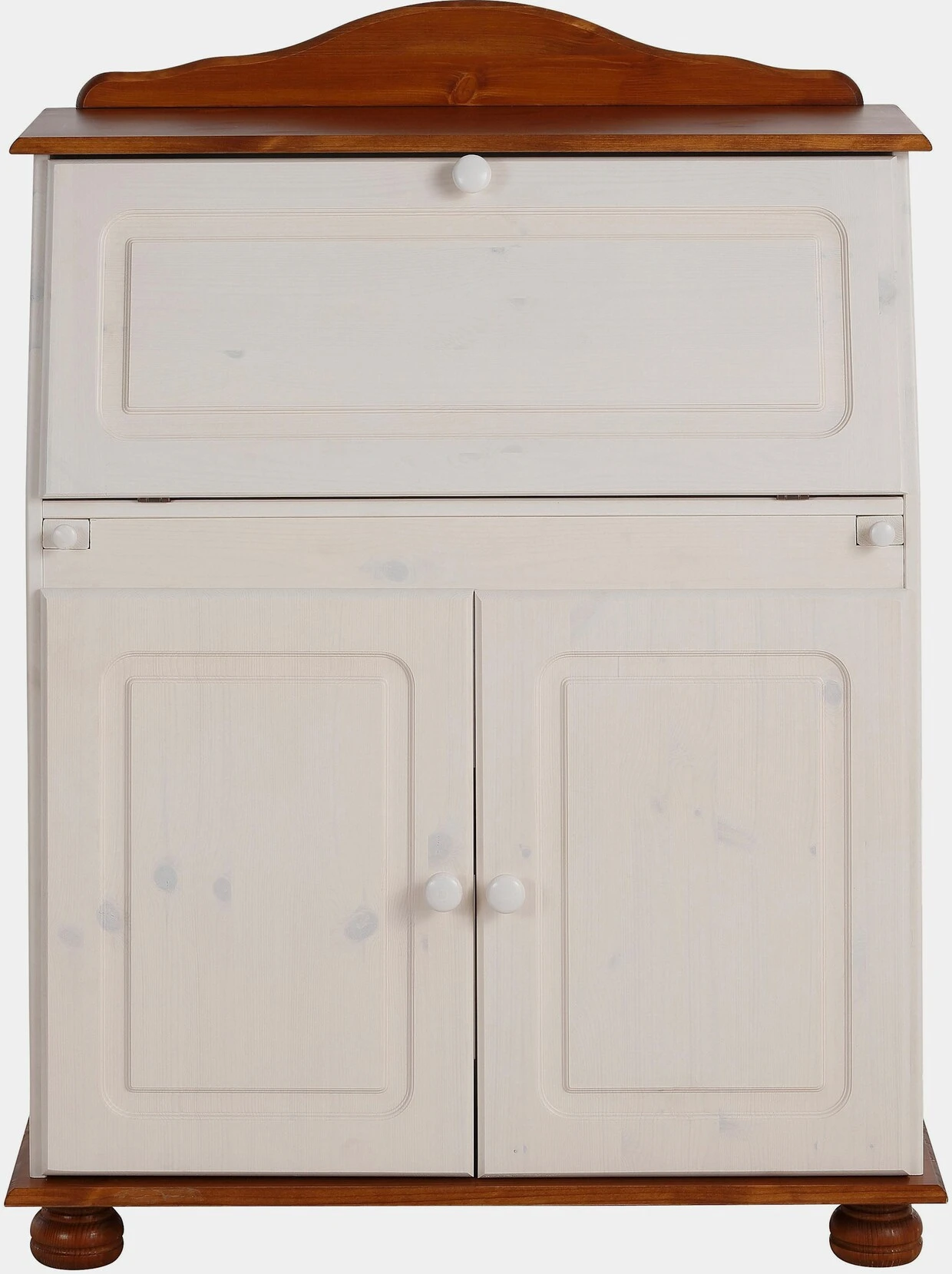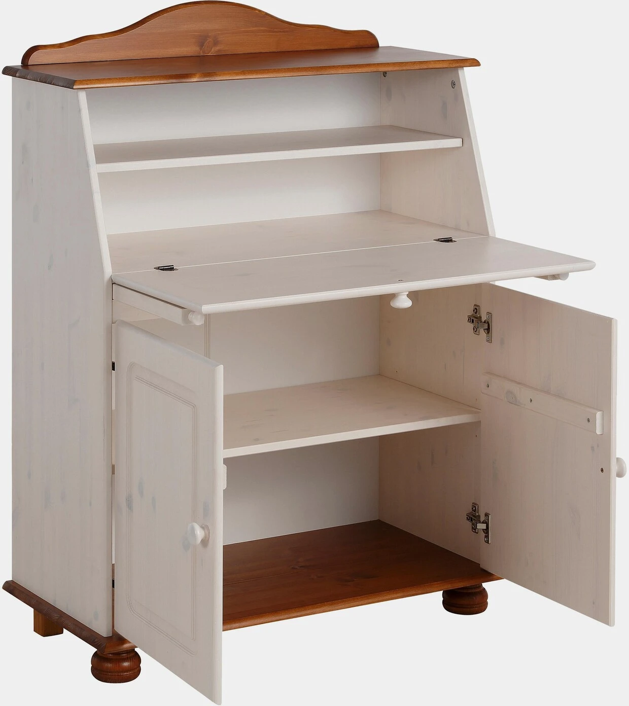 Dieser klassische Sekretär im Landhausstil ist ein schöner Blickfang in Ihrem Wohnzimmer! Die Möbel bestehen aus FSC®-zertifiziertem, massivem Kiefernholz, welches aus verantwortungsvoll bewirtschafteten Wäldern stammt. Zusätzlich sind diese Landhaus-Wohnmöbel mit dem Eco-Republic Logo gekennzeichnet. Hinter diesem Zeichen verbergen sich unsere nachhaltigen Produkte aus natürlichen Rohstoffen, für die Erhaltung der Natur, auch noch für kommende Generationen. Der Sekretär ist wahlweise in gelaugt/geölt, dunkelbraun lackiert oder weiß lasiert erhältlich. Die Sichtbarkeit der Holzstruktur und Äste sind Teil der individuellen Ausstrahlung jedes einzelnen Möbelstückes. Der Sekretär ist auch für kleinere Räume geeignet. Die geöffnete Klappe ist als Schreibfläche nutzbar. Lassen Sie sich von der Natürlichkeit des Holzes überzeugen und schaffen Sie ein neues Stauraumwunder in Ihrem Wohnzimmer! Artikeldetails: Fächer: oben hinter der Klappe 2 Fächer, unten hinter den Türen 2 Fächer (Boden lose und verstellbar). Maße: Gesamt (B/T/H): 82/39/107 cm, Schreibfläche (B/T): 75/30 cm, Höhe bis zur Schreibfläche: 66 cm, Fachinnenmaße oben (B/T/H): je 73/25/14 cm, Fachinnenmaße unten (B/T/H): je 75/35/25,5 cm, Höhe der Füße: 6,5 cm, Holzeinlegeböden bis 20 kg belastbar. Material: Korpus/Front: Kiefer massiv, Rückwand: MDF, Einlegeböden: Kiefer massiv, Füße: Kiefer massiv, Griffe/Knöpfe: Kiefer massiv. Weitere Hinweise: Pflegehinweis: lackierte/Lasierte Möbel: Die Oberfläche lässt sich am besten mit einem mäßig feuchten Tuch säubern. Achtung: Ätzende oder lösungsmittelahltige Reinungsmittel oder Politur dürfen nicht verwendet werden. Geölte Möbel: Die Oberfläche ist mit einem rein biologischem Öl behandelt. Um diesen natürlichen Glanz zu bewahren, wird eine gelegentliche Nachbehandlucng mit geeignetem Möbelöl empfohlen. Dabei sollten die Möbel mit einem fusselfreien Tuch poliert werden., Wissenswertes: Selbstmontage mit Aufbauanleitung. Die Möbel wurden aus naturbelassenem Holz hergestellt. Auch die Holzbeschaffenheit und -struktur, wie zum Beispiel kleinere Äste, sind Teil der individuellen Ausstrahlung jedes einzelnen Möbelstücks. Der typische Holzgeruch ist hierbei immer ein Qualitätsbeweis. Der Lack ist nicht deckend. Die Holzstruktur und Maserung bleibt immer sichtbar. FSC®-zertifiziertes Massivholz: Kiefer Das Label des FSC® weist nach, dass Sie mit dem Kauf dieser Produkte vorbildlich Waldwirtschaft – nach den strengen ökologischen, sozialen und wirtschaftlichen Standards des Forest Stewardship Council® – fördern und die Waldressourcen schonen.