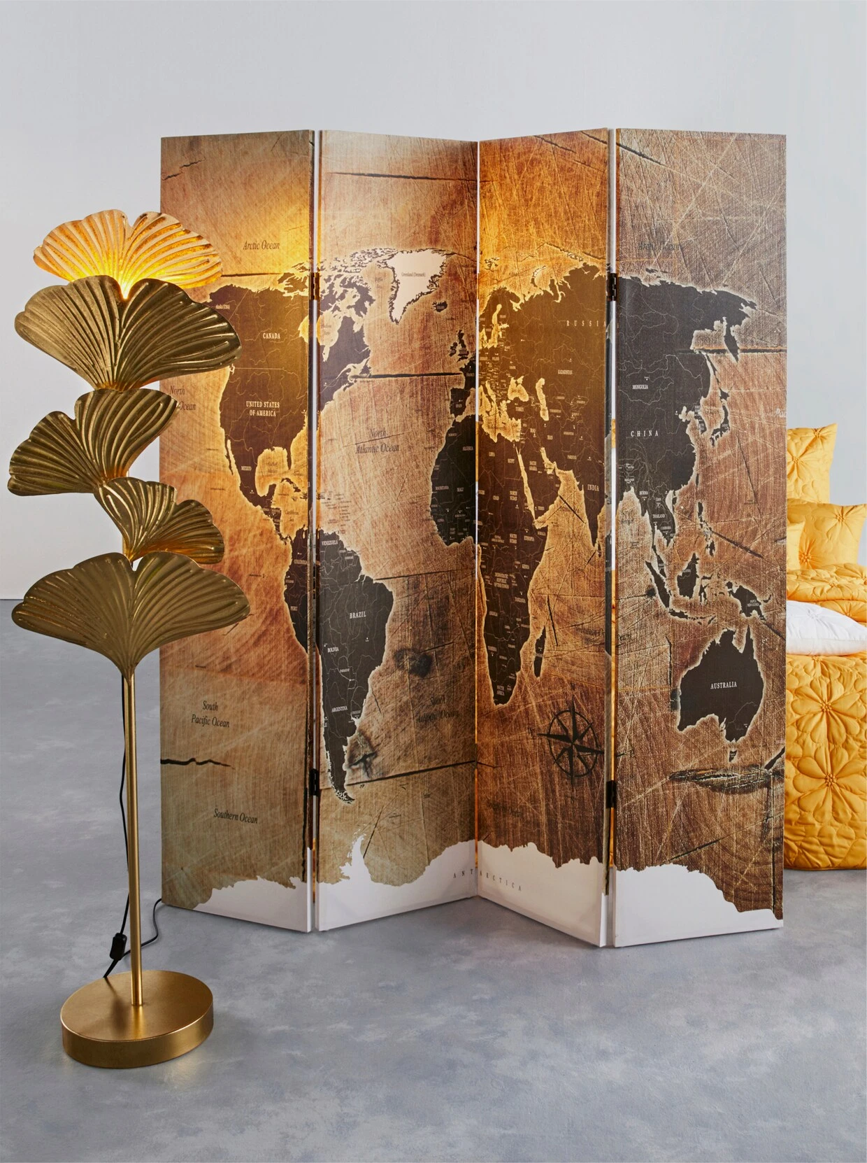 Standleuchte Aus Metall, goldfarben foliert und antikisiert. Zuleitung mit Zwischenschalter, L. ca. 208 cm. Fassung E27, max. 60 W. Ohne Leuchtmittel.