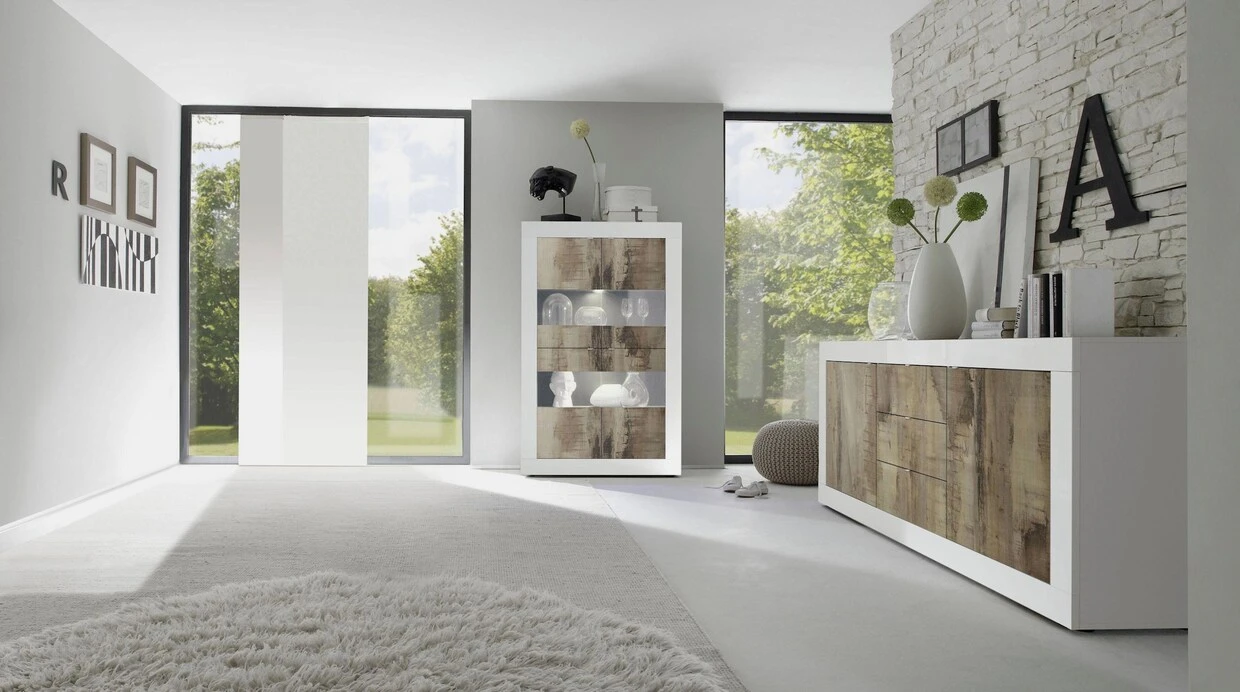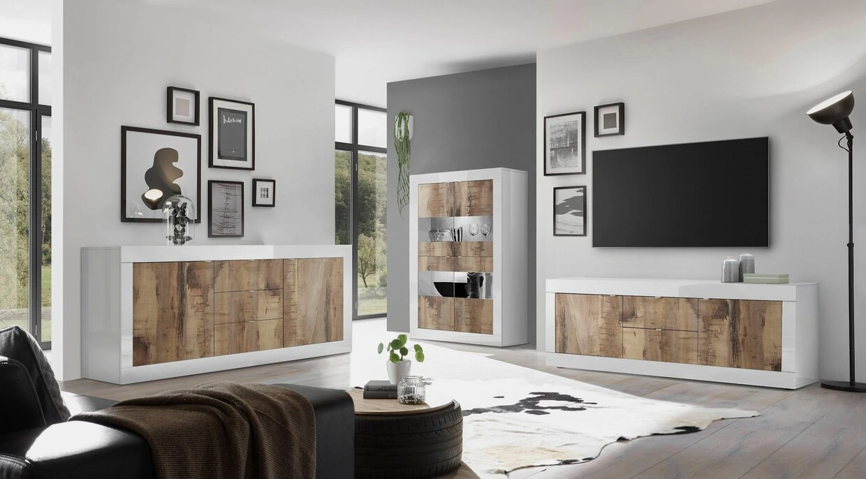 Sideboard Italian Design. FSC® -zertifizierter Holzwerkstoff. Korpus und Blenden teils weiß Hochglanz lackiert. Mit 2 Türen, dahinter 2 verstellbare Einlegeböden. 3 Schubkästen. Gesamt-H/B/T ca. 86/210/43 cm. Selbstmontage.
