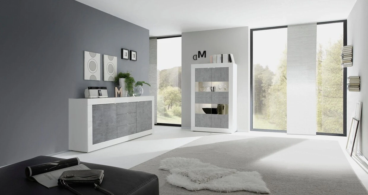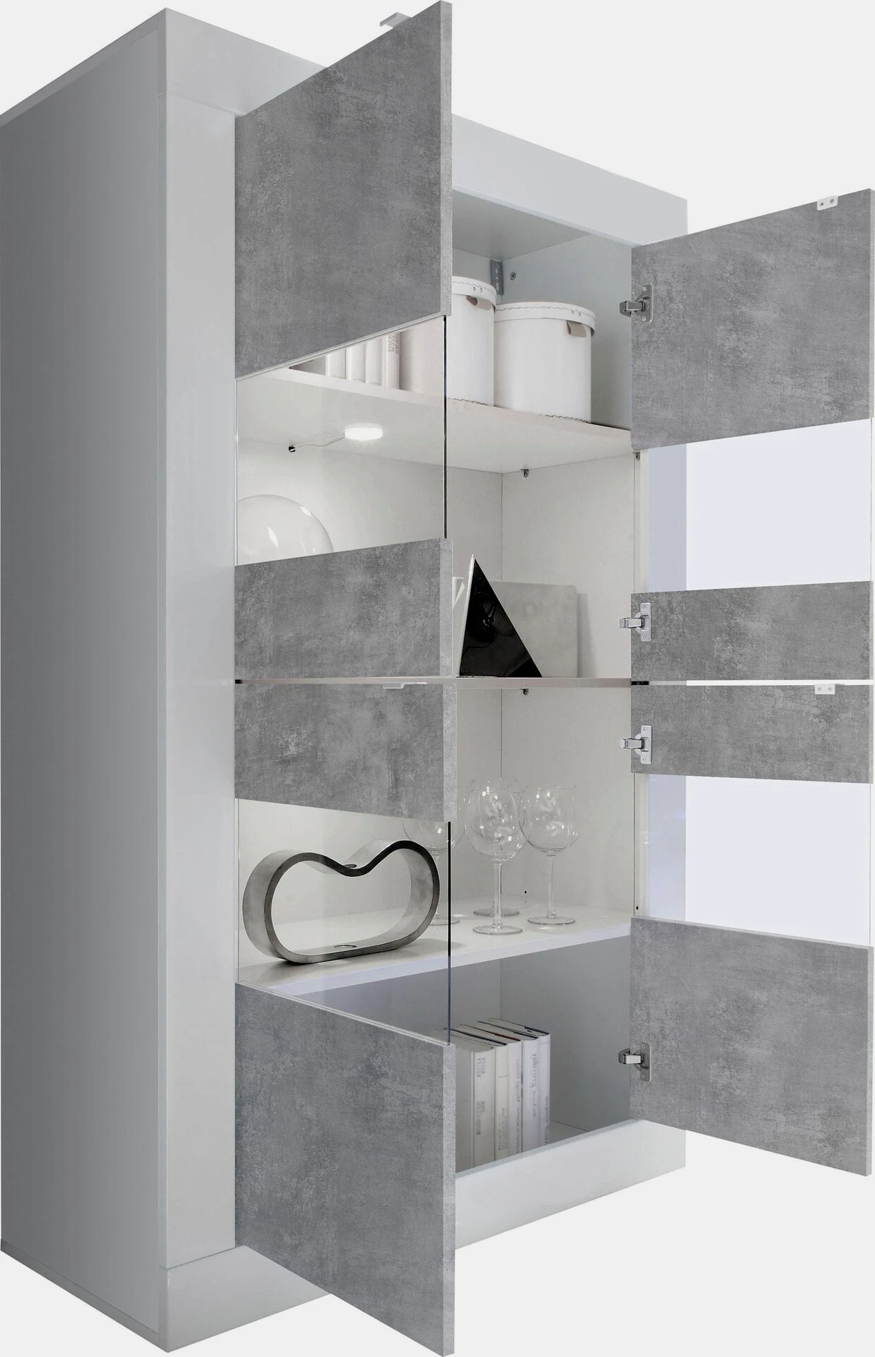 Stauraumvitrine Italian Design. FSC® -zertifizierter Holzwerkstoff. Korpus und Blenden teils weiß Hochglanz lackiert. Mit 4 Türen, 3 feste Einlegeböden. Gesamt-H/B/T ca. 162/102/43 cm. Selbstmontage.