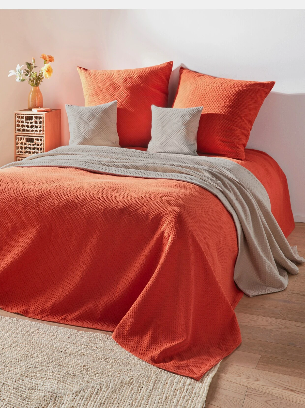 Tagesdecke Aufwendig gewebtes Rautenmuster. Kissenhülle mit verdecktem Reißverschluss. Maßinfos im Internet.